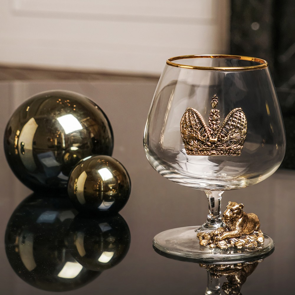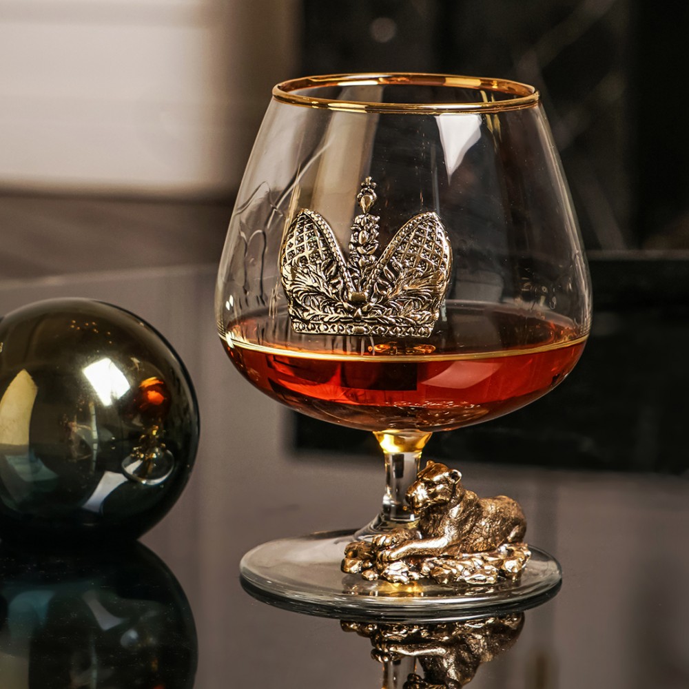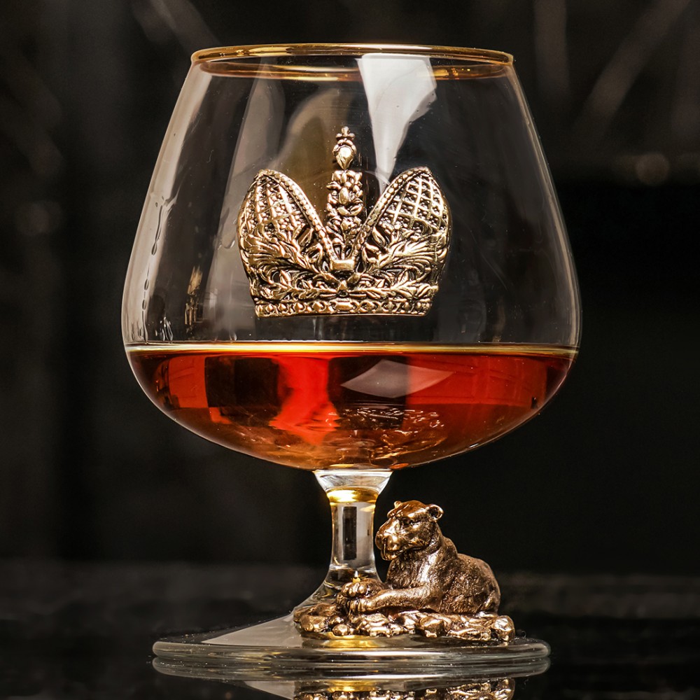Бокал для коньяка Шаранте Львица с накладкой Корона в ч/б картонной коробке