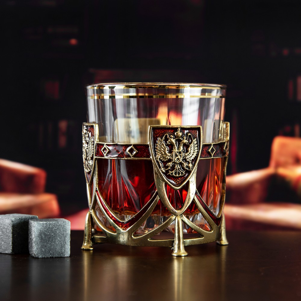 Бокал: стекло с золотым декорированием ,патинированная латунь ручная работа с эмалью,камни для виски (пищевой стеатит) | Размеры |