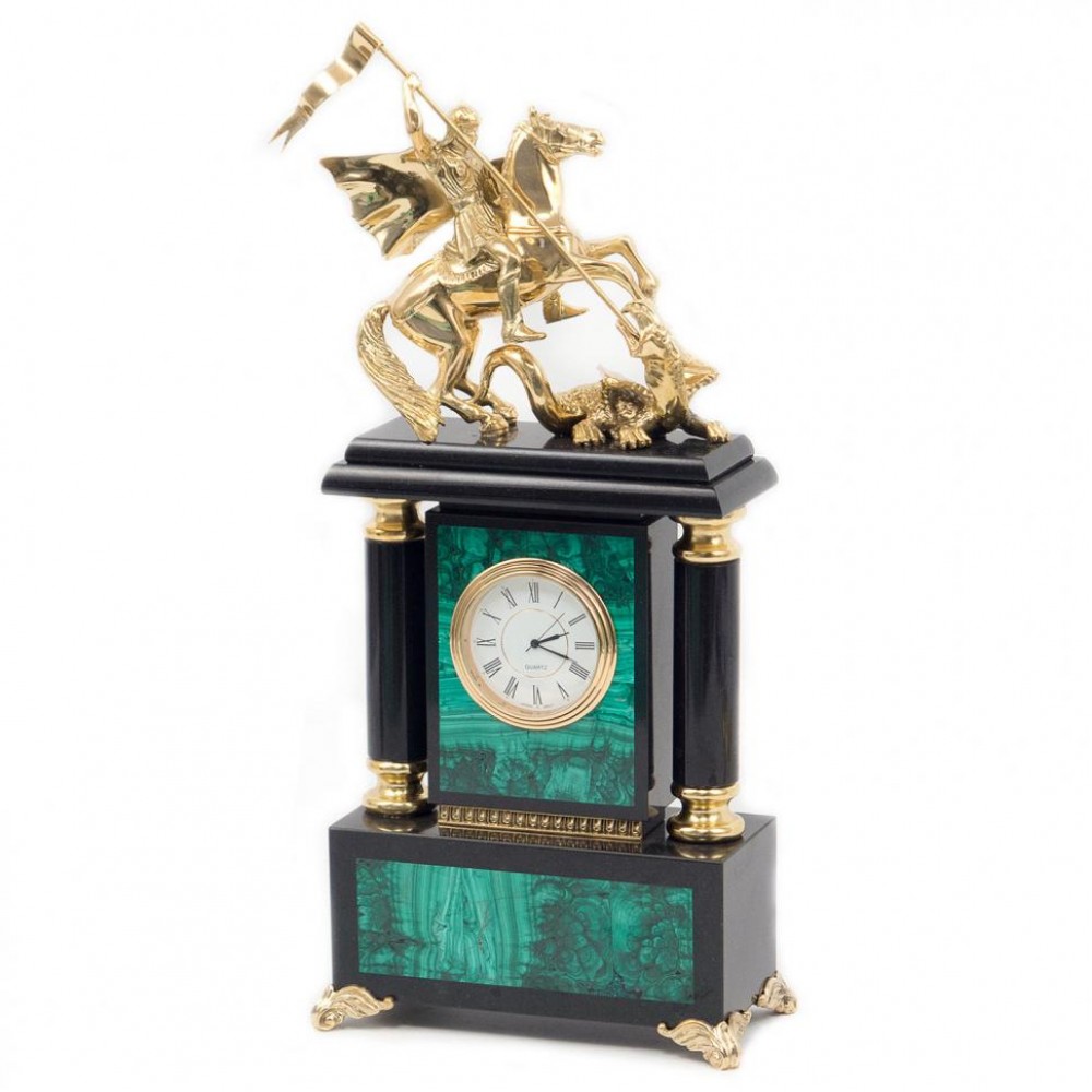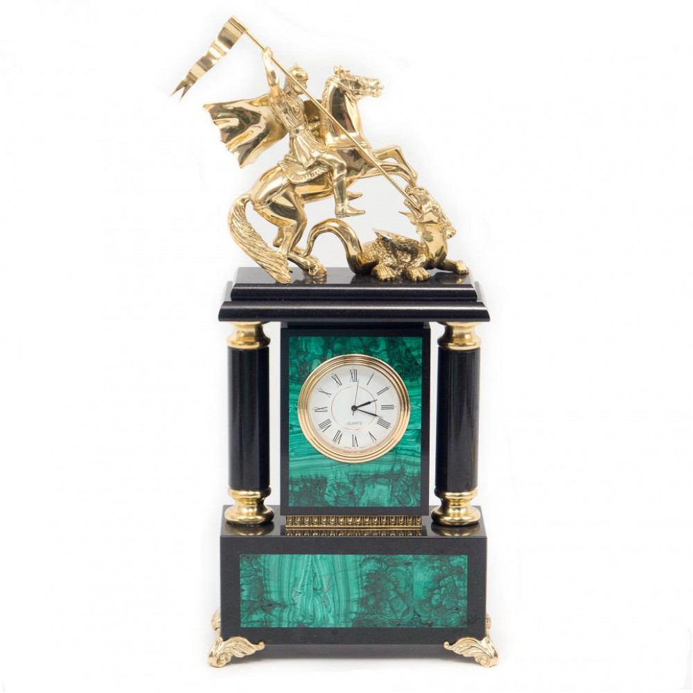 Часы из натурального малахита "Георгий Победоносец" размером 14х7,5х31 см и весом 2250 г.