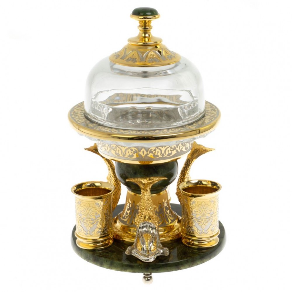 Икорница с тремя стопками "Три кита" нефрит размером икорница 14х14х25 см, объем 230 мл, рюмка 3,5х3,5х5 см, объем 30 мл. и весом 4760 г.