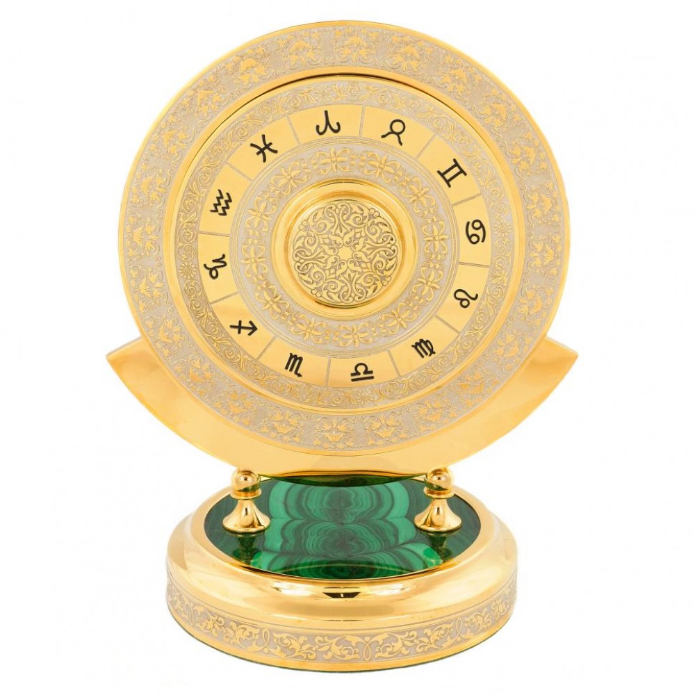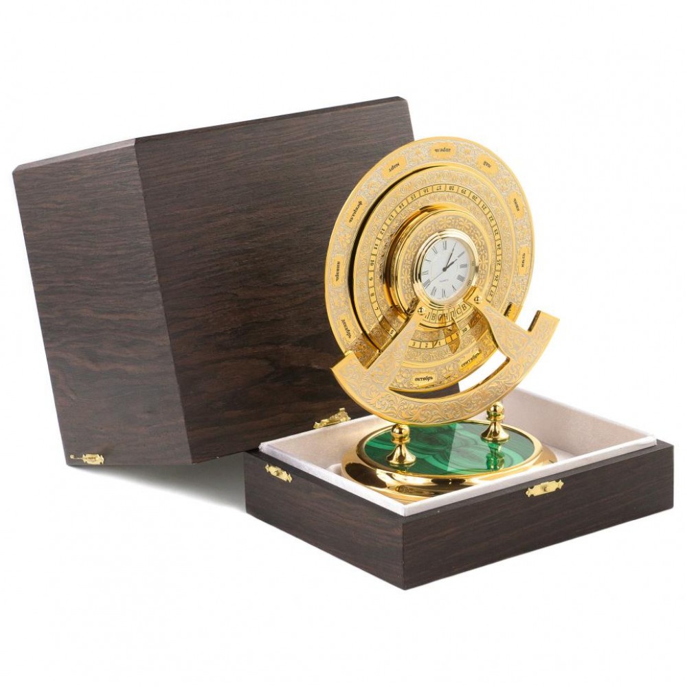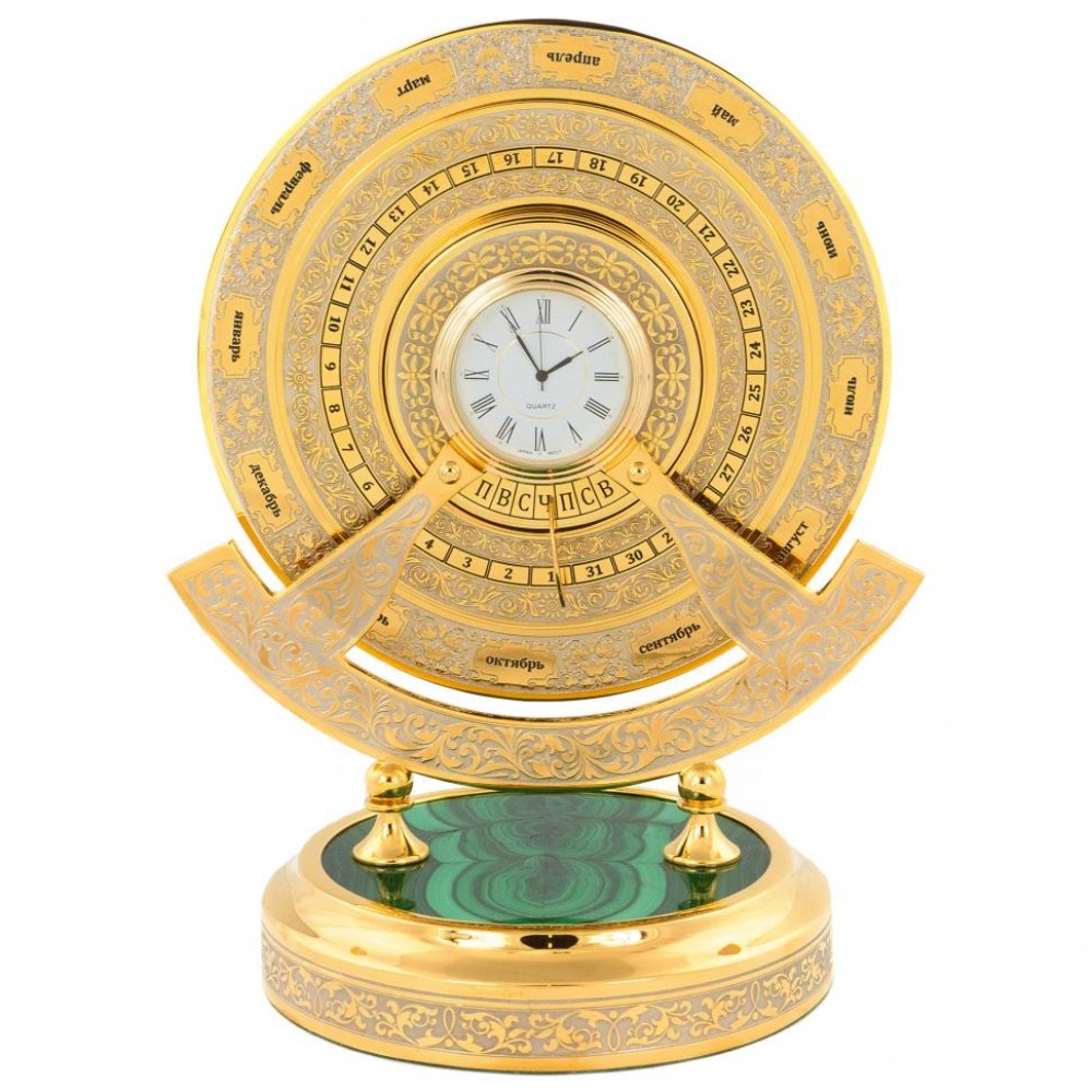 Часы «Вечный календарь» камень малахит Златоуст размером 19х14,5х25 см и весом 4750 г.