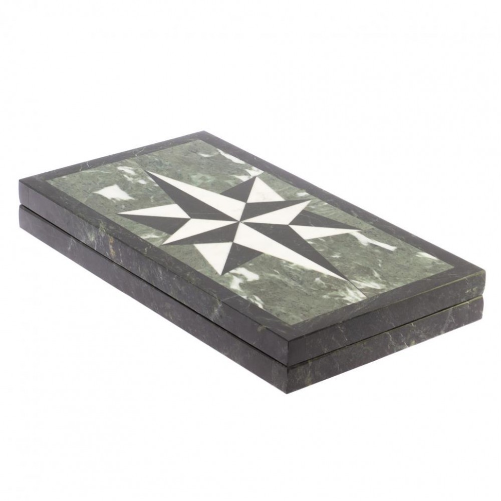 Каменные нарды "Роза ветров" белый мрамор / черный змеевик размером 48х44х2,5 см и весом 9000 г.