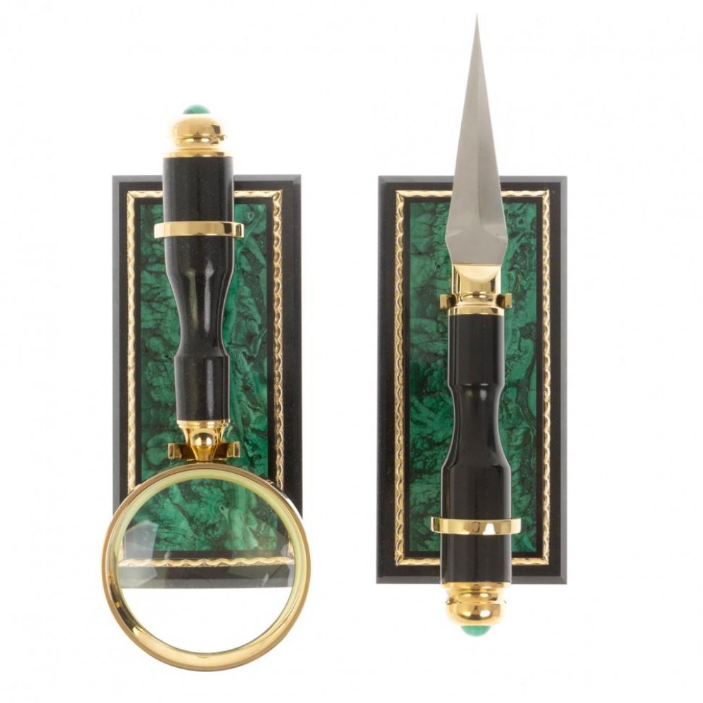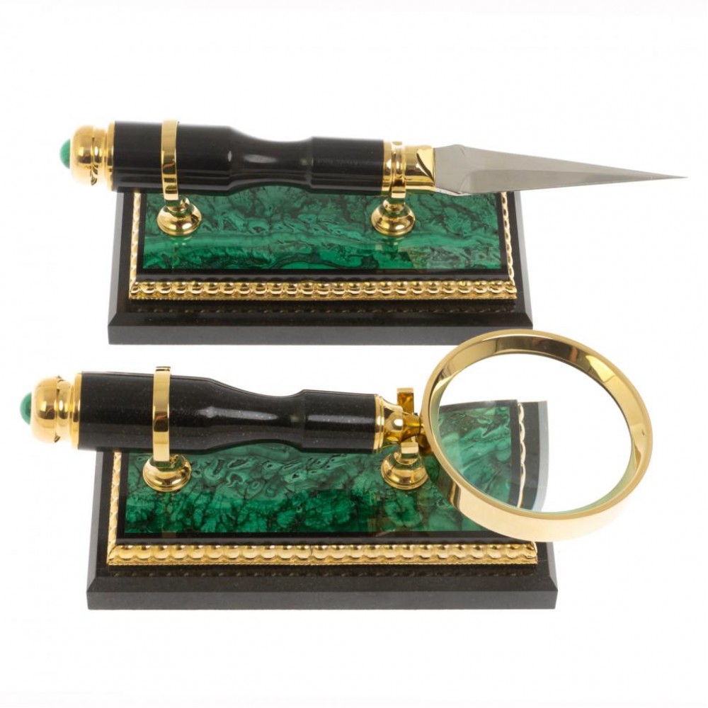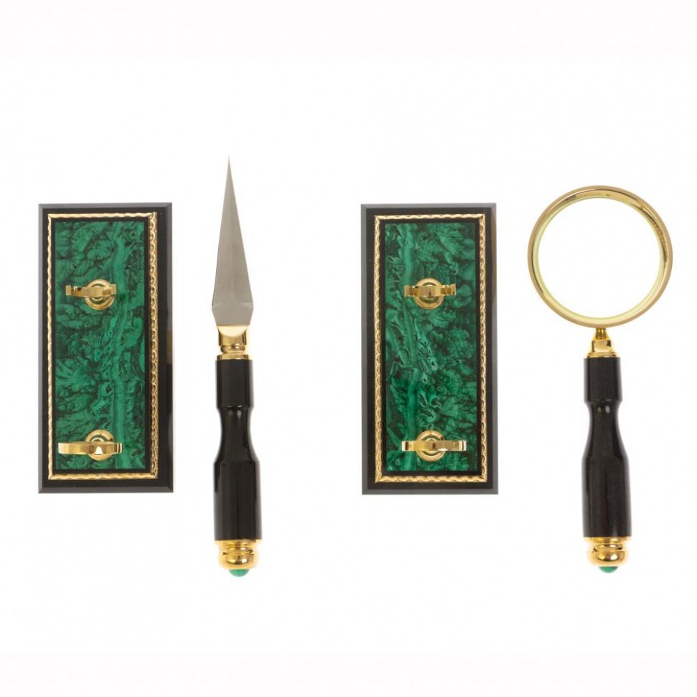 Канцелярский набор лупа и нож "Малахит" в подарочной коробке Златоуст размером лупа 18,5х6,5 см, нож 3,5х6,5 см, подставка 15х7х8 см и весом 3500 г.