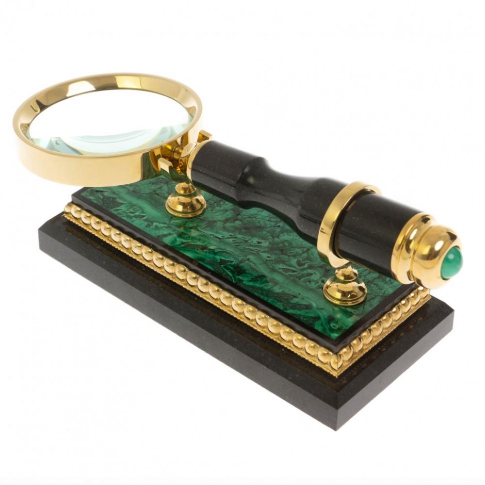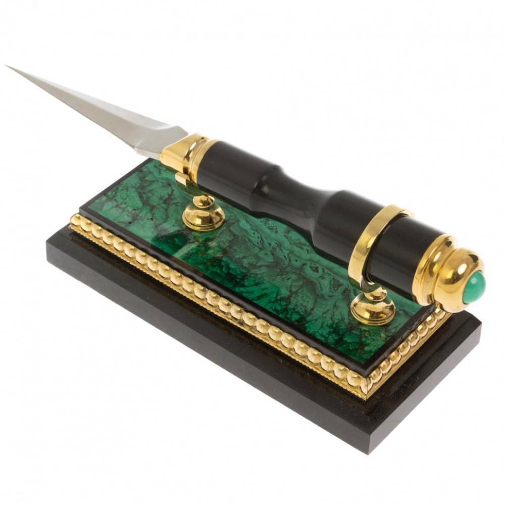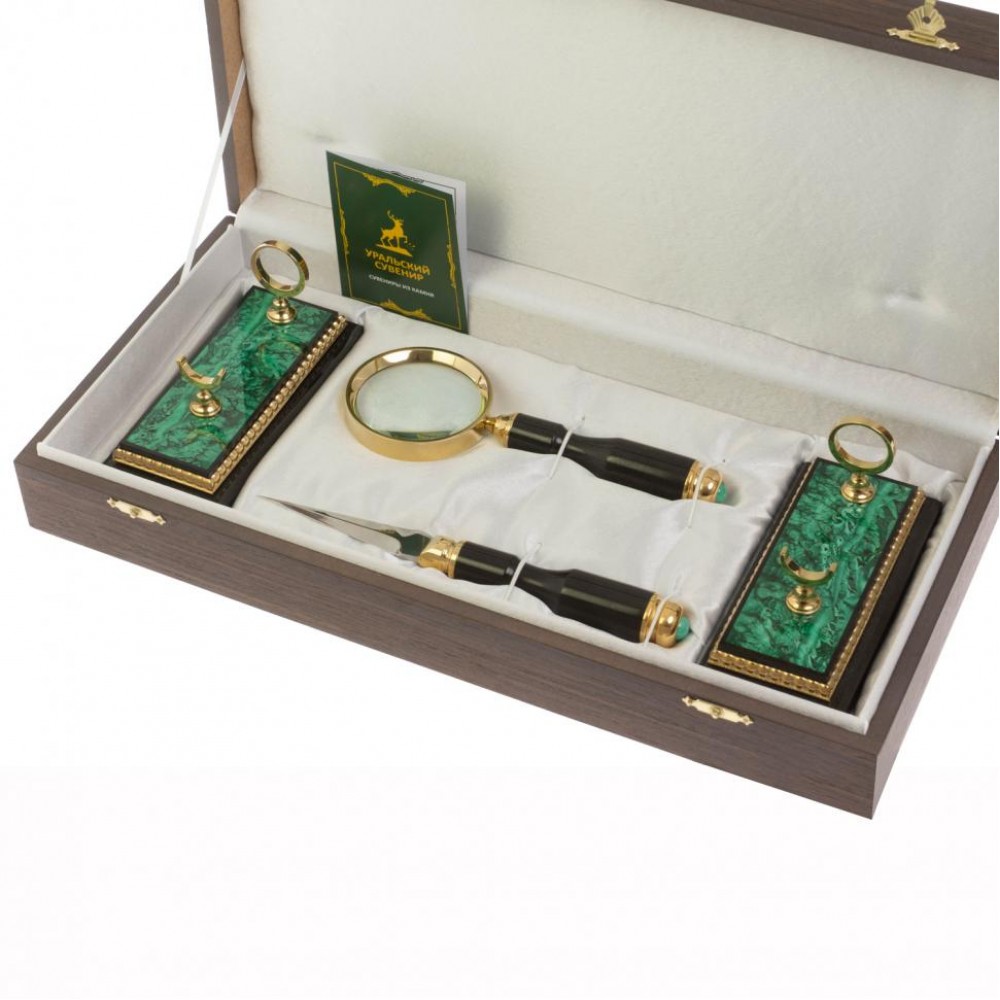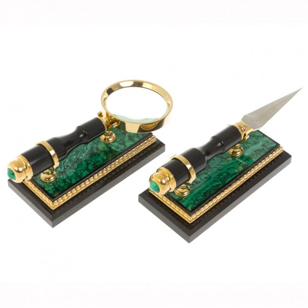 Канцелярский набор лупа и нож "Малахит" в подарочной коробке Златоуст размером лупа 18,5х6,5 см, нож 3,5х6,5 см, подставка 15х7х8 см и весом 3500 г.