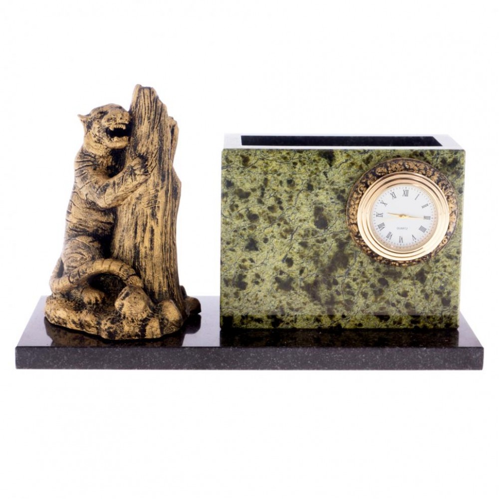 Карандашница с часами "Амурский тигр" камень змеевик размером 20х8,5х12 см и весом 2900 г.