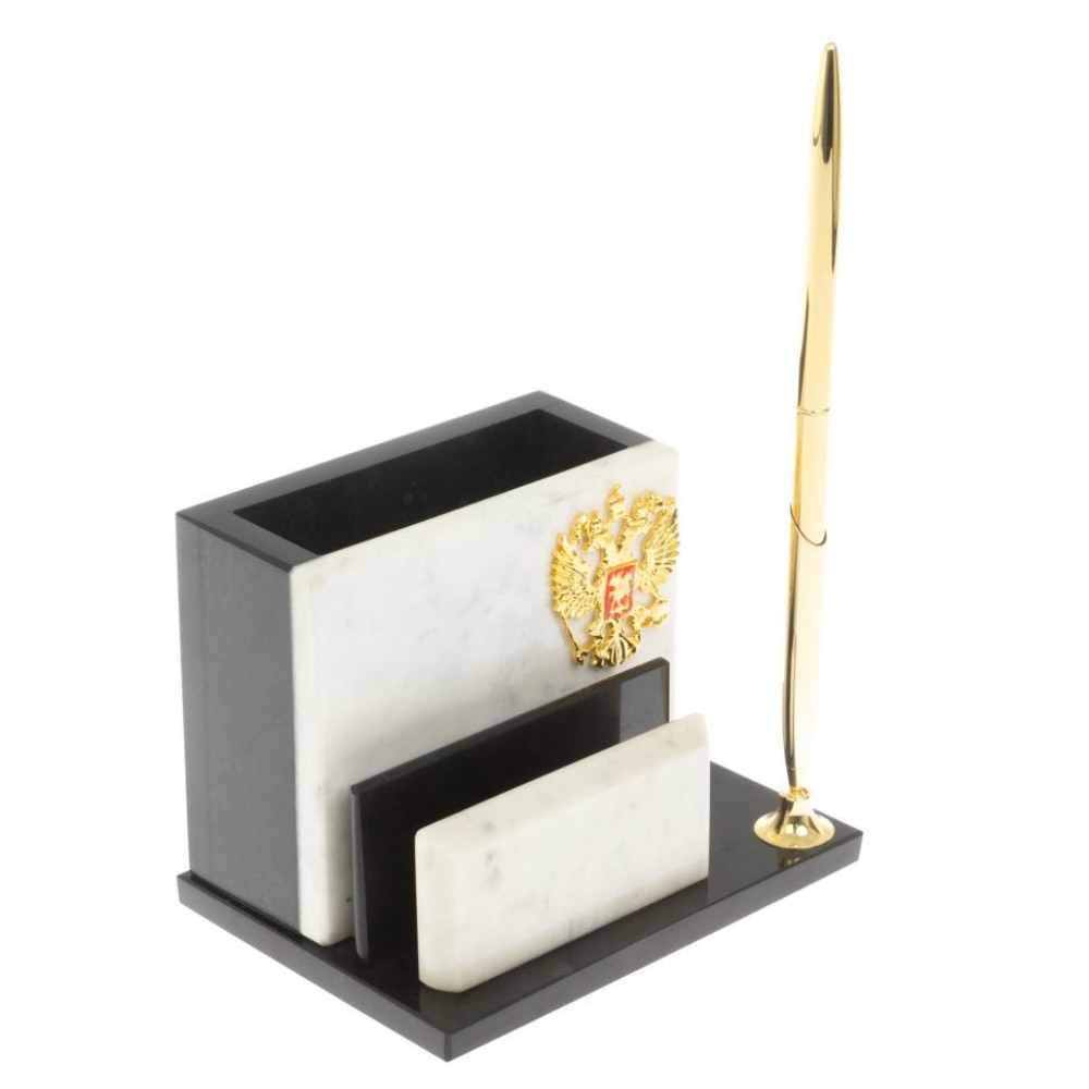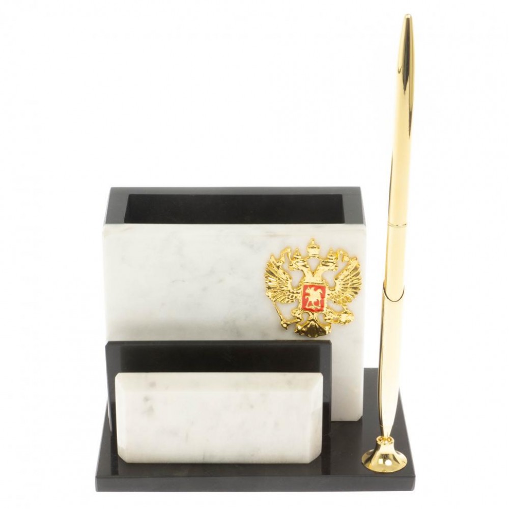 Карандашница с визитницей из белого мрамора размером 12х9х9 см и весом 700 г.