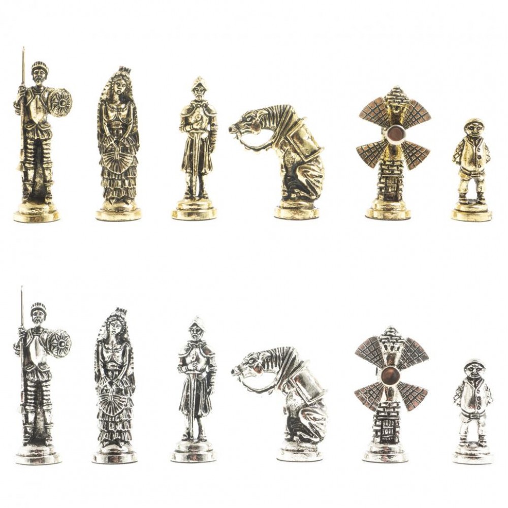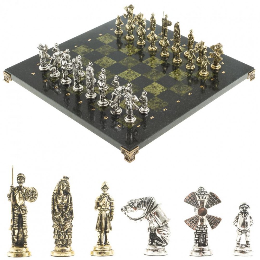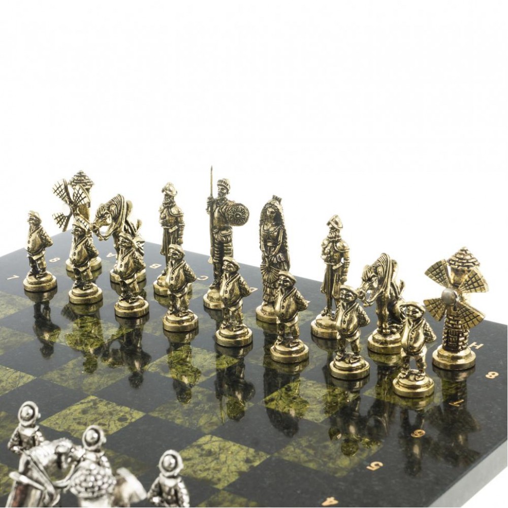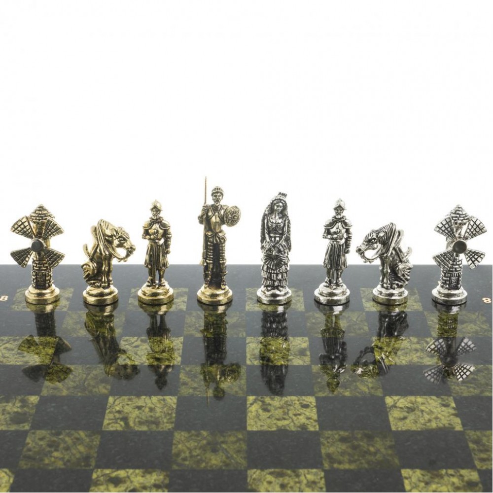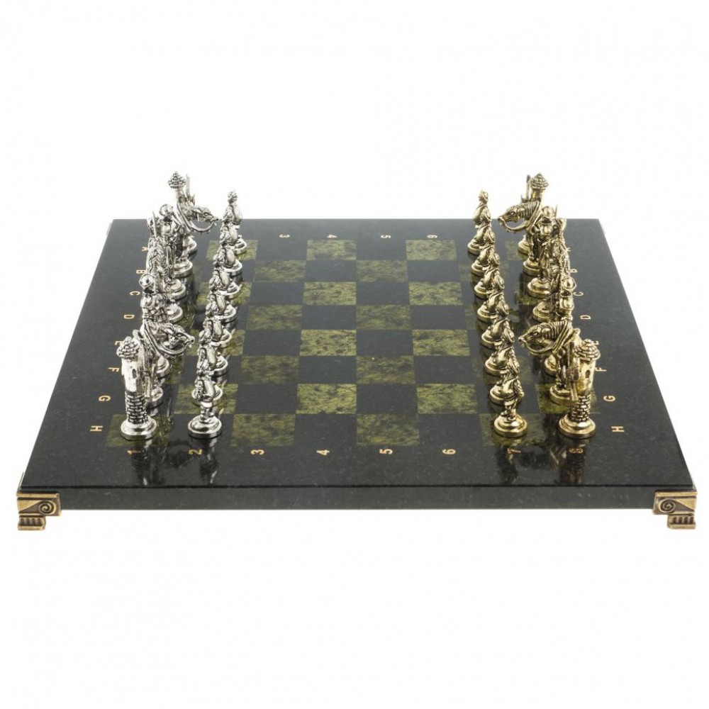 Шахматы изготовлены вручную из натурального змеевика, фигурки металлические в цвете золото и серебро, имеют размеры: доска 36х36х2,5 см, клетка 3,5х3,5 см, высота фигур: пешка 4,5 см, король 7,5 см и весят 7500 г.