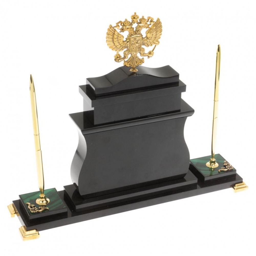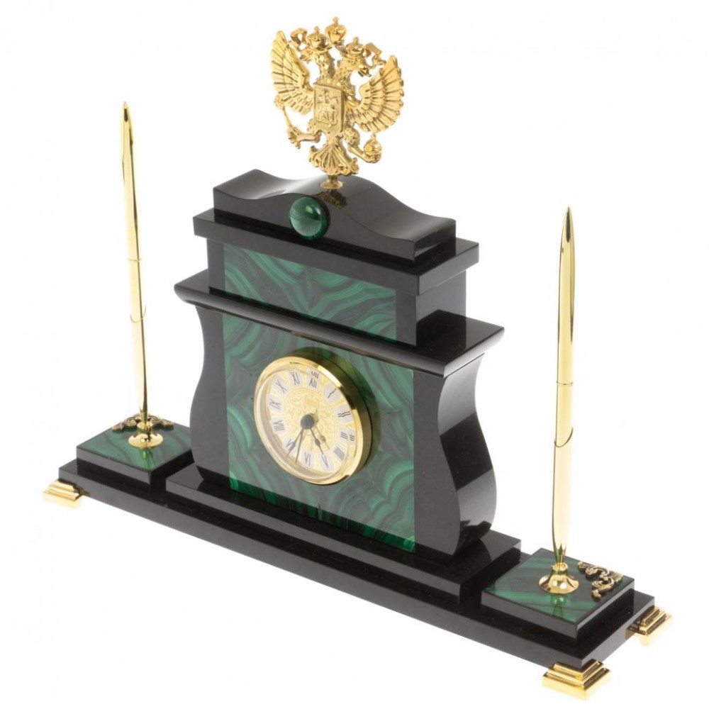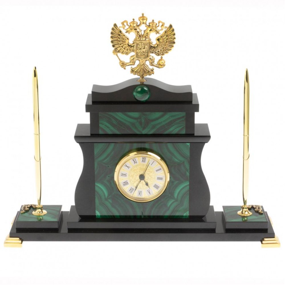 Настольные часы "Герб России" с ручками из малахита размером 33х7,5х29 см и весом 3650 г.