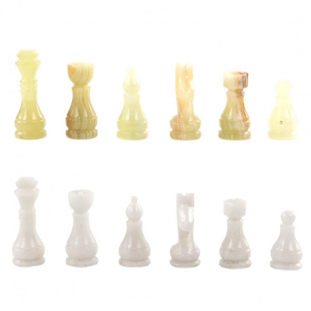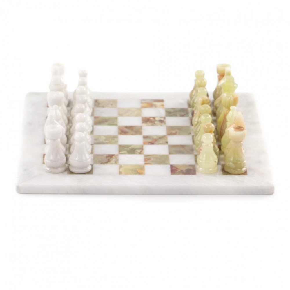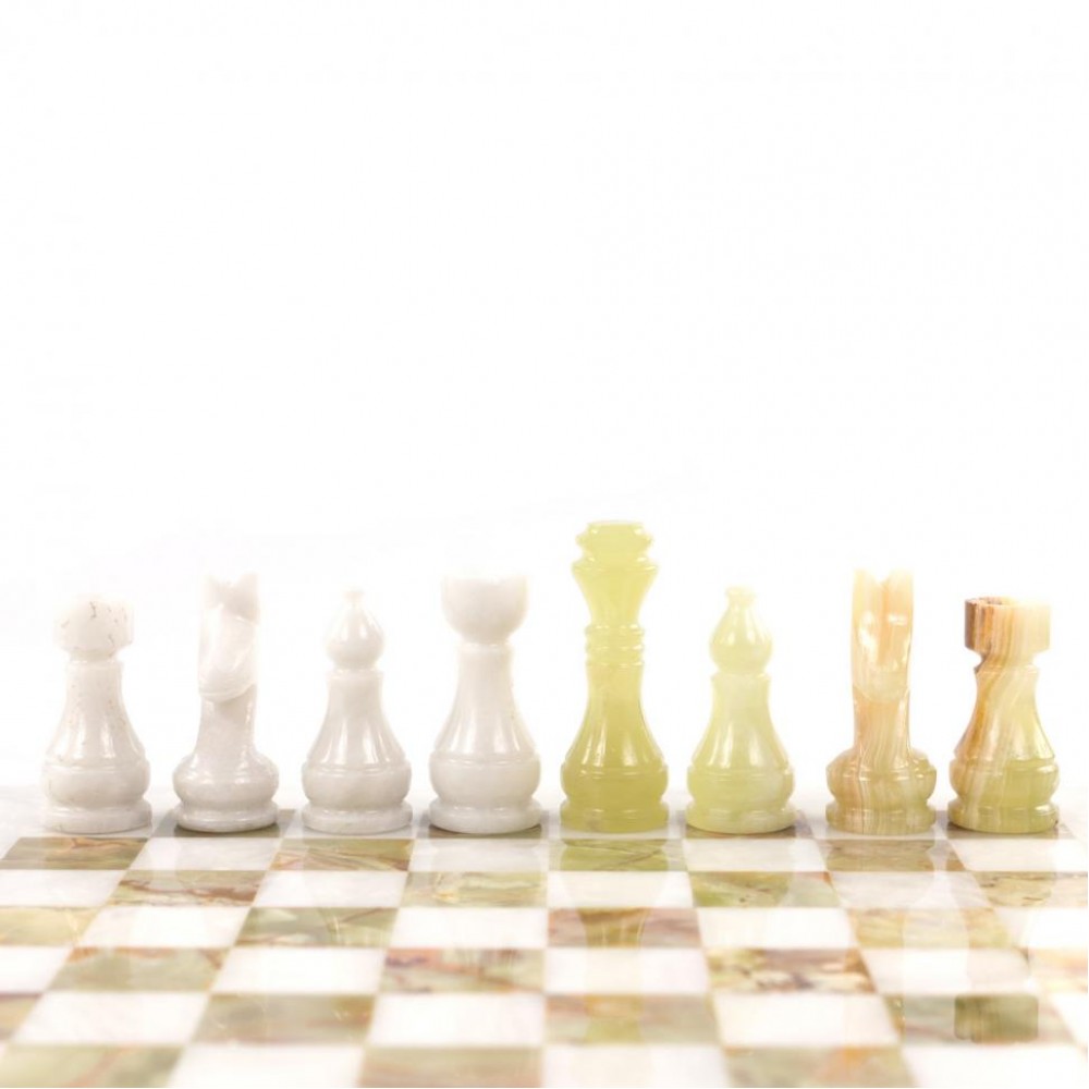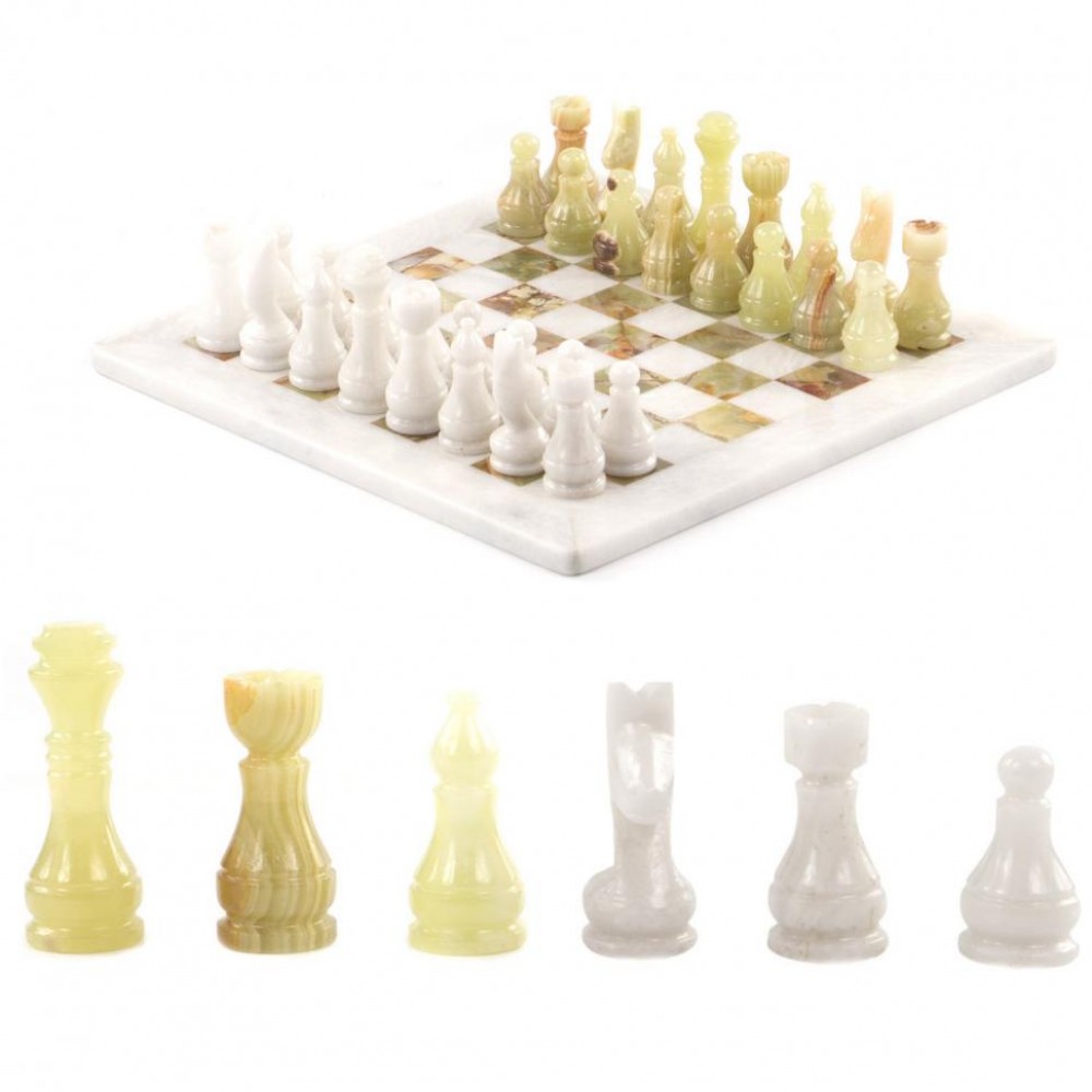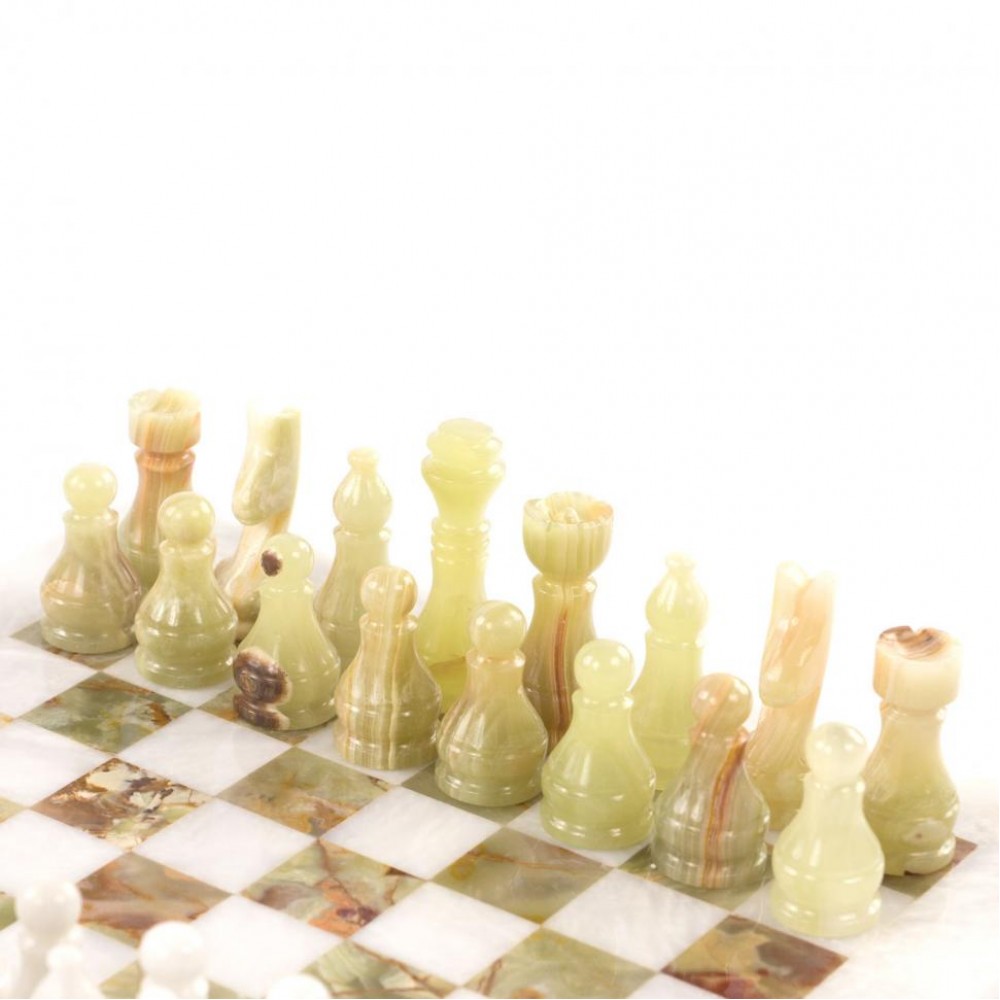 Шахматы изготовлены вручную из природного зеленого оникса и белого мрамора, имеют размеры доски 30х30 см и весят 5000 г.