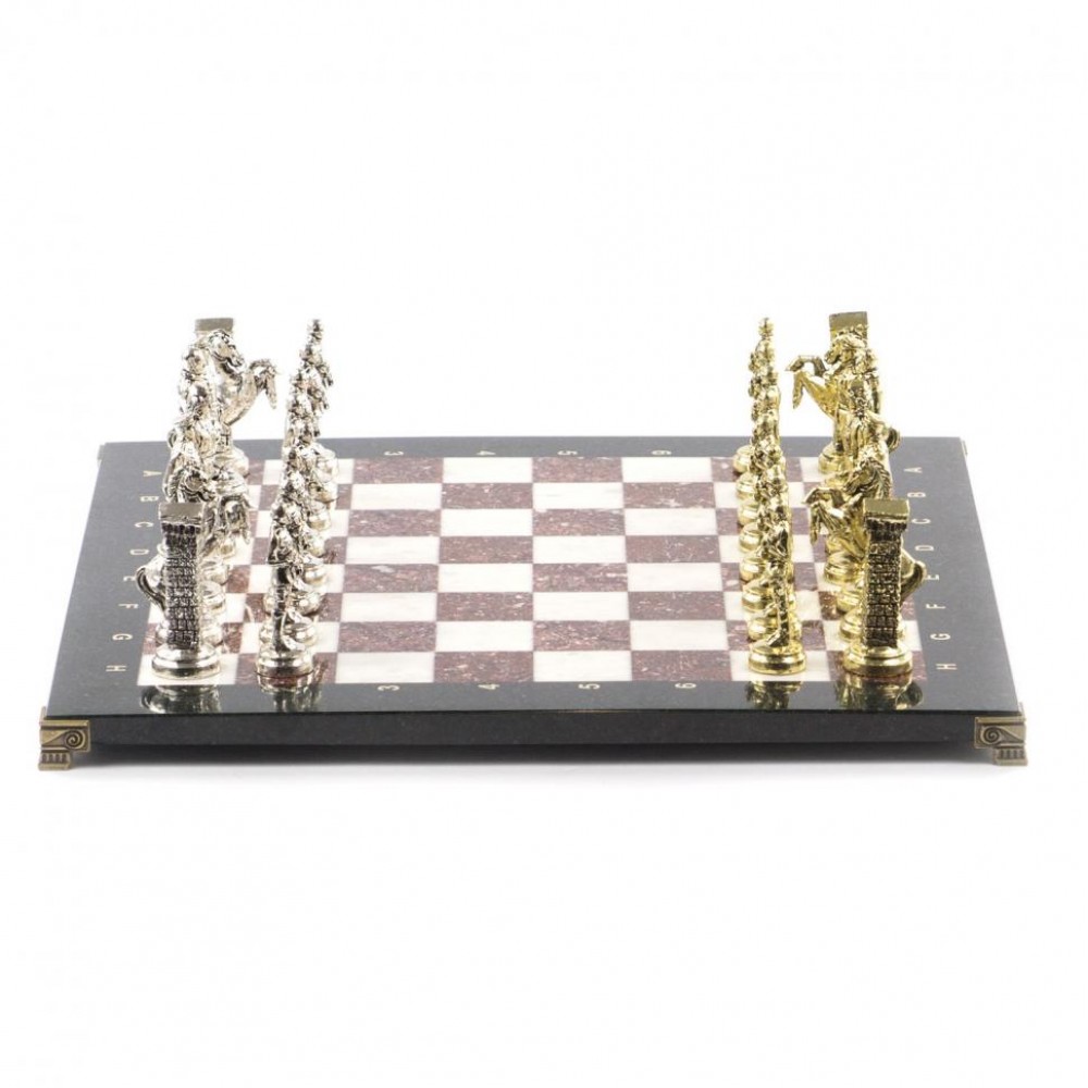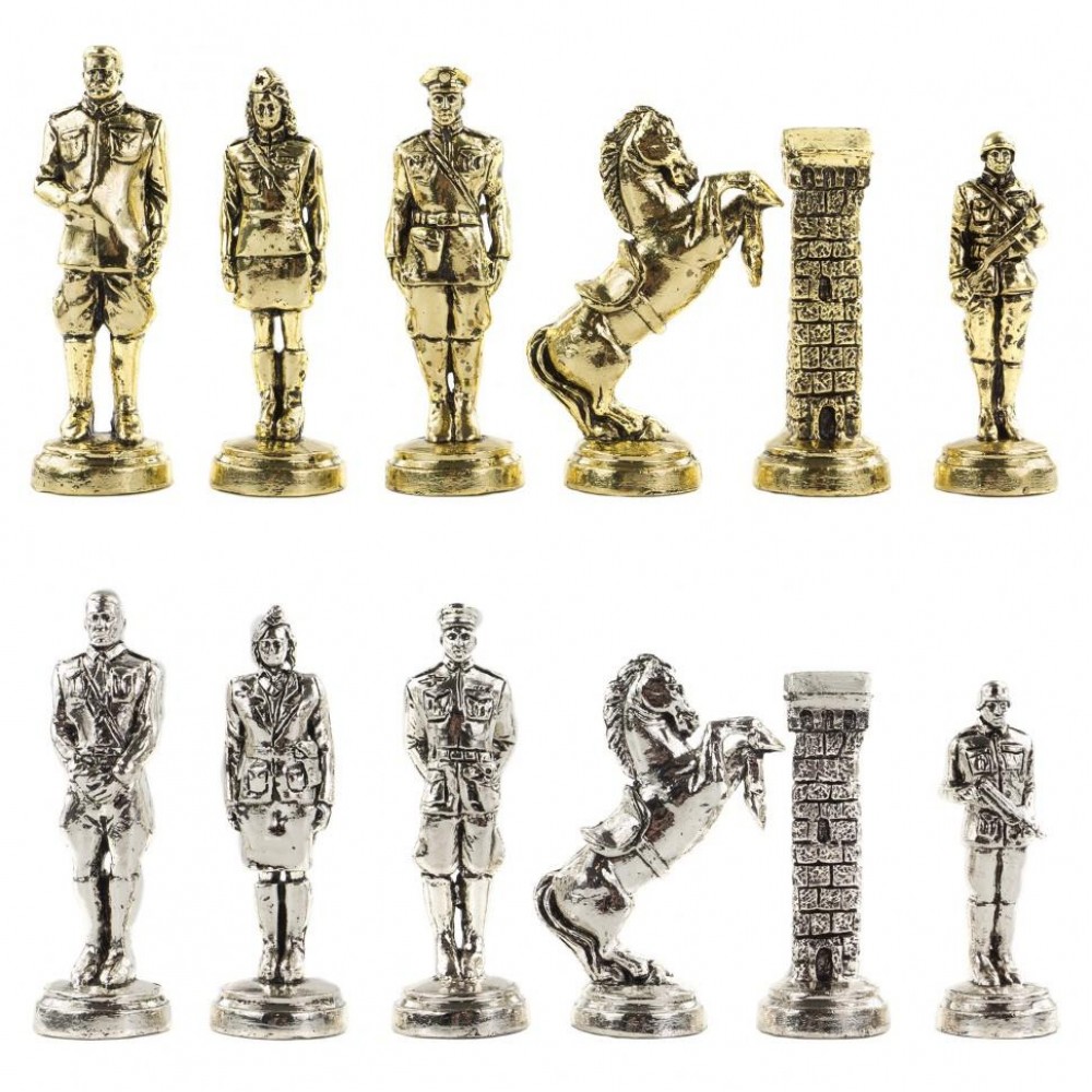 Эксклюзивные исторические шахматы – новинка в нашем интернет-магазине. Шахматные фигуры в золотом цвете – советские войска во главе Иосифом Сталиным, с другой стороны в серебряном цвете – немецкие войска во главе с Адольфом Гитлером. Фигуры из металла с высоким уровнем детализации игровых персонажей. В комплекте подарочный футляр из экокожи. Доска изготовлена из поделочных камней: змеевика и мрамора.