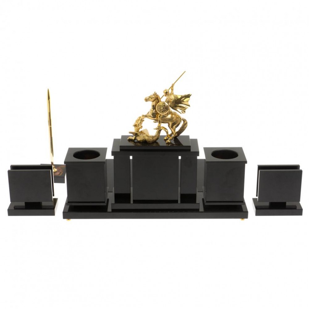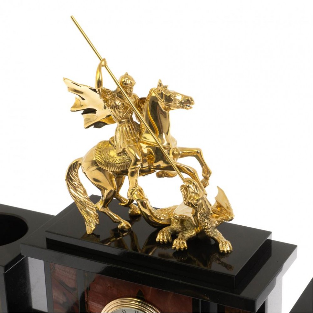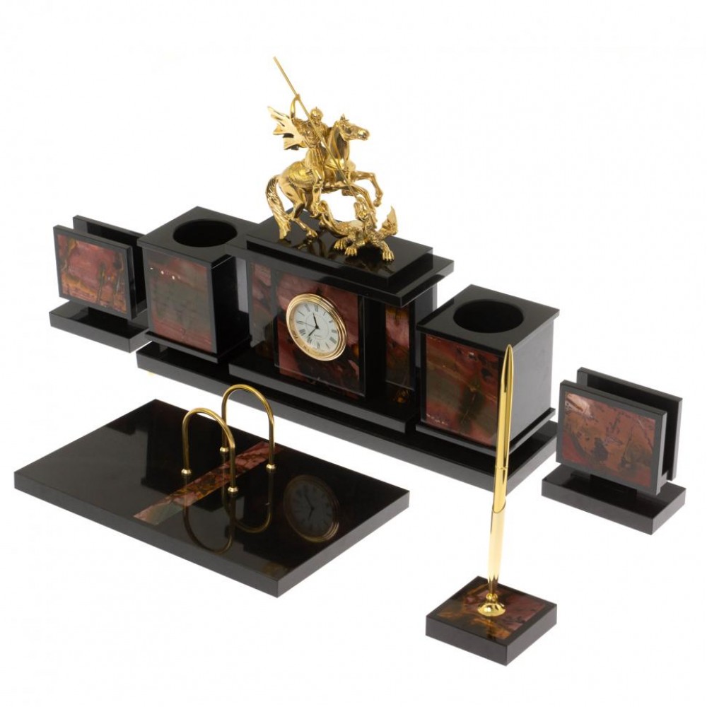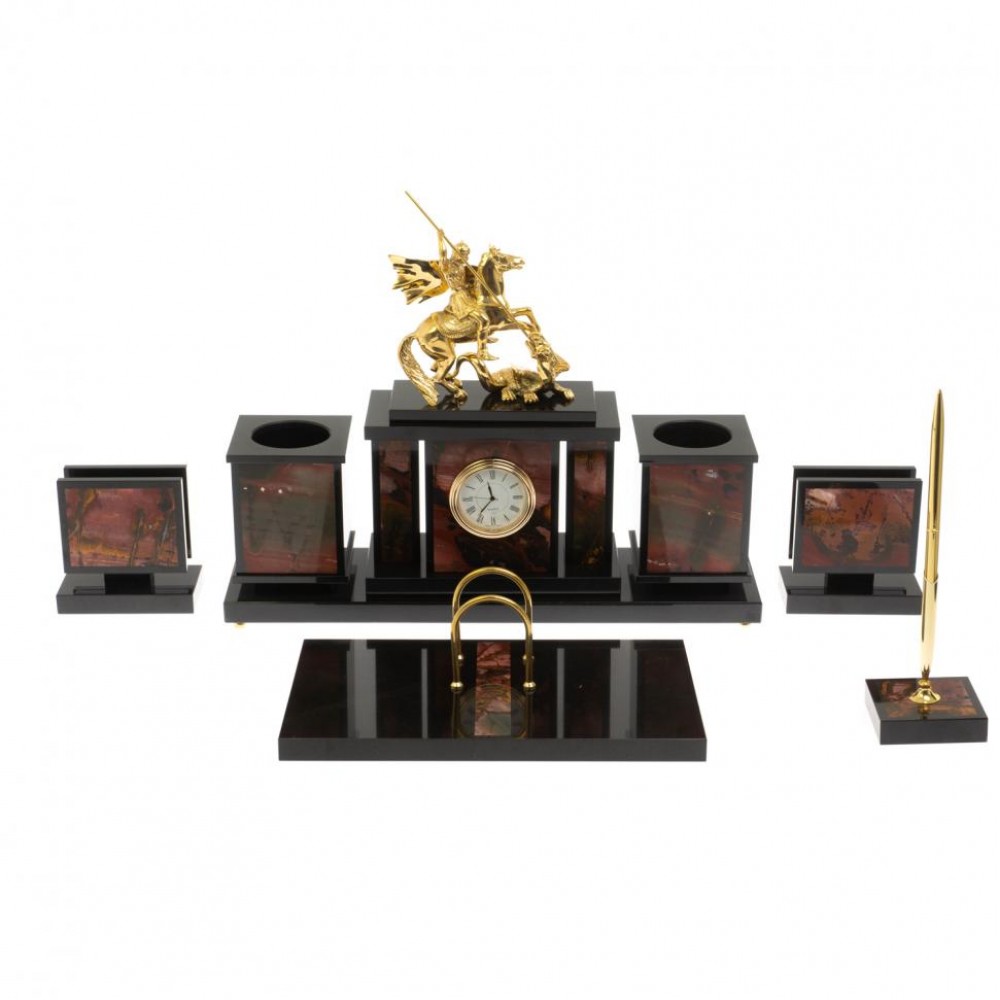 Настольный набор "Георгий Победоносец" из яшмы размером центральная часть 35х9х29 см, подставка под календарь 24х16х1,5 см, визитница 9х5х9 см, подставка под ручку 6х6х20 см и весом 6400 г.