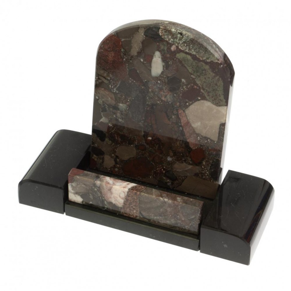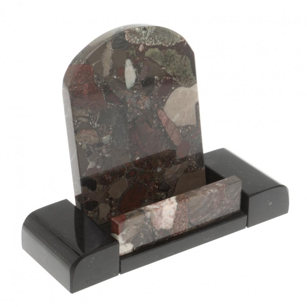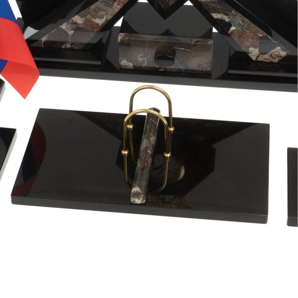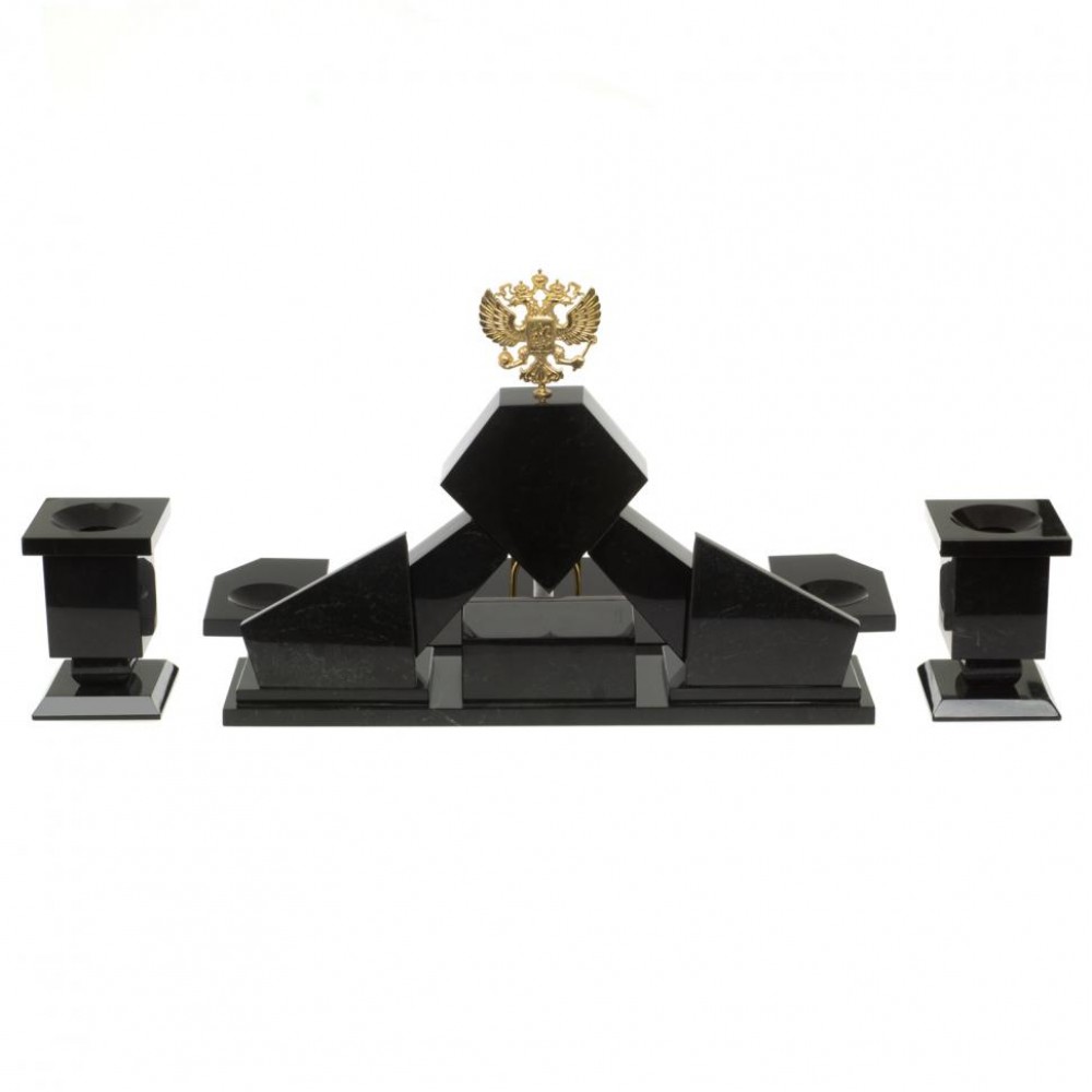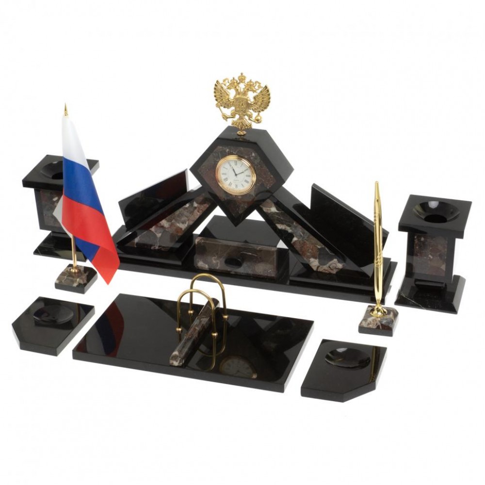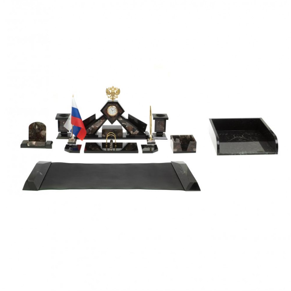Настольный набор "Герб" из конгломерата с бюваром и лотком А4 размером часы 40,5х9,5х31 см, календарница 26,5х15х3 см, лоток 31,5х24х7 см, бювар 80х42,5х1,5 см, карандашница 8х8х12 см, кубарик 11х11х5,5 см, подставка для телефона 15х5,5х11,5 см, флагшток 4,5х4,5х26 см, подставка под ручку 4,5х4,5х18 см и весом 15000 г.
