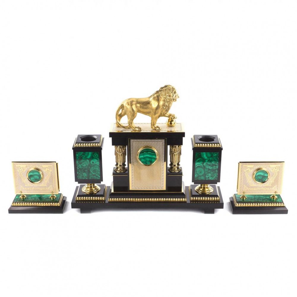 Настольный набор изготовлен из камня, имеет размеры часы 36х10х30 см, визитница 13х7х12,5 см, календарница 27х19х3 см, нож 24х3х2 см, лупа 20х7х2 см. и весит 27 кг.