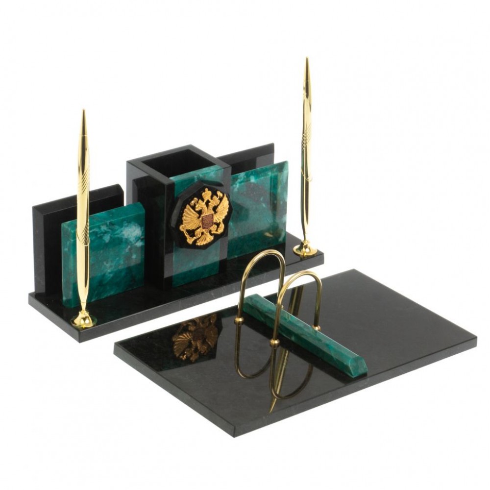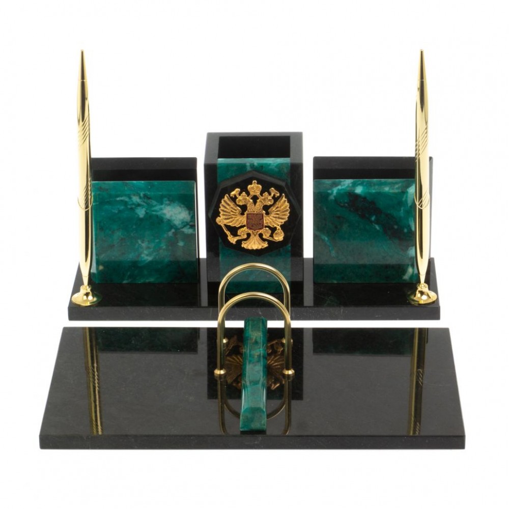 Настольный набор "Офисный" с гербом РФ камень змеевик размером центр 26х8,5х11 см, подставка под календарь 26х15х3 см и весом 3450 г.