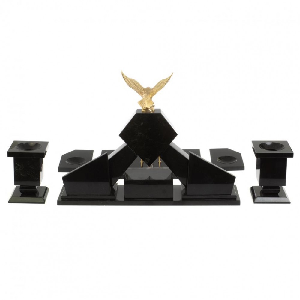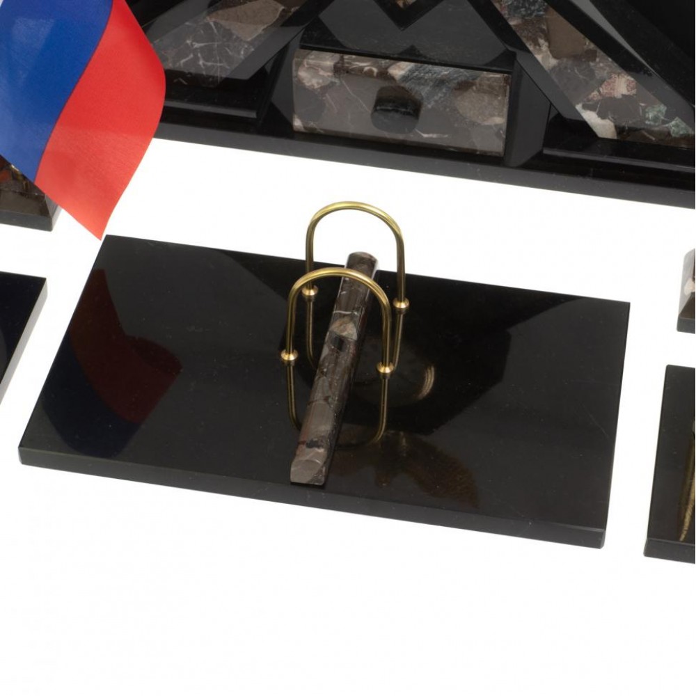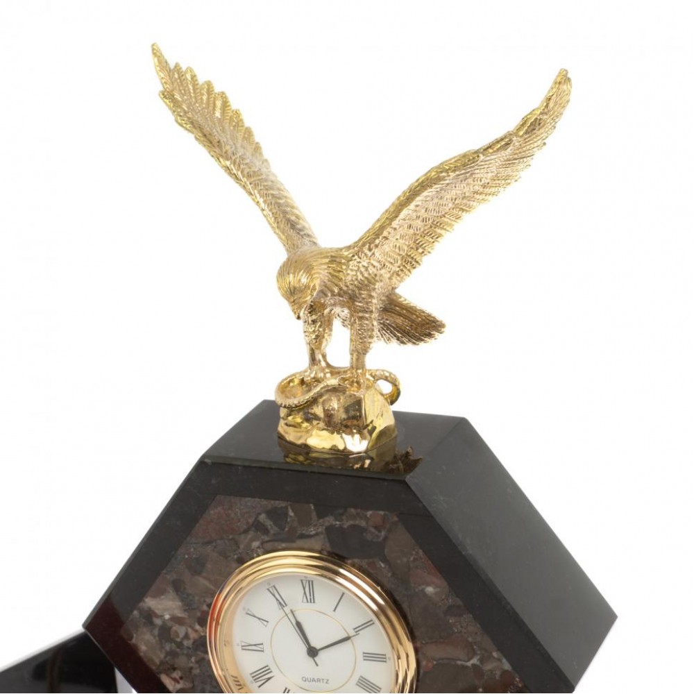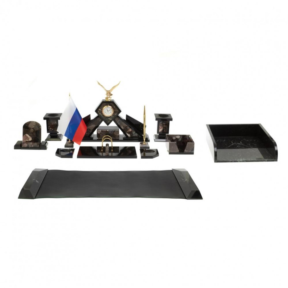 Настольный набор "Орел" из конгломерата с бюваром и лотком А4 размером часы 40,5х9,5х31 см, календарница 26,5х15х3 см, лоток 31,5х24х7 см, бювар 80х42,5х1,5 см, карандашница 8х8х12 см, кубарик 11х11х5,5 см, подставка для телефона 15х5,5х11,5 см, флагшток 4,5х4,5х26 см, подставка под ручку 4,5х4,5х18 см и весом 15000 г.