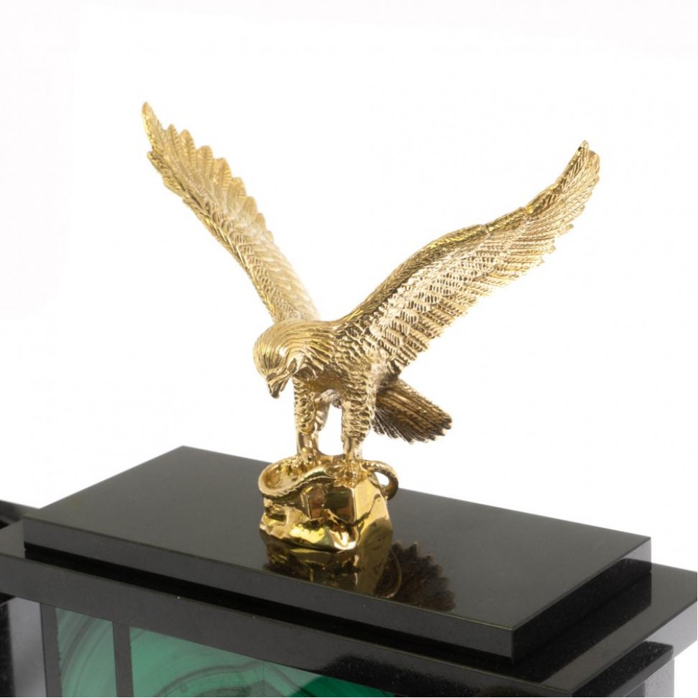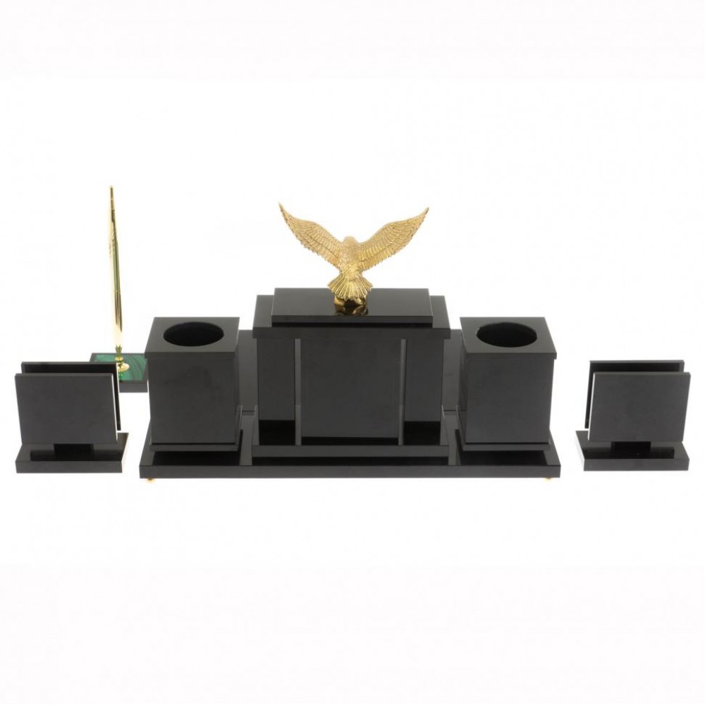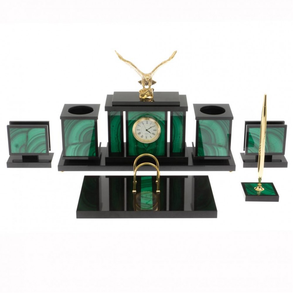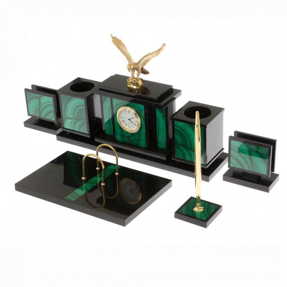 Настольный набор "Орел" из малахита размером центральная часть 34х9х30 см, календарница 24х16х1,5 см, визитница 9х5,5х5,5 см, подставка под ручку 5х5х21 см и весом 18000 г.