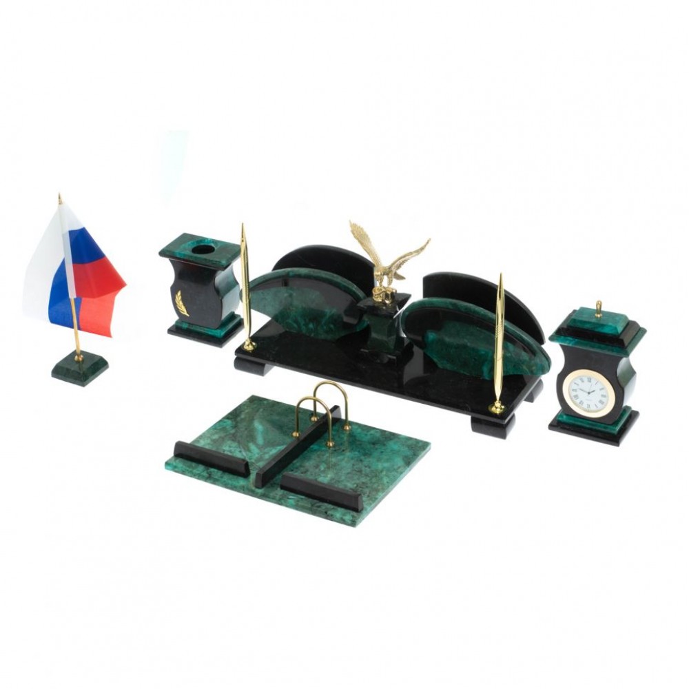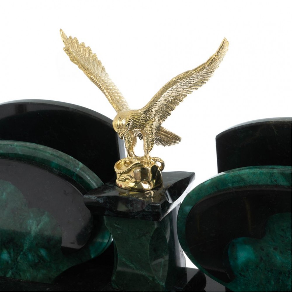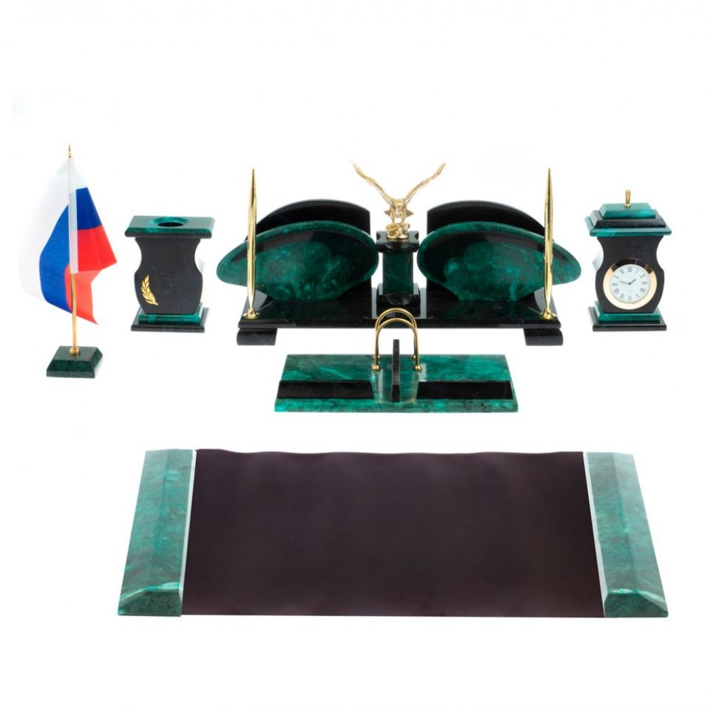 Настольный набор "Орел" из змеевика с бюваром размером центральная часть 44х12,5х19,5 см, часы 10,5х7х16,5 см, стакан 10,5х17х13 см, календарница 25,5х20,5х4 см, лоток для мелочей 9х9х3,5 см, флагшток 6х6х26 см, бювар 80х42,5х1,5 см и весом 10500 г.