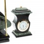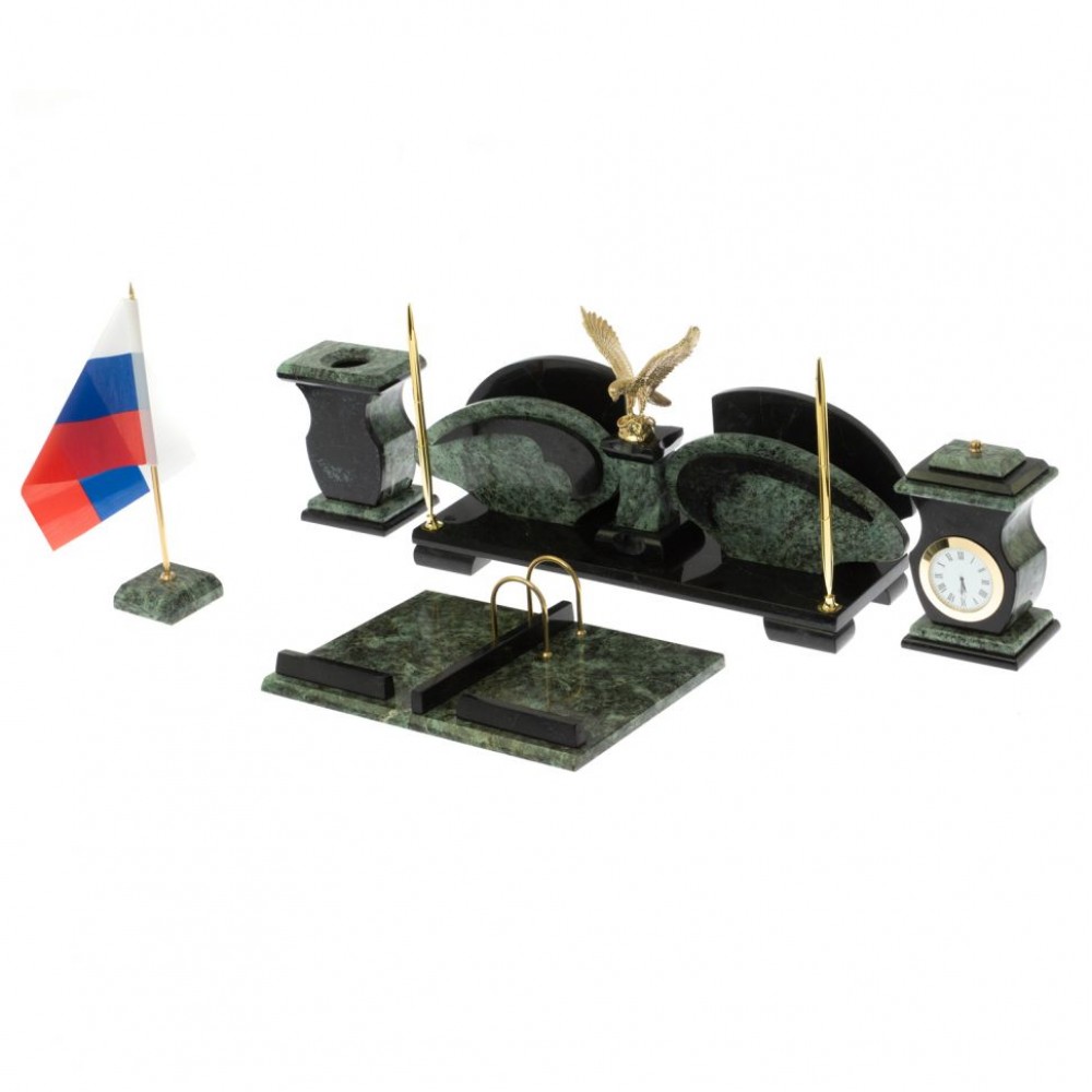 Настольный набор "Орел" из змеевика с бюваром размером центральная часть 44х12,5х19,5 см, часы 10,5х7х16,5 см, стакан 10,5х17х13 см, календарница 25,5х20,5х4 см, лоток для мелочей 9х9х3,5 см, флагшток 6х6х26 см, бювар 80х42,5х1,5 см и весом 10500 г.
