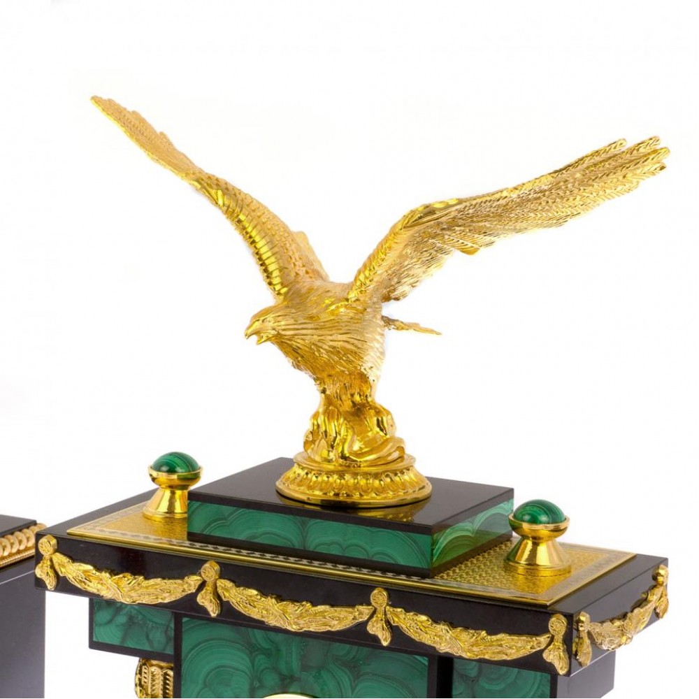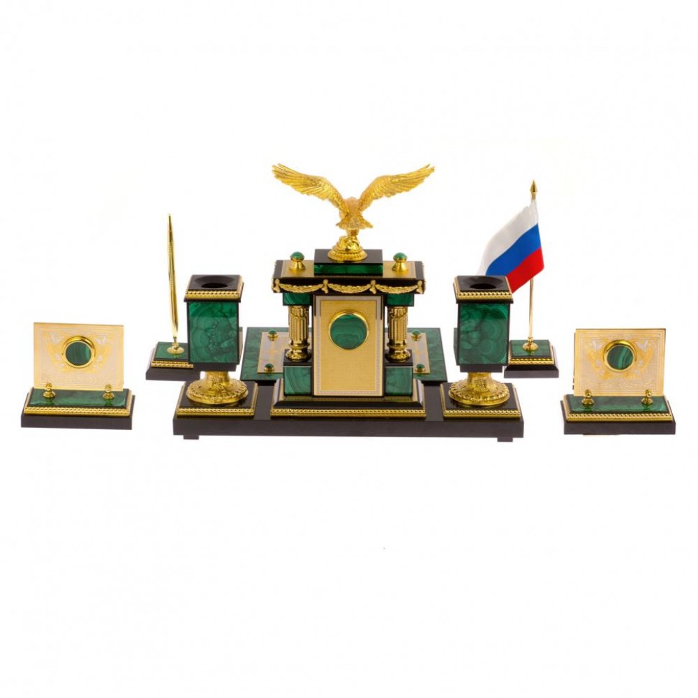 Письменный набор из малахита "Орел" Златоуст размером часы 42х12х39 см, календарница 25,5х17х4 см, визитница 13х7х12,5 см, подставка под ручку 7х7х8 см, флагшток 7х7х30 см и весом 22000 г.