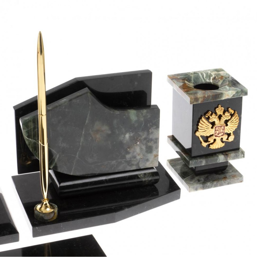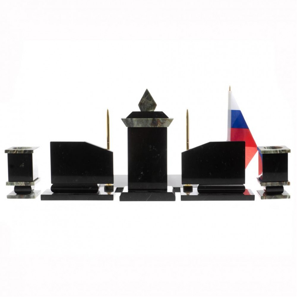 Настольный набор с гербом и флагом России из офиокальцита размером часы 13х11х27 см, визитница 17х11х14 см, карандашница 7х7х12 см, флагшток 5х5х27 см, подставка под календарь 26х16х3 см и весом 6000 г.