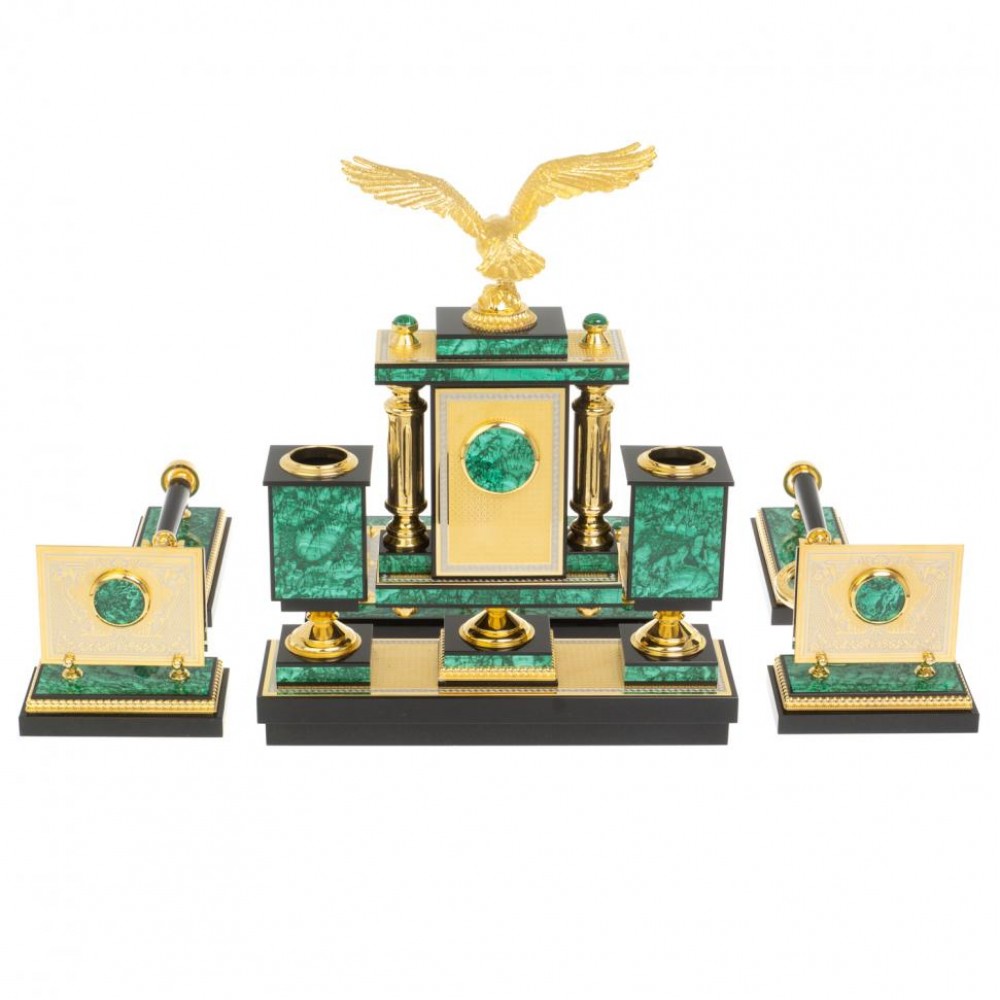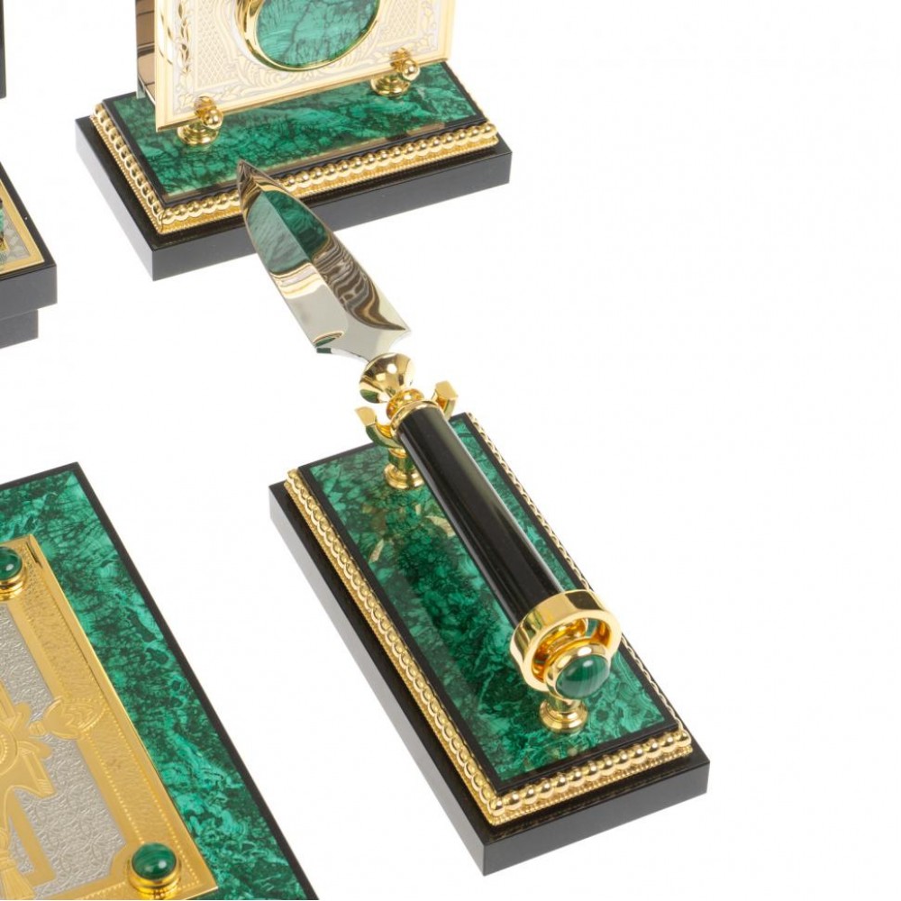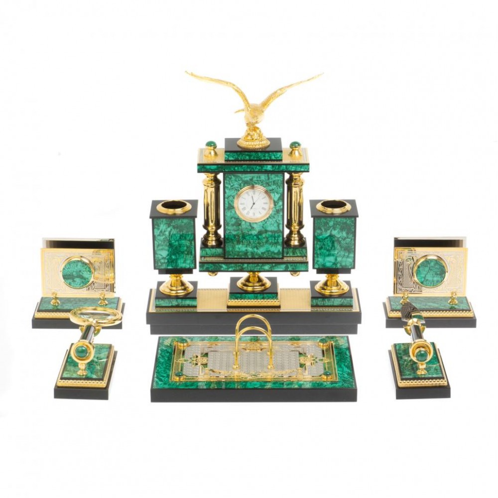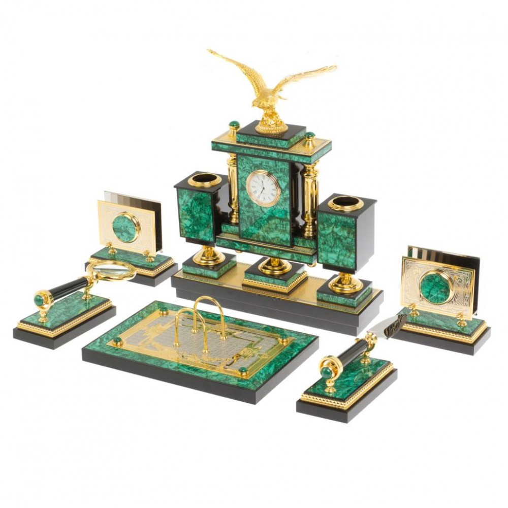 Настольный набор изготовлен из камня малахит, имеет размеры часы 31х9х39 см, визитница 13х7х12 см, календарница 26х18х3 см, нож 24х3х2 см, лупа 20х7х2 см, кейс 64х24х48 см. и весит 27 кг.