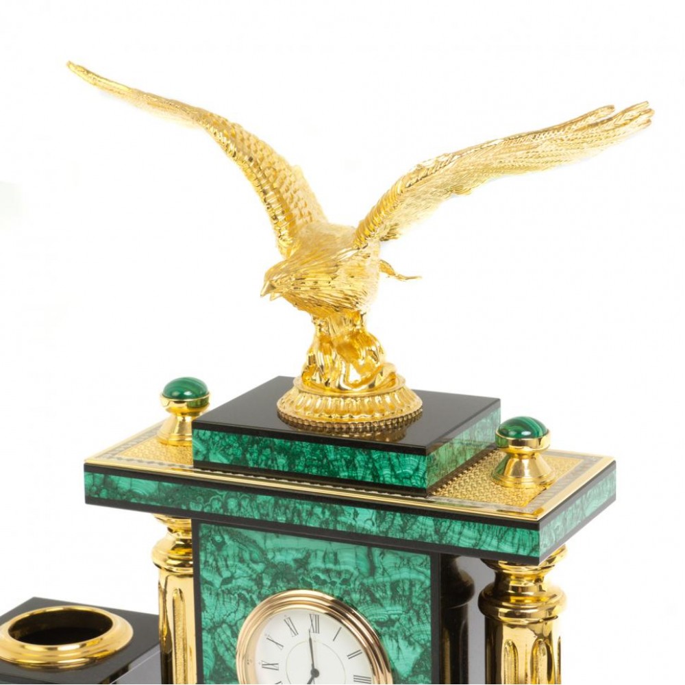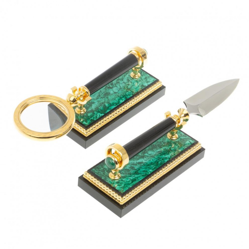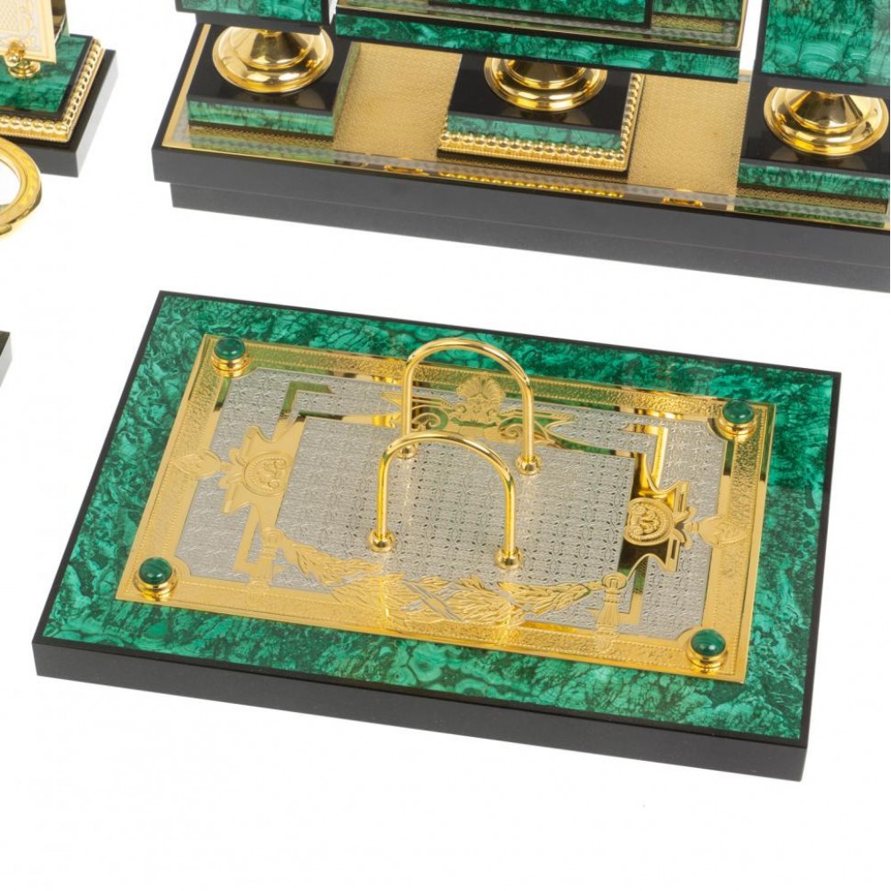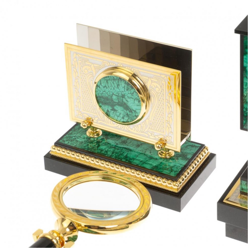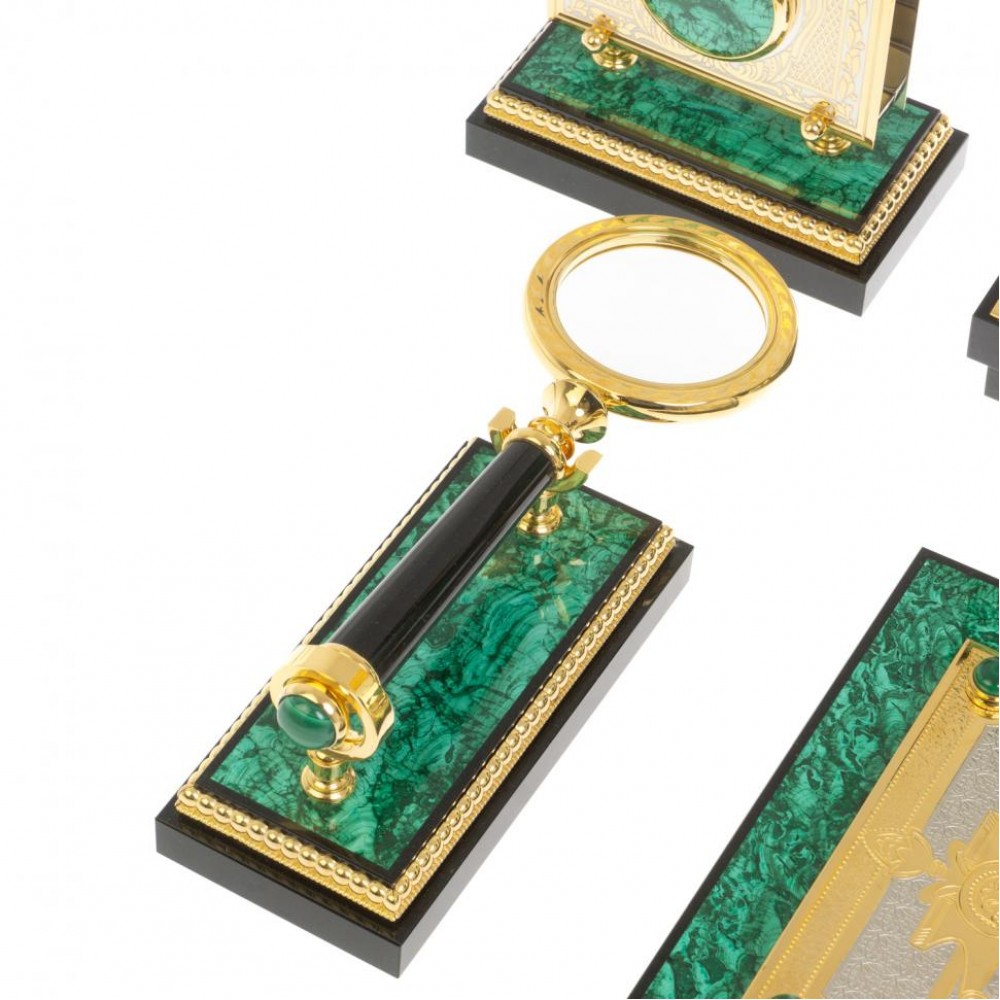 Настольный набор изготовлен из камня малахит, имеет размеры часы 31х9х39 см, визитница 13х7х12 см, календарница 26х18х3 см, нож 24х3х2 см, лупа 20х7х2 см, кейс 64х24х48 см. и весит 27 кг.
