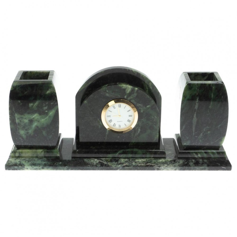 Офисный письменный набор с часами из шабровского змеевика размером 28х8х11 см и весом 2400 г.