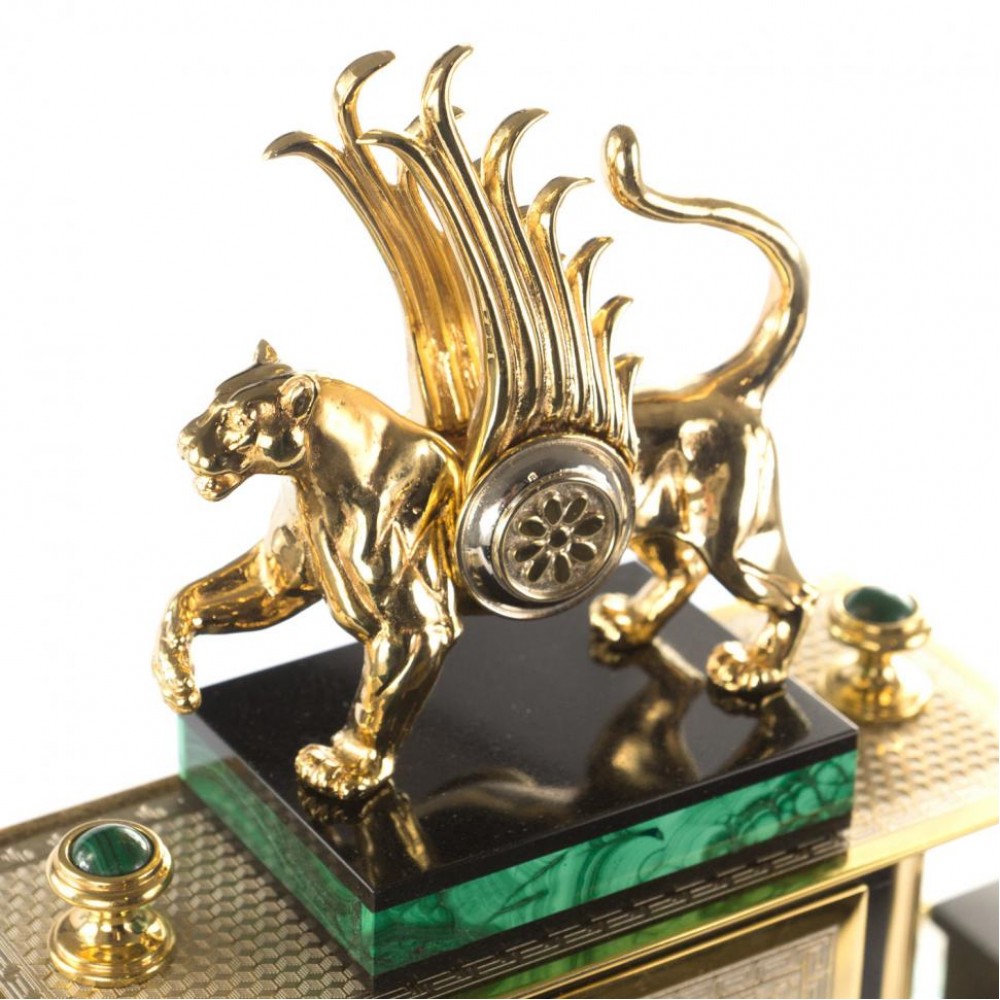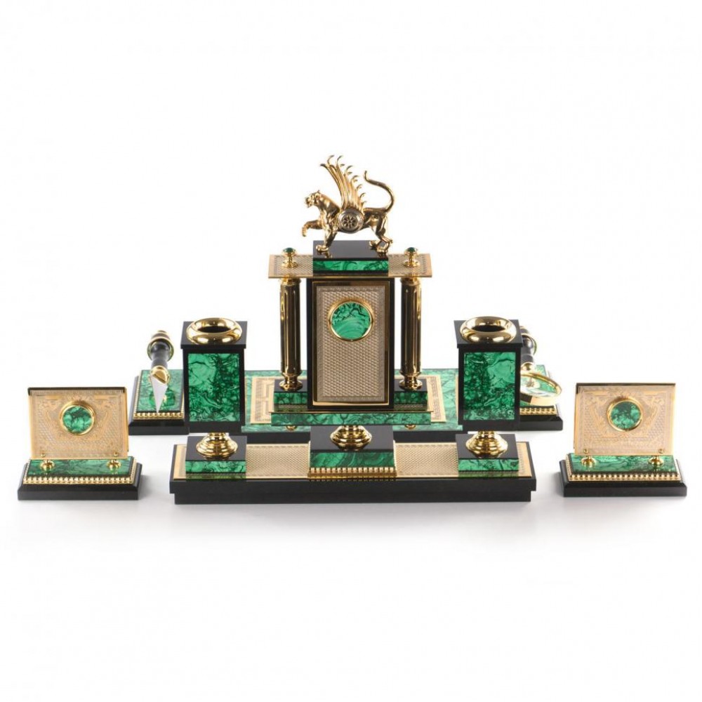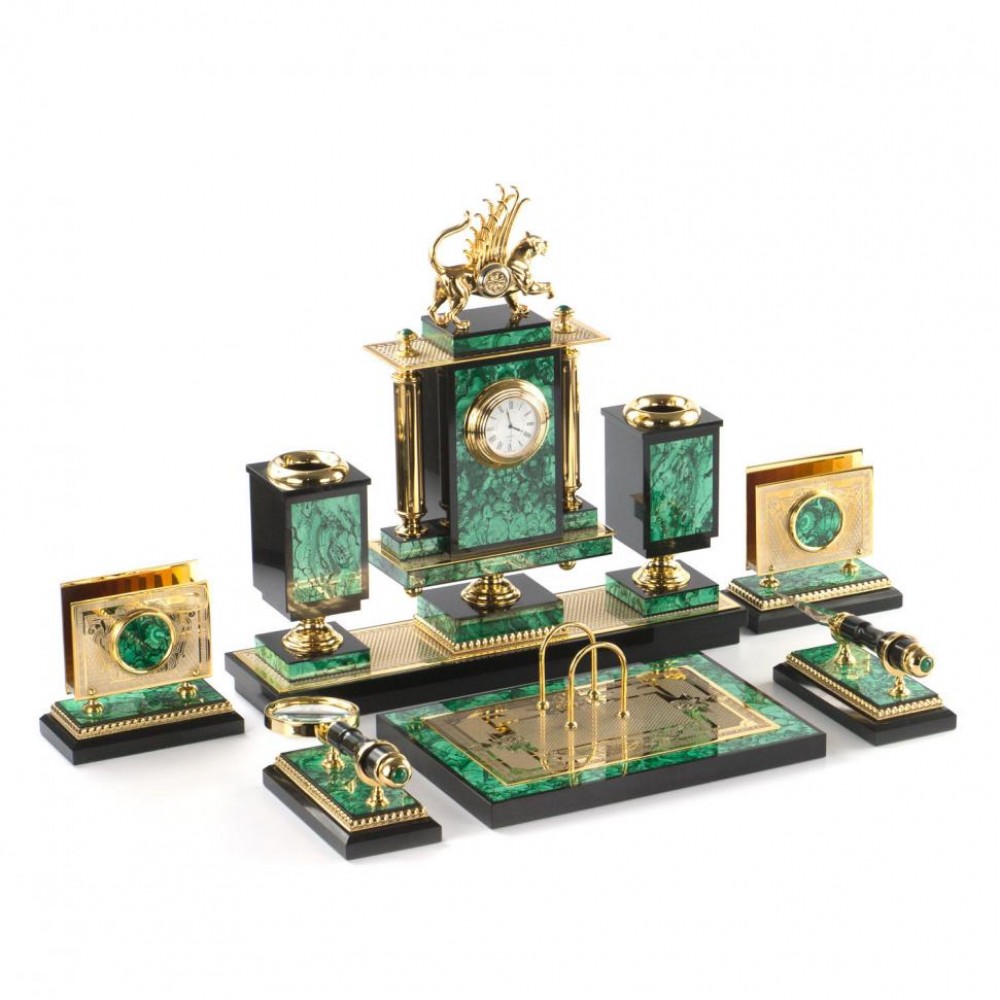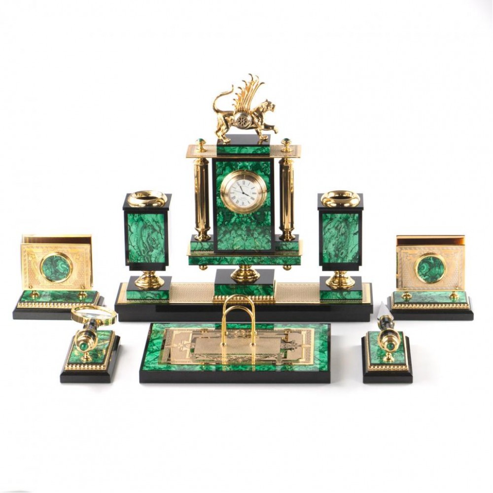 Письменный набор "Ак Барс" выполнен из камня малахит, имеет размеры: часы 39х12х4 см, визитница 13,7,12,5 см, календарь 26,5х18,5х8,5 см, лупа 18,5х6,5 см, нож 3,5х6,5 см, подставка под лупу или нож 15х7х8 см и весит 25 кг.