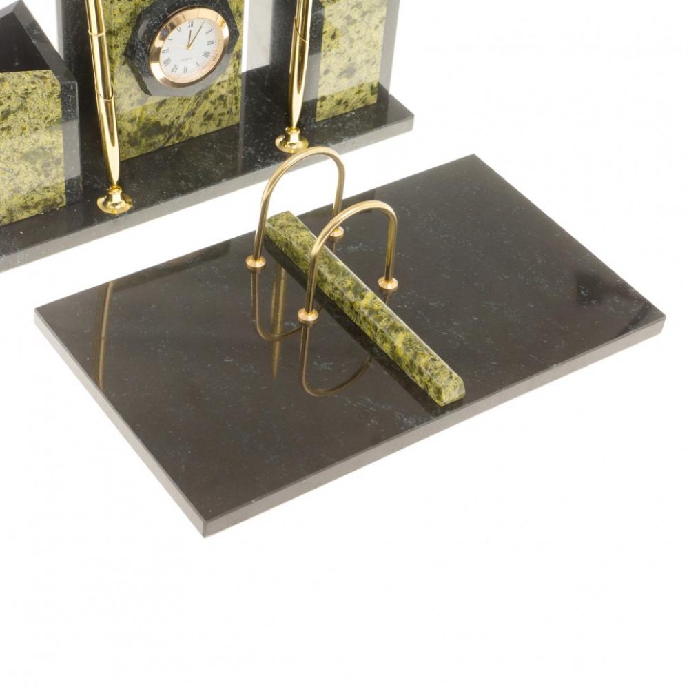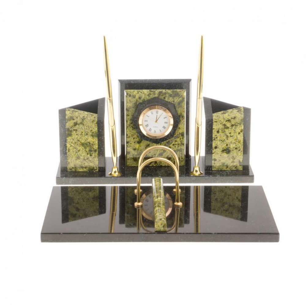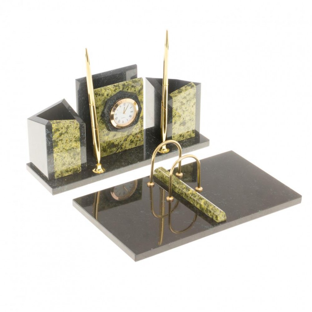 Настольные наборы из змеевика имеют стильный дизайн и вдобавок они изготавливаются вручную из безопасных и экологичных материалов.