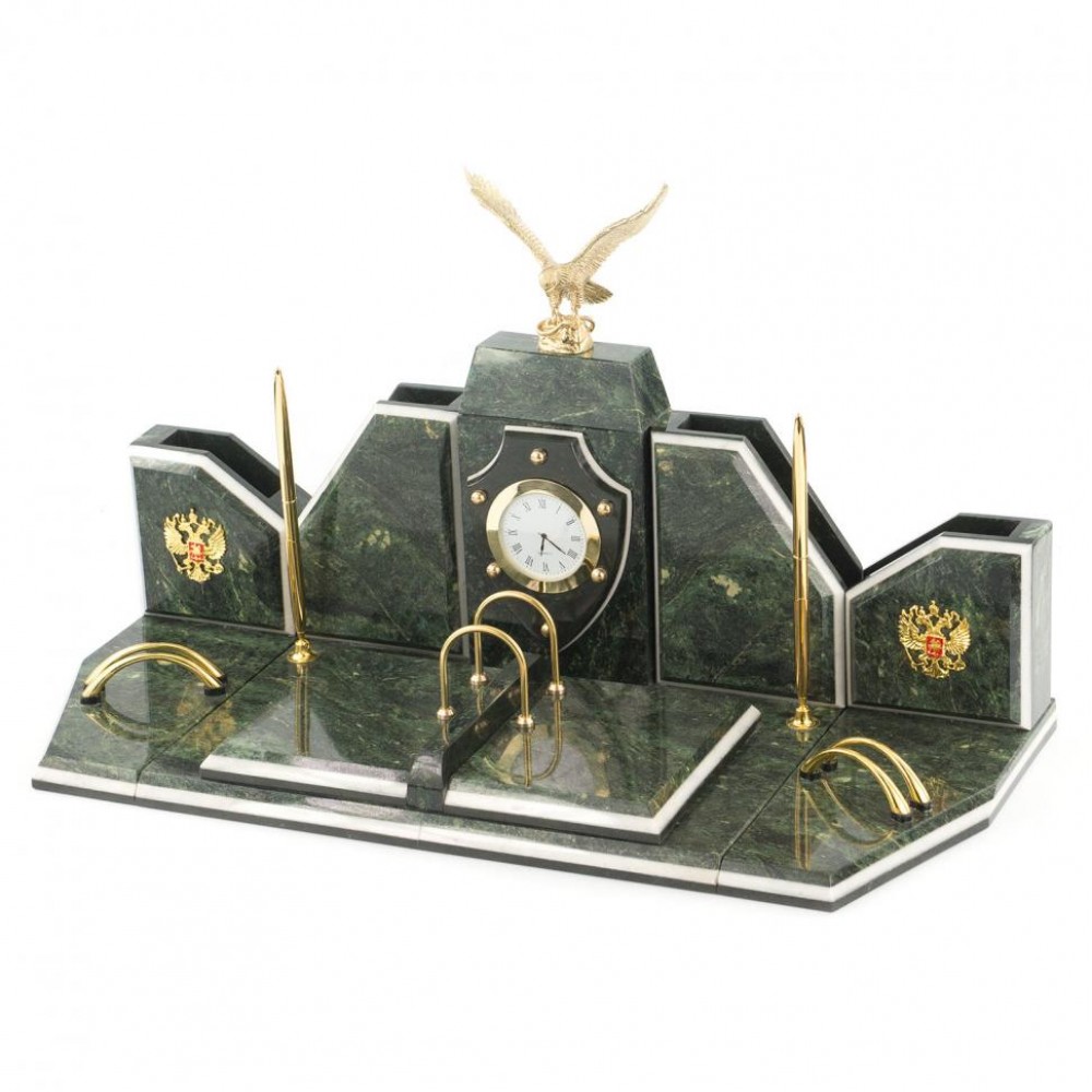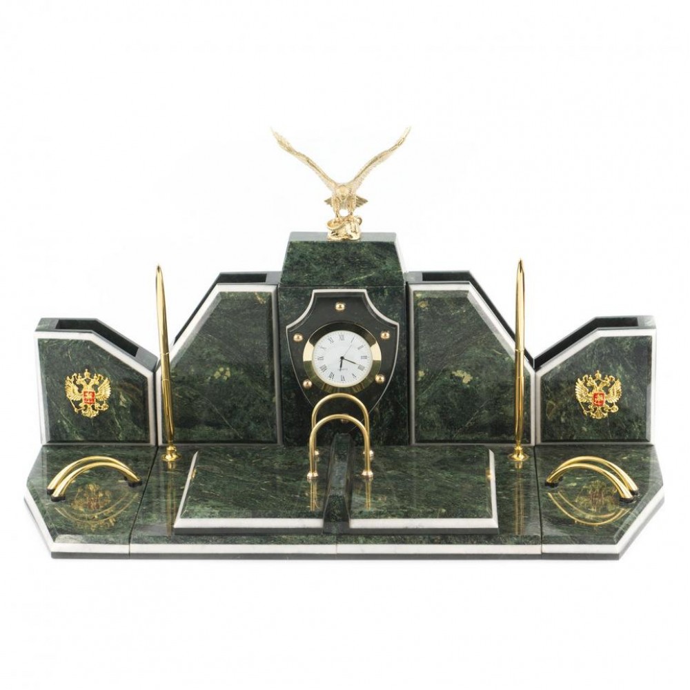 Настольный набор из змеевика станет отличным подарком руководителю. Этот аксессуар органично впишется в интерьер любого кабинета, став удобным дополнением рабочего стола.