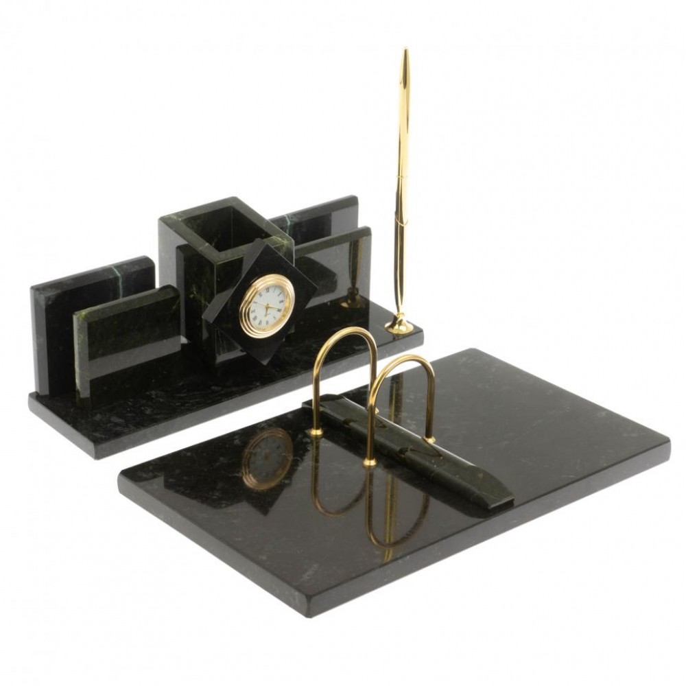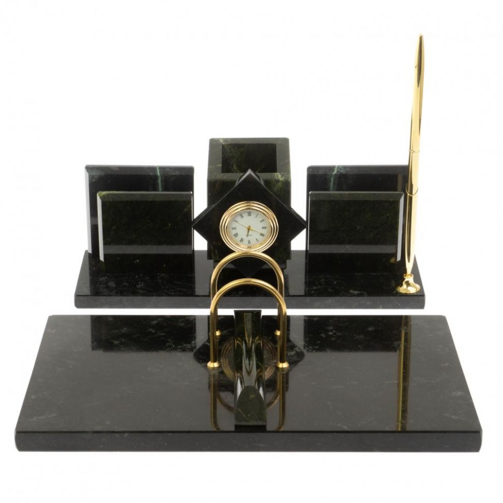 Письменный набор "Менеджер" из змеевика с часами размером центральная часть 26х8х10 см, подставка под календарь 26,5х15,5х3 см и весом 2580 г.