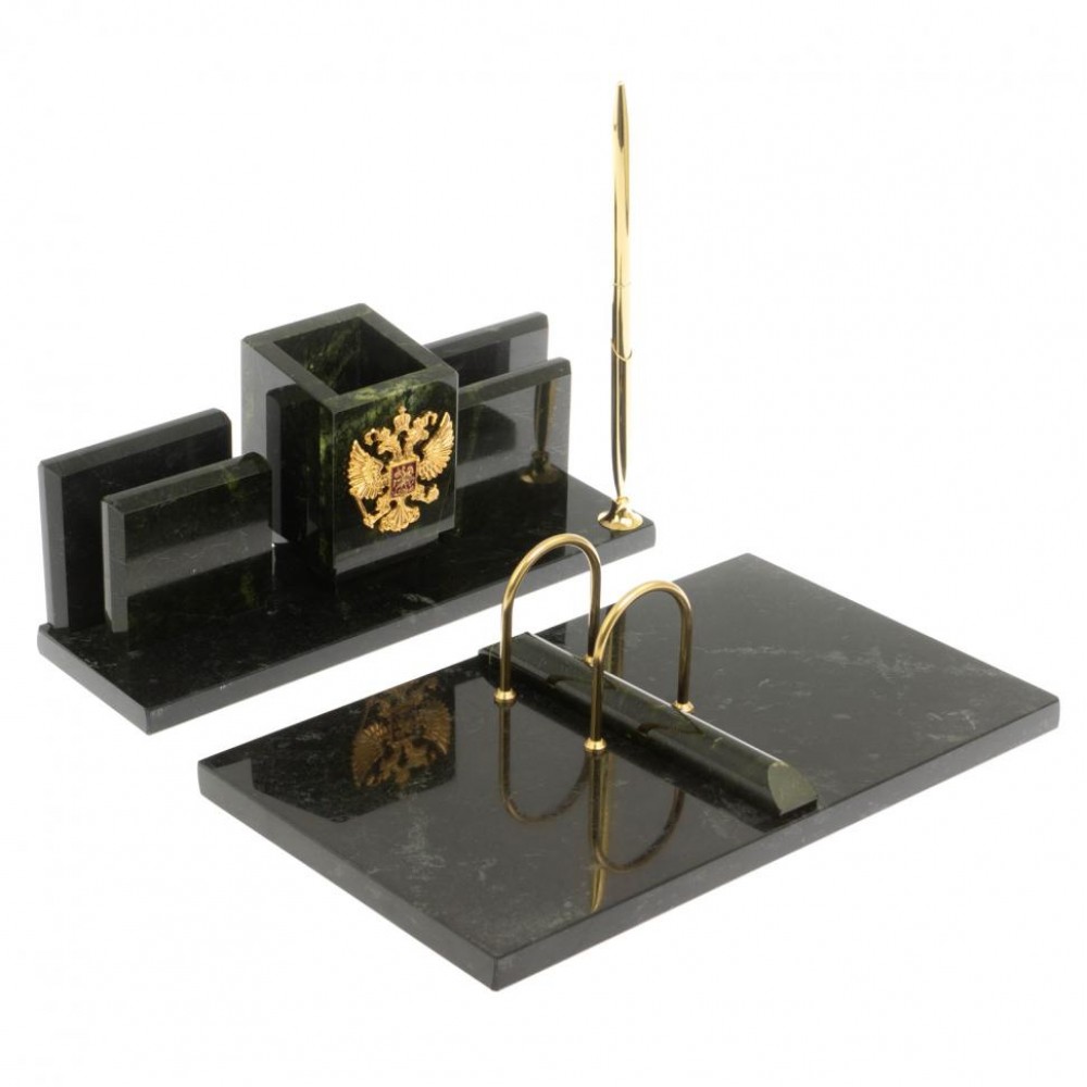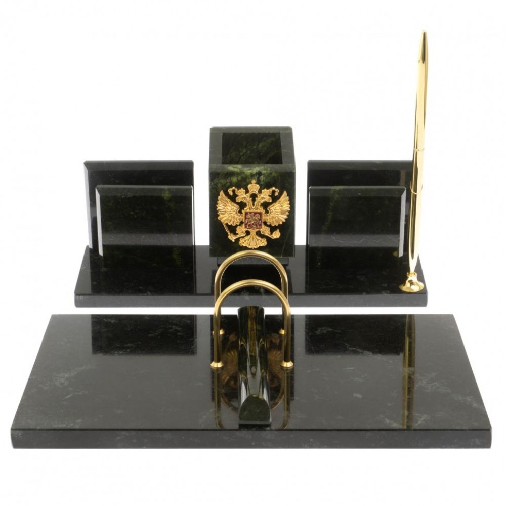 Письменный настольный набор "Менеджер" из змеевика с гербом РФ размером центральная часть 26х8х10 см, подставка под календарь 26,5х15,5х3 см и весом 2580 г.
