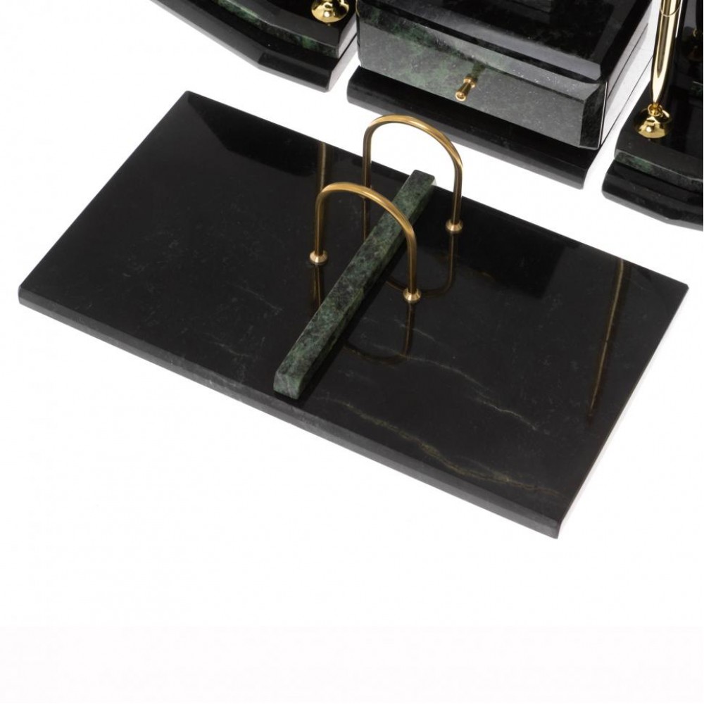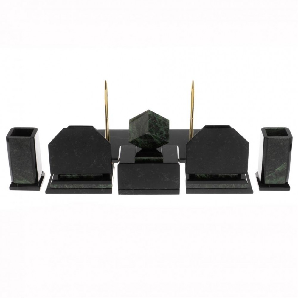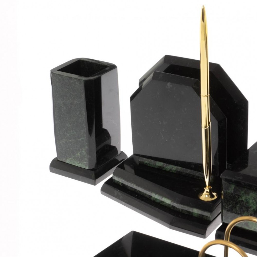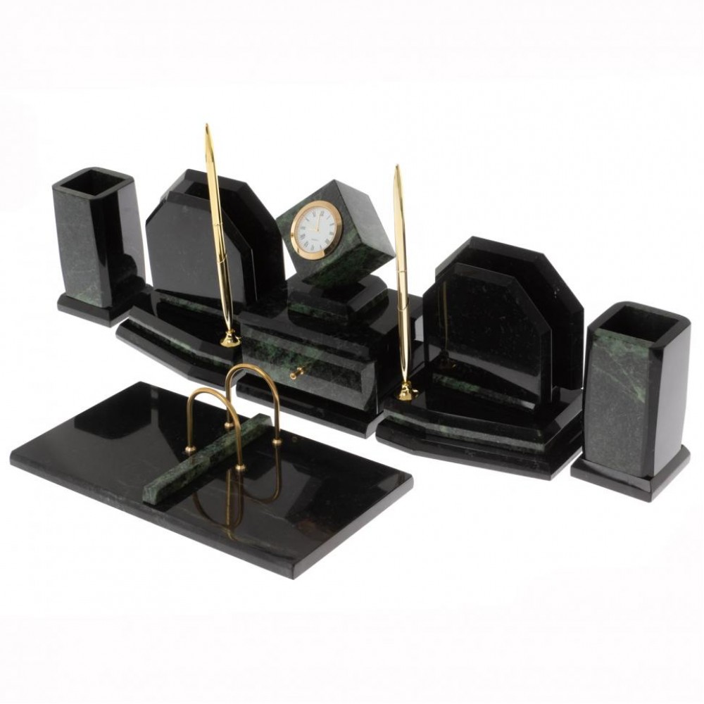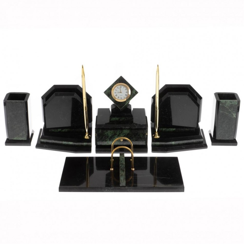 Настольные наборы из змеевика имеют классический дизайн и вдобавок они изготавливаются вручную из безопасных и экологичных материалов.
