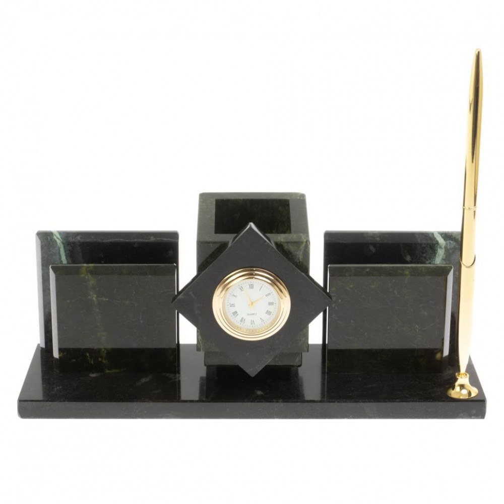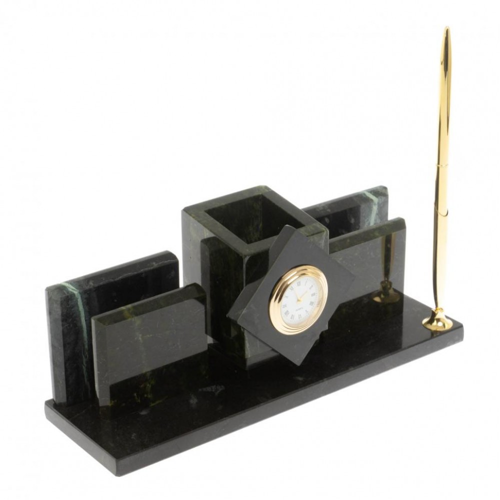 Письменный прибор "Менеджер" из черного змеевика с часами размером 24х7х11 см и весом 1400 г.