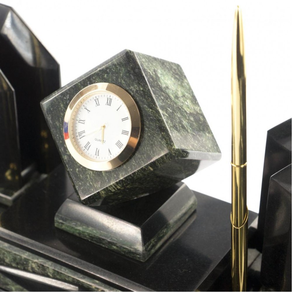 Письменный прибор руководителя из натурального змеевика размером часы 39х9х23 см, календарь 26х14,5х5 см, бумажница 15х15х6 см, ваза 6х6х13 см, шкатулка 6,5х6,5х7 см и весом 11500 г.