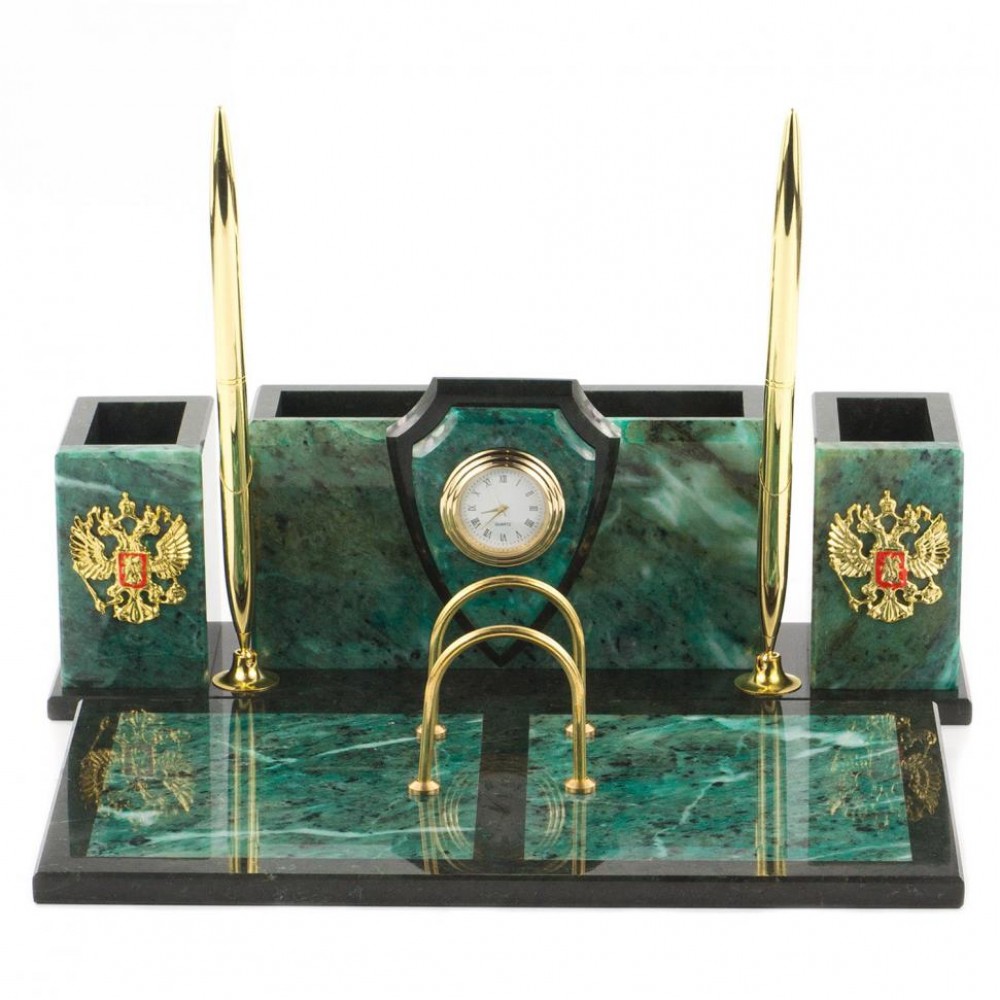 Настольный набор изготовлен из камня змеевик, имеет размеры часы 30х8х11 см, календарница 27,5х14,5х1 см и весит 3400 г.