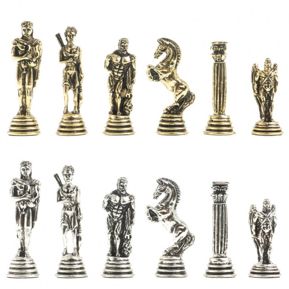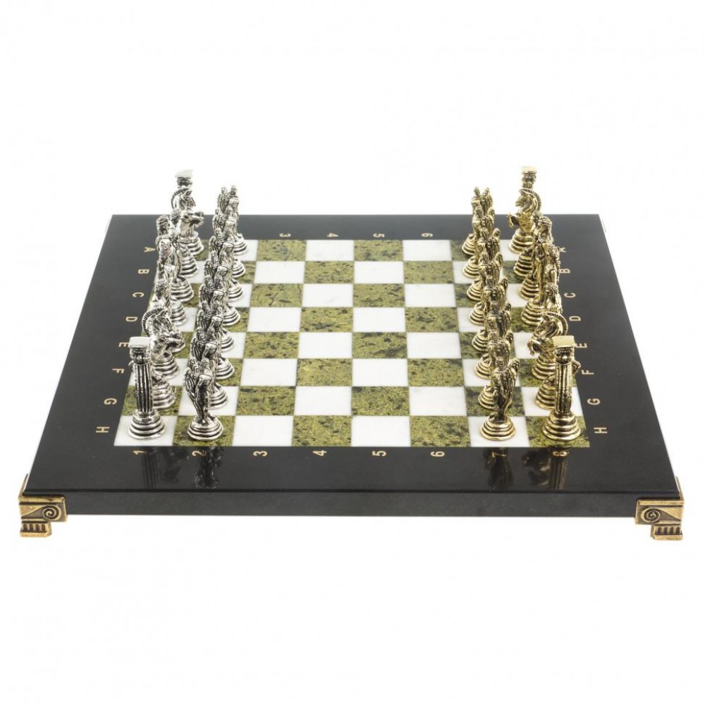 Шахматы выполнены вручную из натурального камня, фигуры металлические в цвете золото и серебро, имеют размеры: доска 32х32х2,5 см, клетка 3х3 см, высота фигур: пешка 4,5 см, король 6,5 см и весят 7620 г.