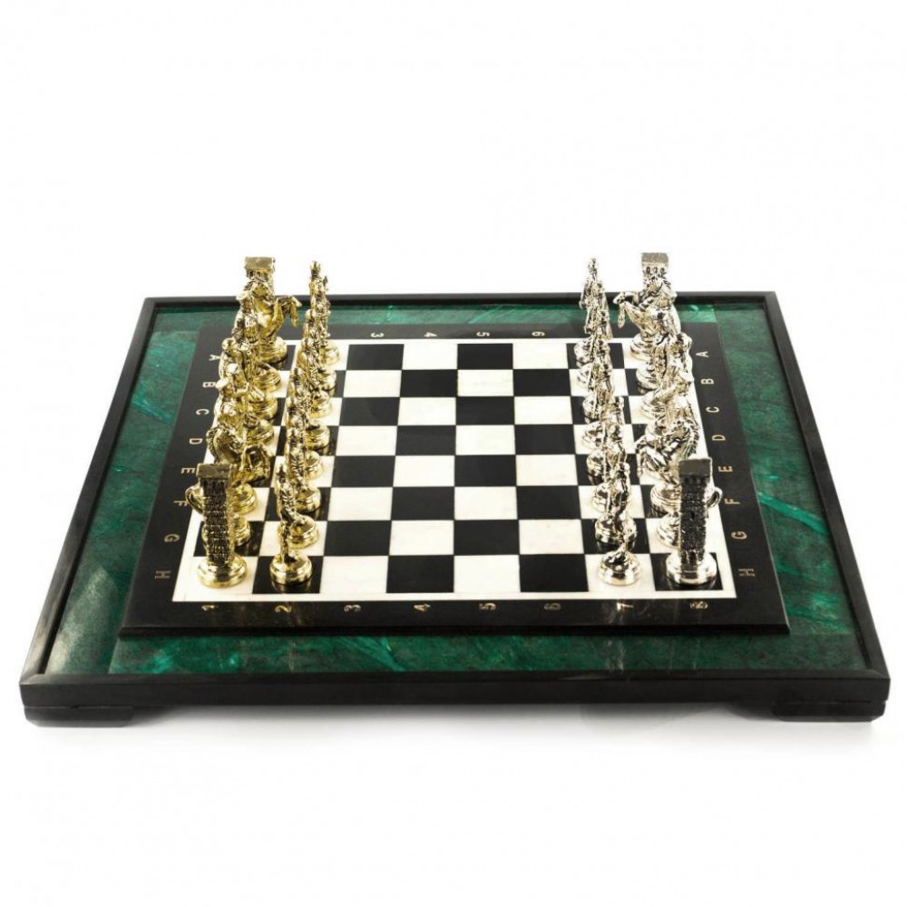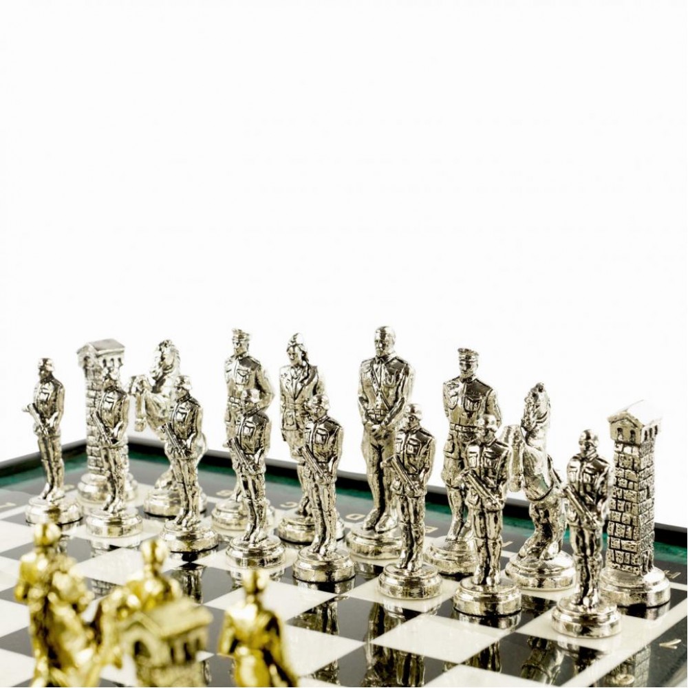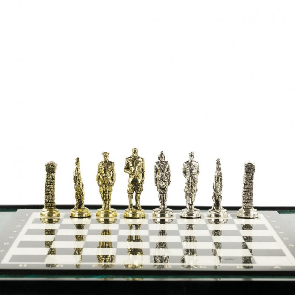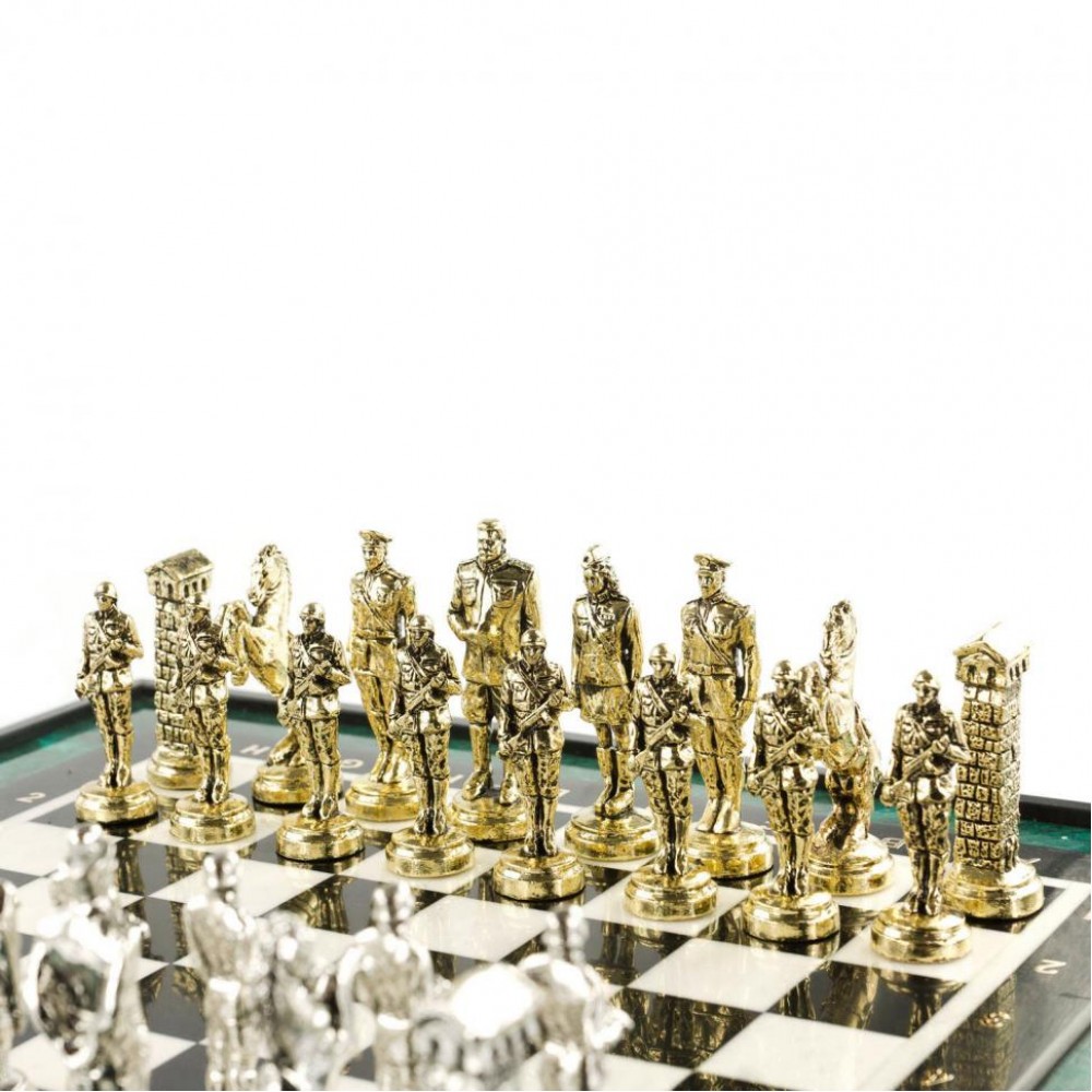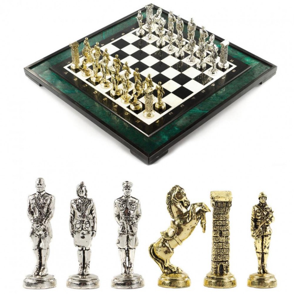 Подарочные исторические шахматы – новинка в нашем интернет-магазине. Шахматные фигуры в золотом цвете – советские войска во главе Иосифом Сталиным, с другой стороны в серебряном цвете – немецкие войска во главе с Адольфом Гитлером. Фигуры из металла с высоким уровнем детализации игровых персонажей. В наборе футляр из экокожи. Доска изготовлена из камня: зеленый и черный змеевик, белый мрамор.