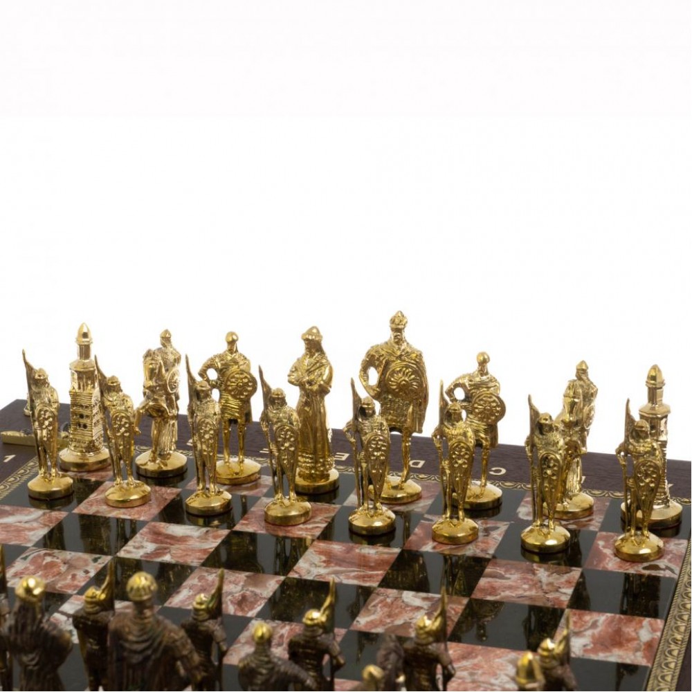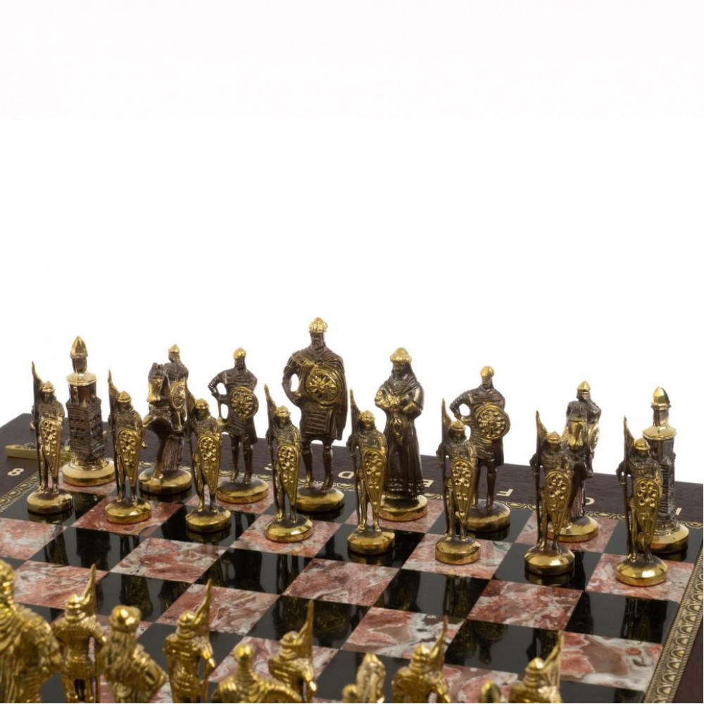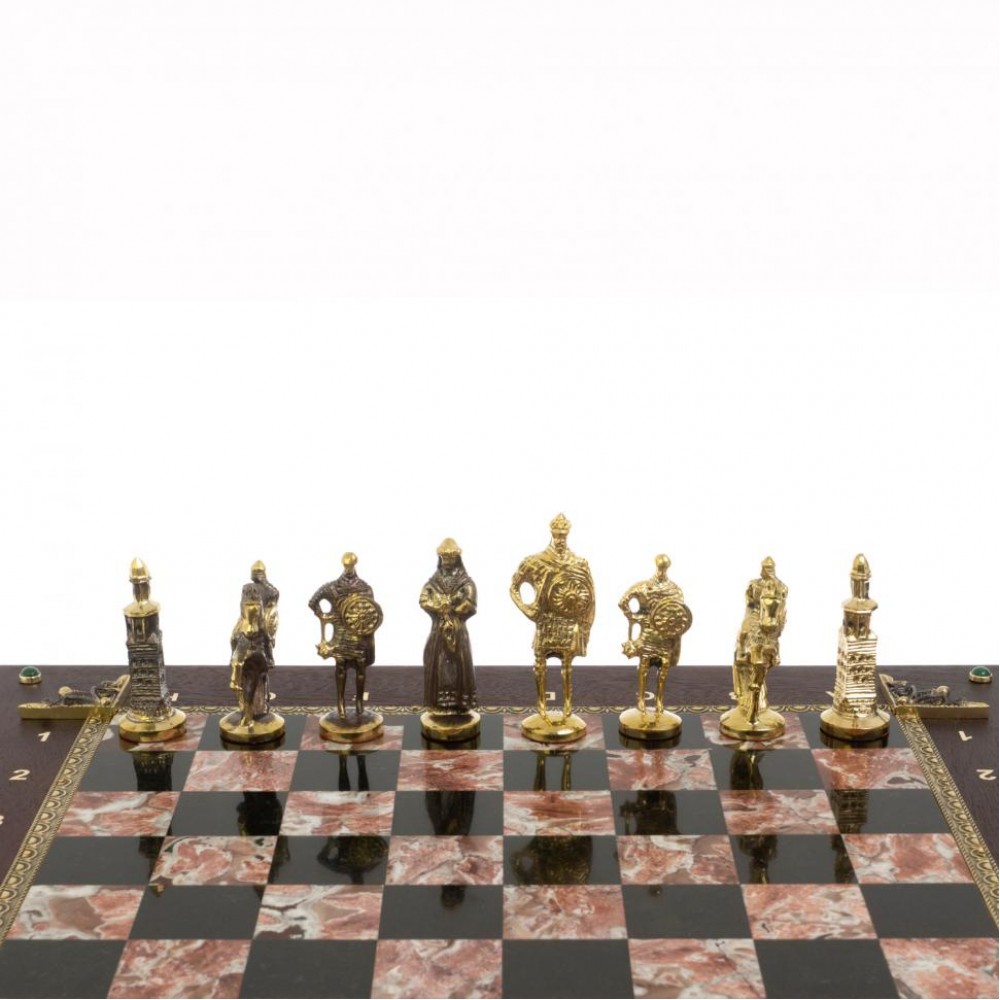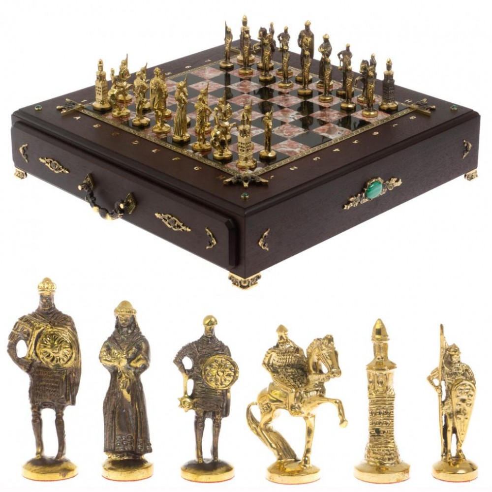Подарочный шахматный ларец "Русь" камень креноид размером ларец 49х49х10 см, клетка 4х4 см, высота фигур: пешка 7 см, король 9,5 см. и весом 17000 г.