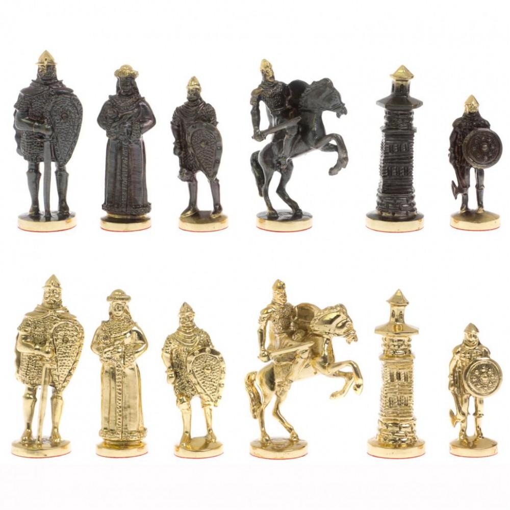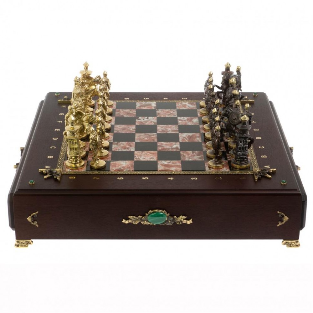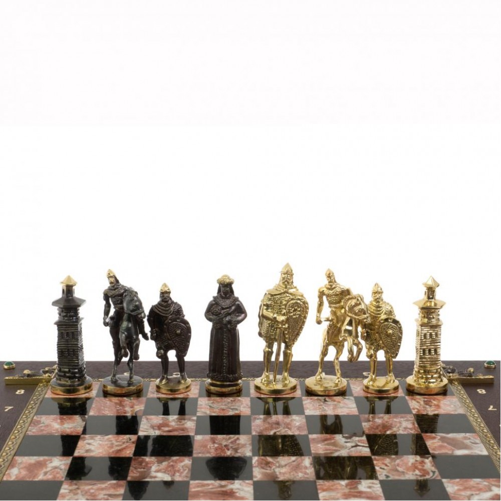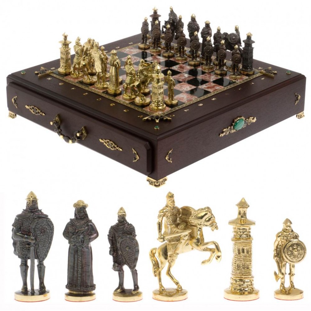 Шахматный ларец "Богатыри" бронза креноид размером ларец 49х49х10 см, клетка 4х4 см, высота фигур: пешка 7,5 см, король 10 см и весом 17000 г.