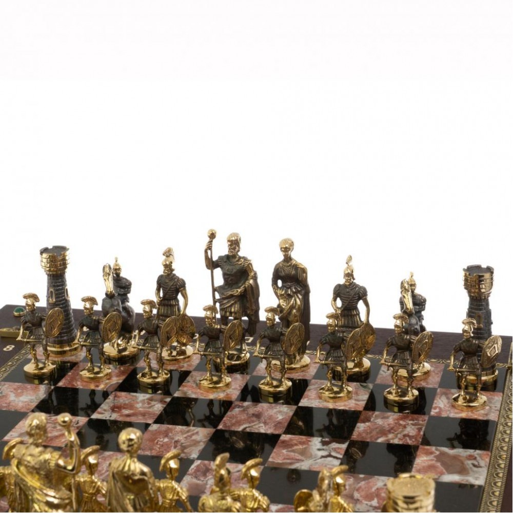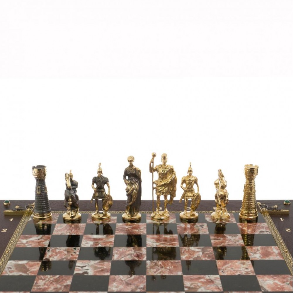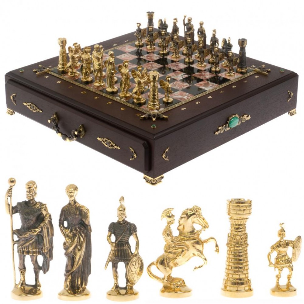 Шахматный ларец "Римские" из бронзы и креноида размером ларец 49х49х10 см, клетка 4х4 см, высота фигур 5,6-9 см и весом 17000 г.