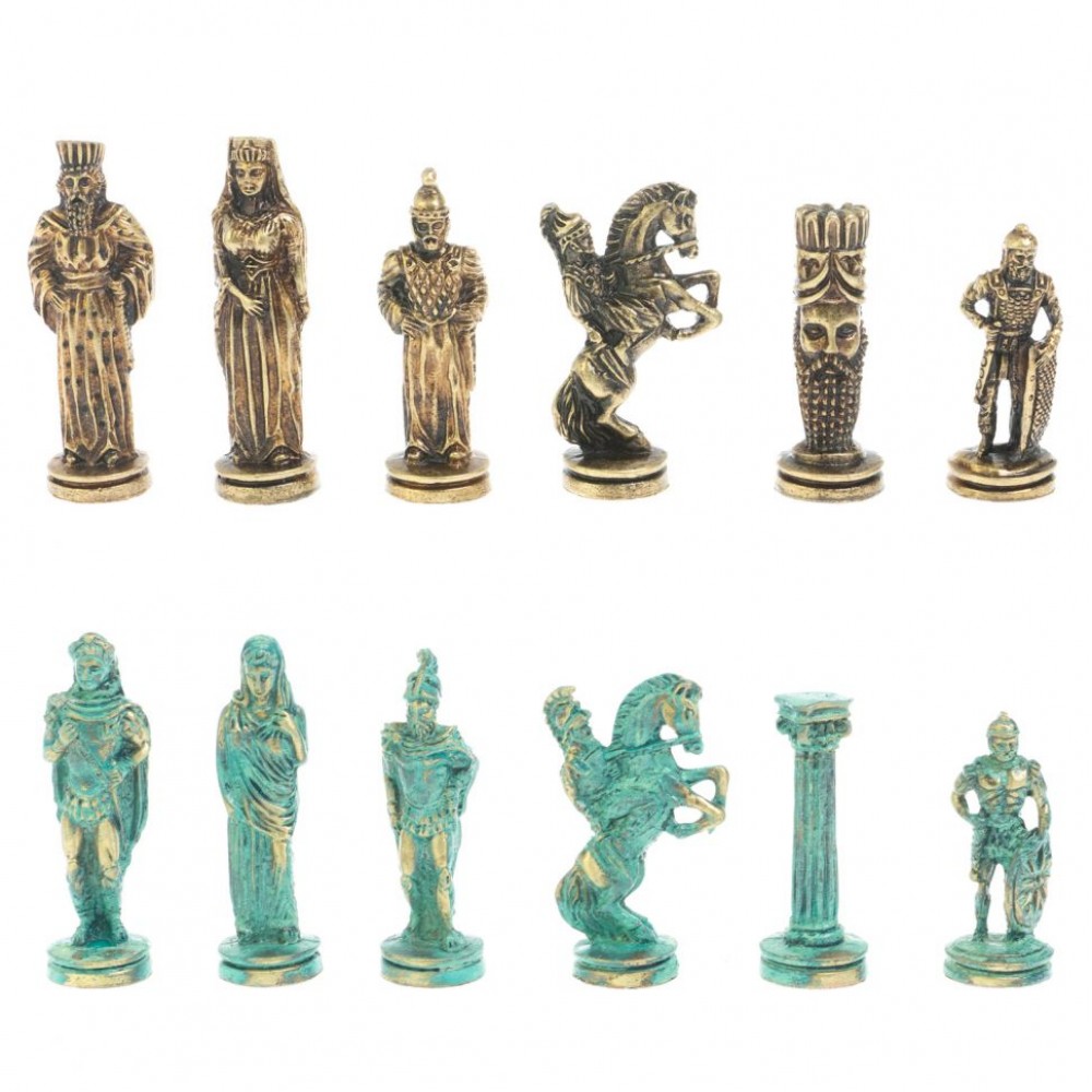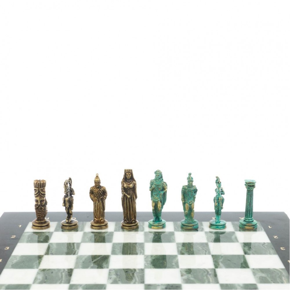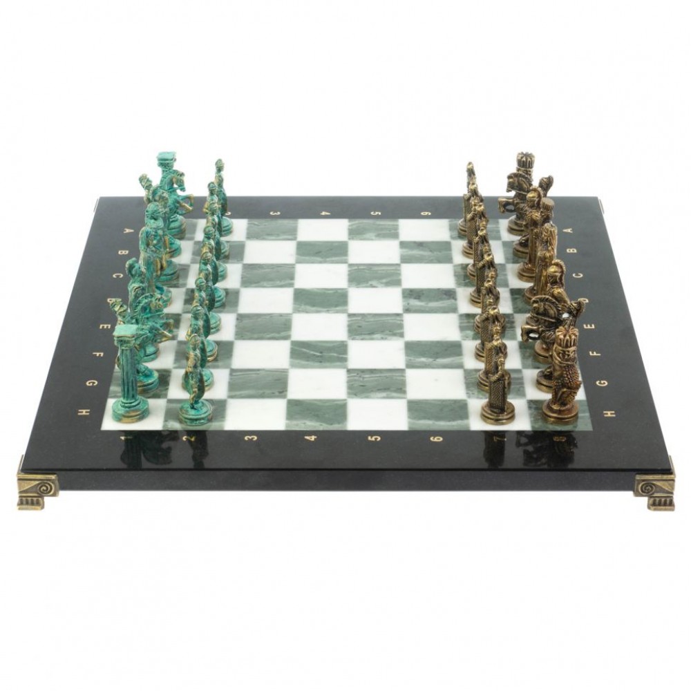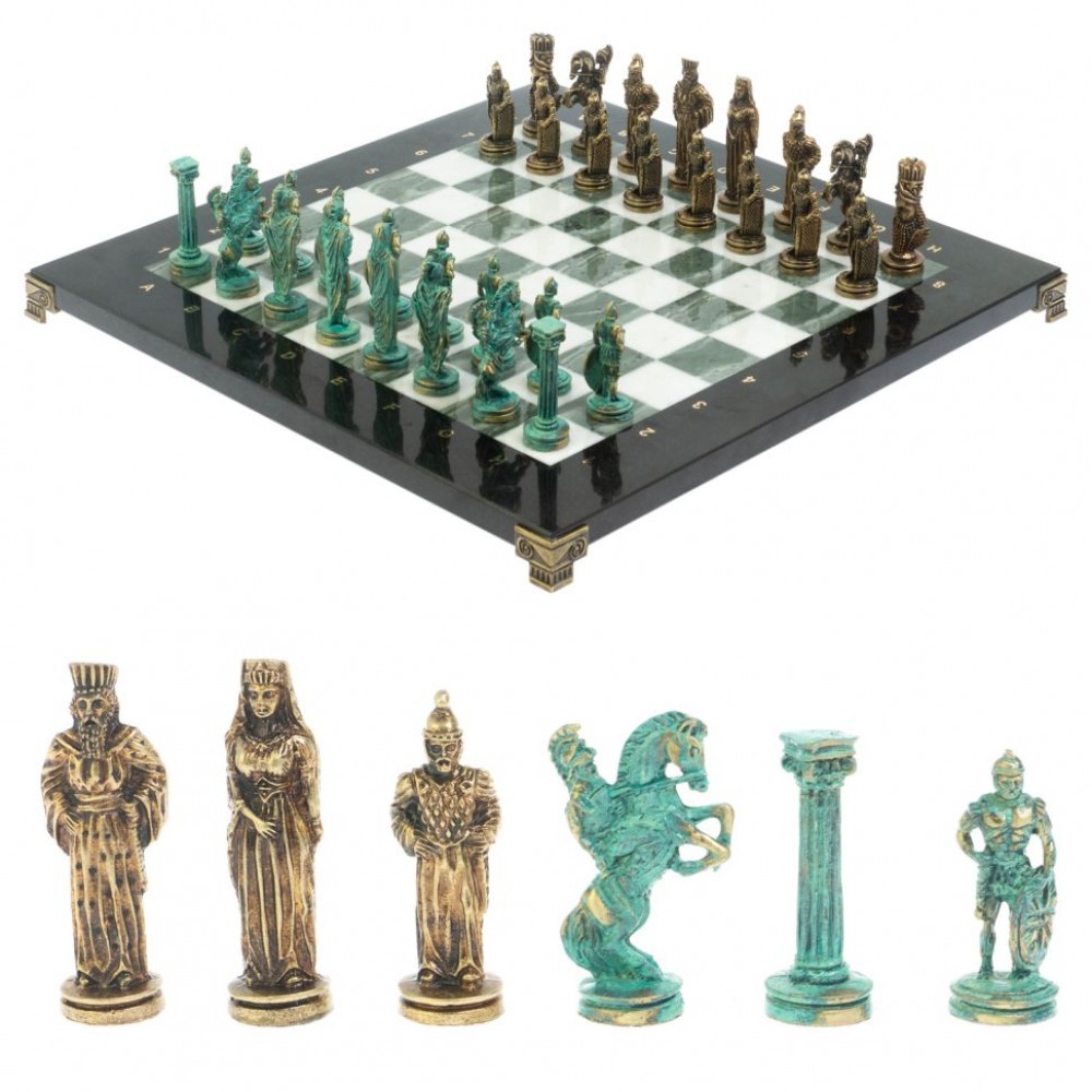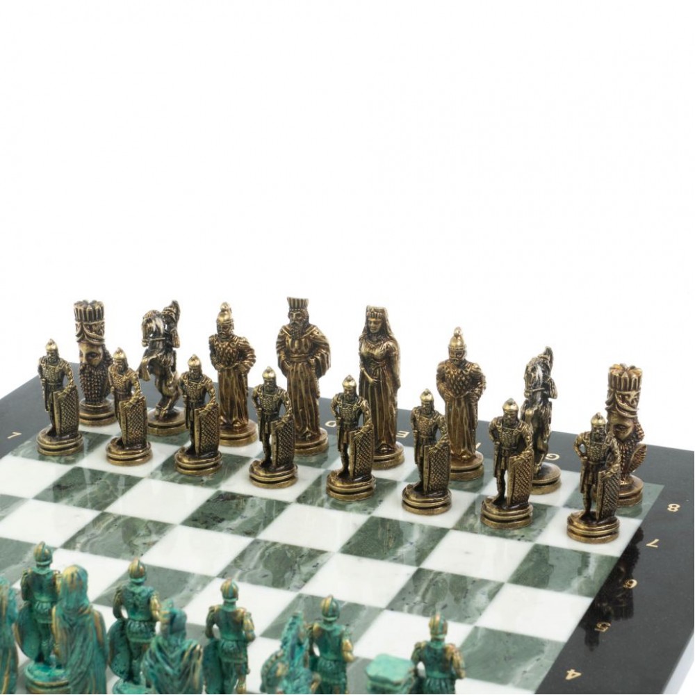 Шахматный набор "Рыцари" изготовлен вручную, доска из натурального камня, фигуры из металла в цвете золото и серебро.