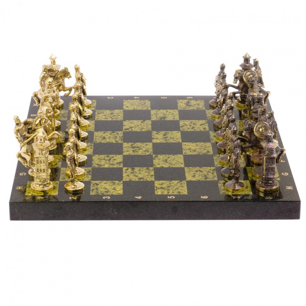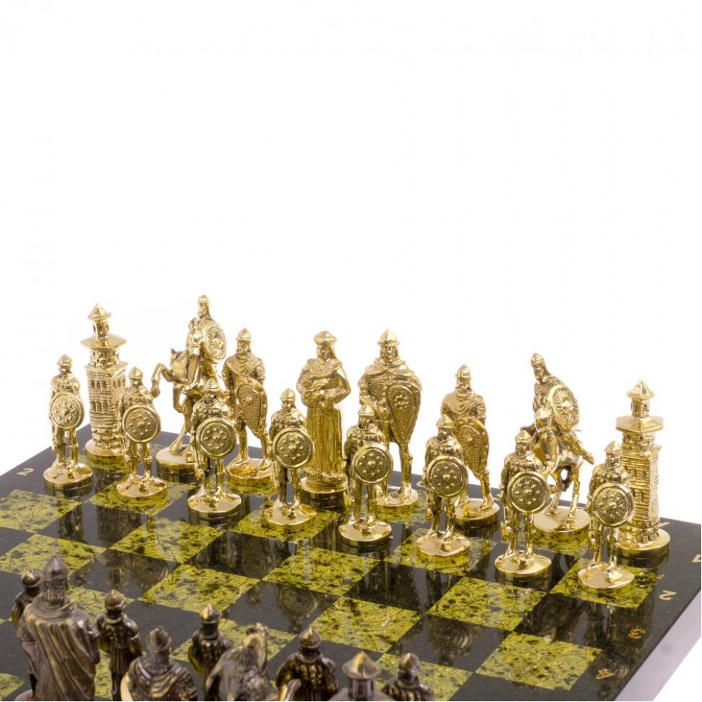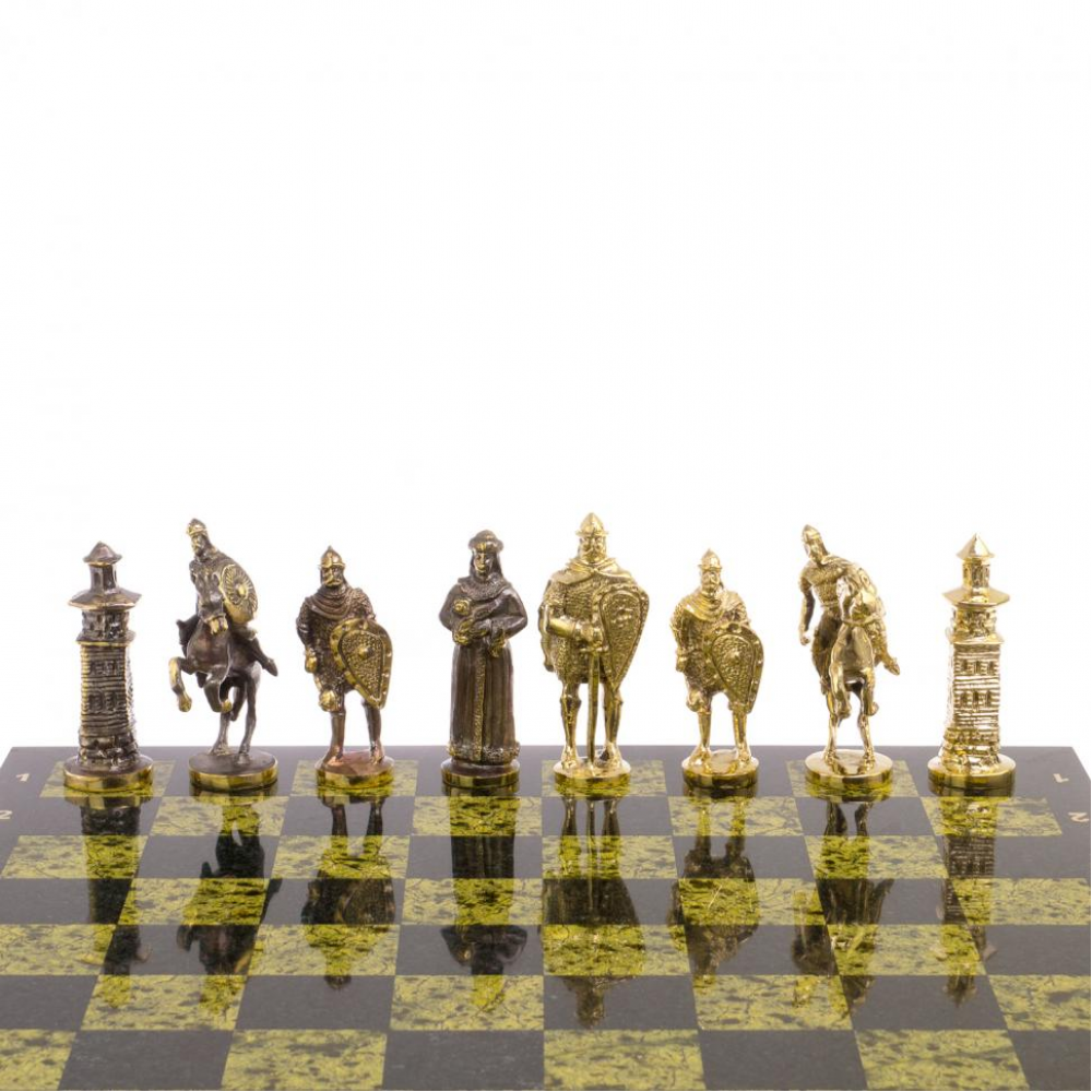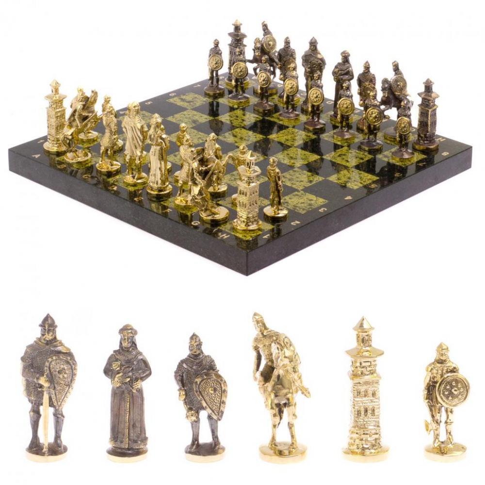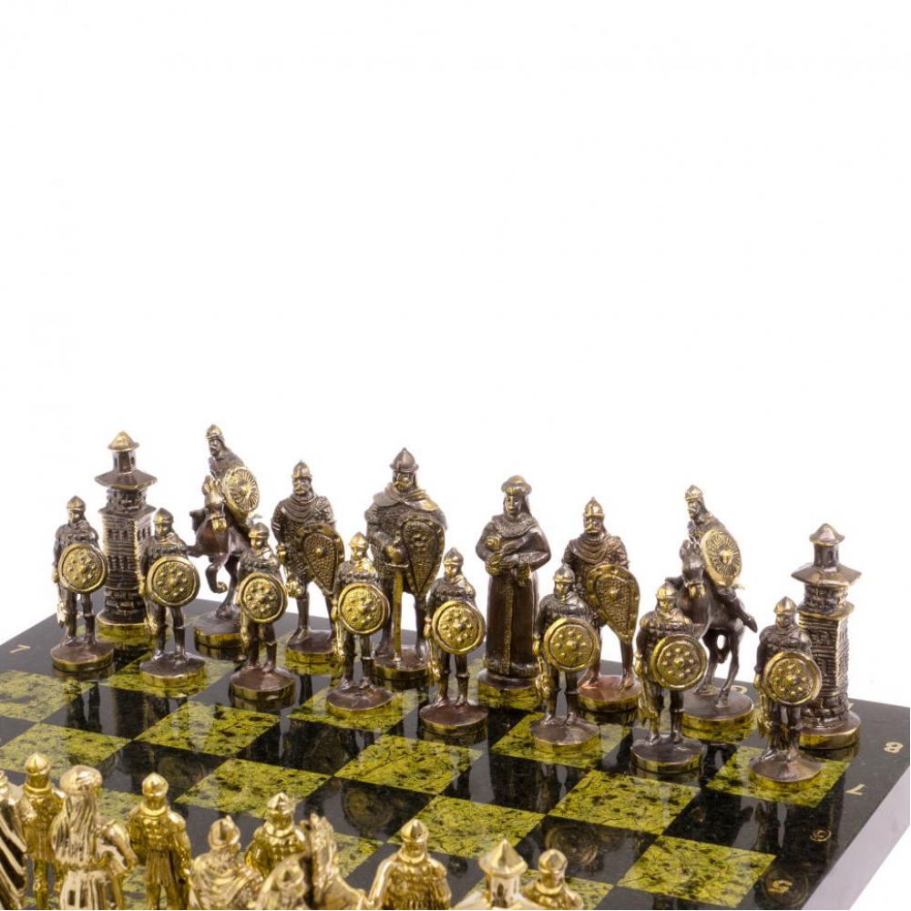 Шахматы настольные "Богатыри" змеевик бронза 40х40 см размером доска 40х40х3 см, клетка 4,5х4,5 см, высота фигур: пешка 7,5 см, король 10 см и весом 14000 г.