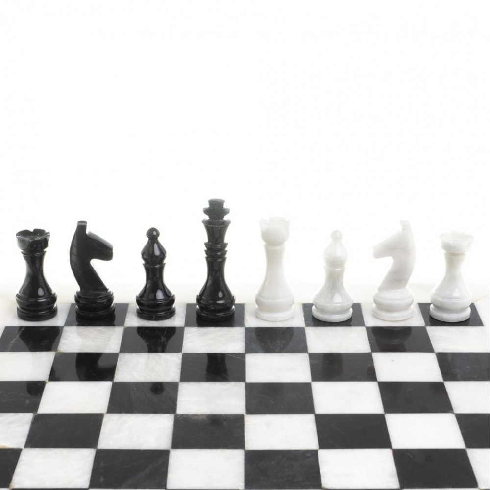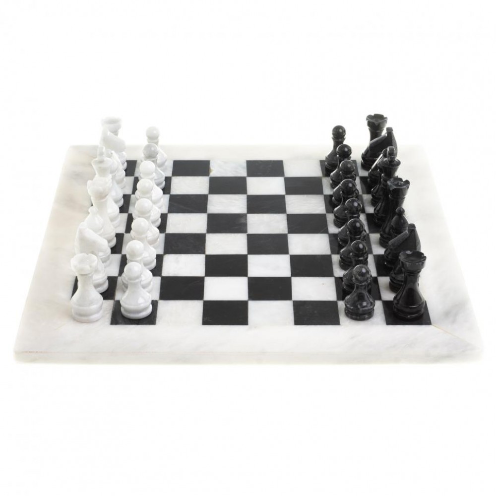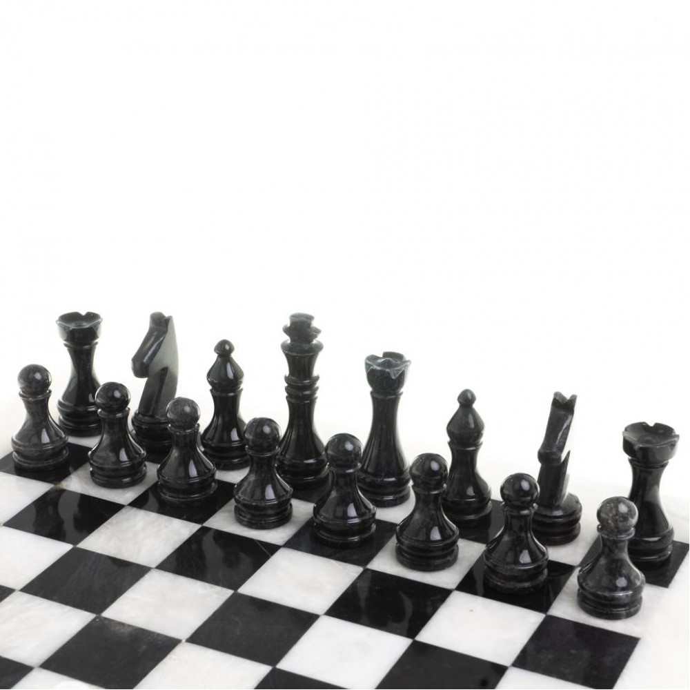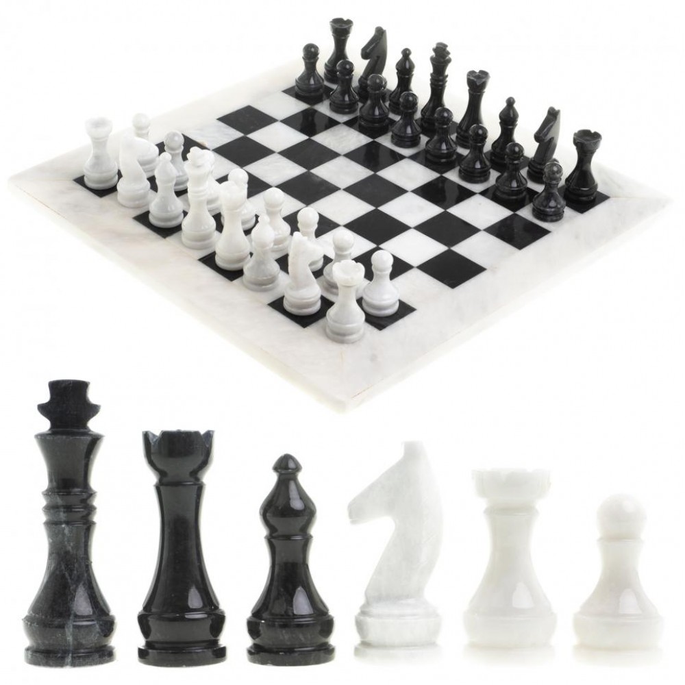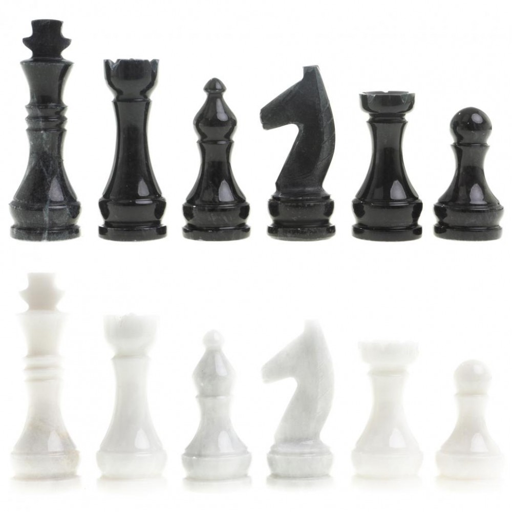 Шахматы изготовлены вручную из природного мрамора, имеют размеры: доска 38х38 см, клетка 4х4 см, фигуры 4,7-8 см и весят 6000 г.