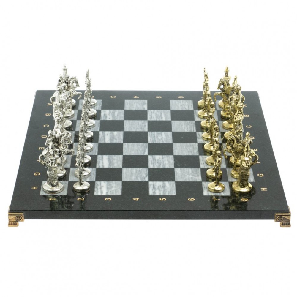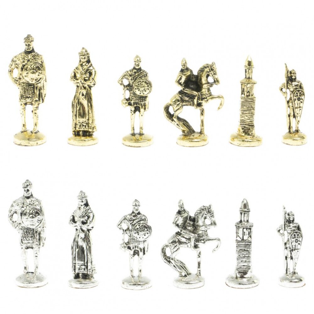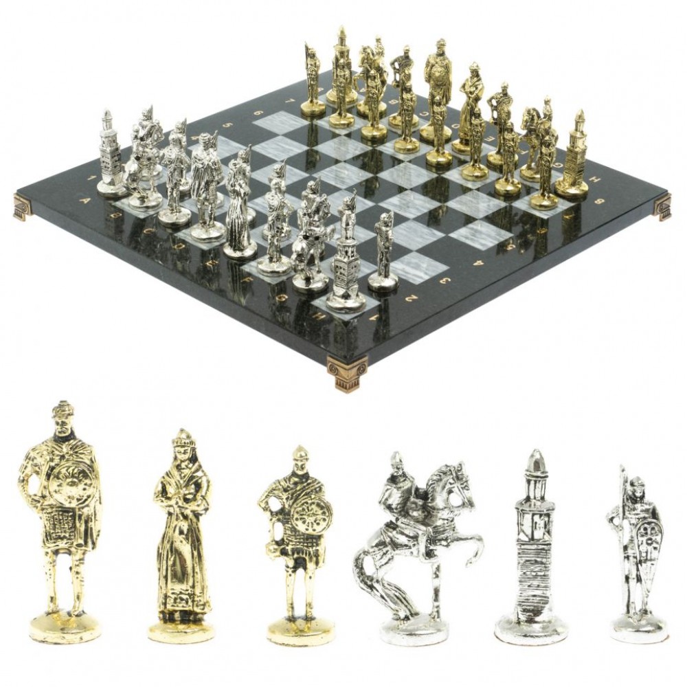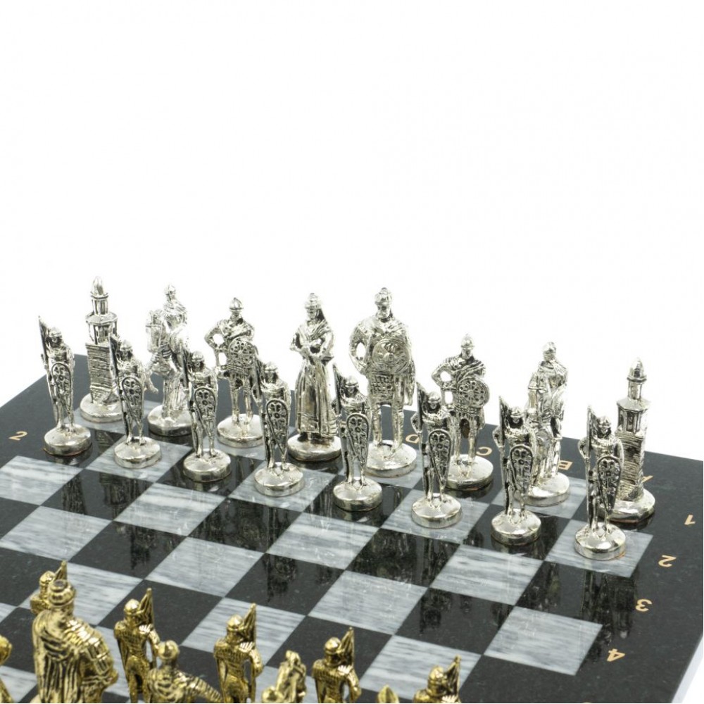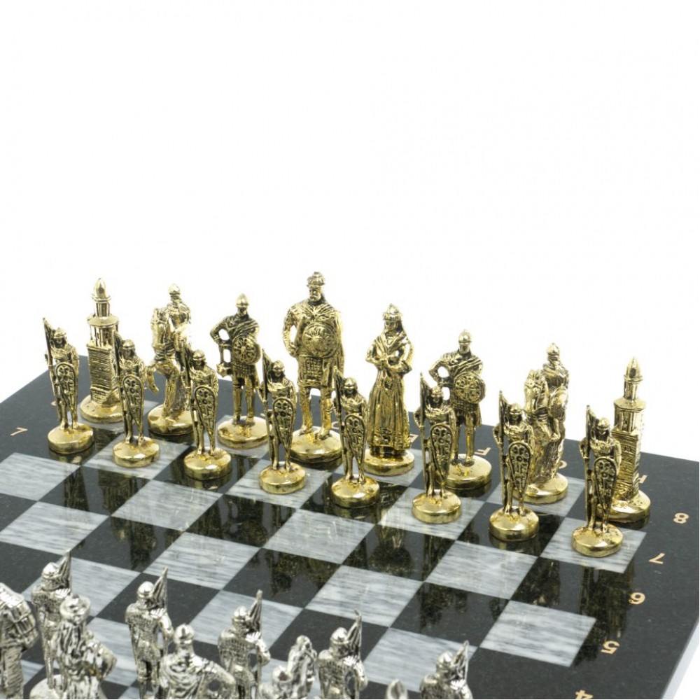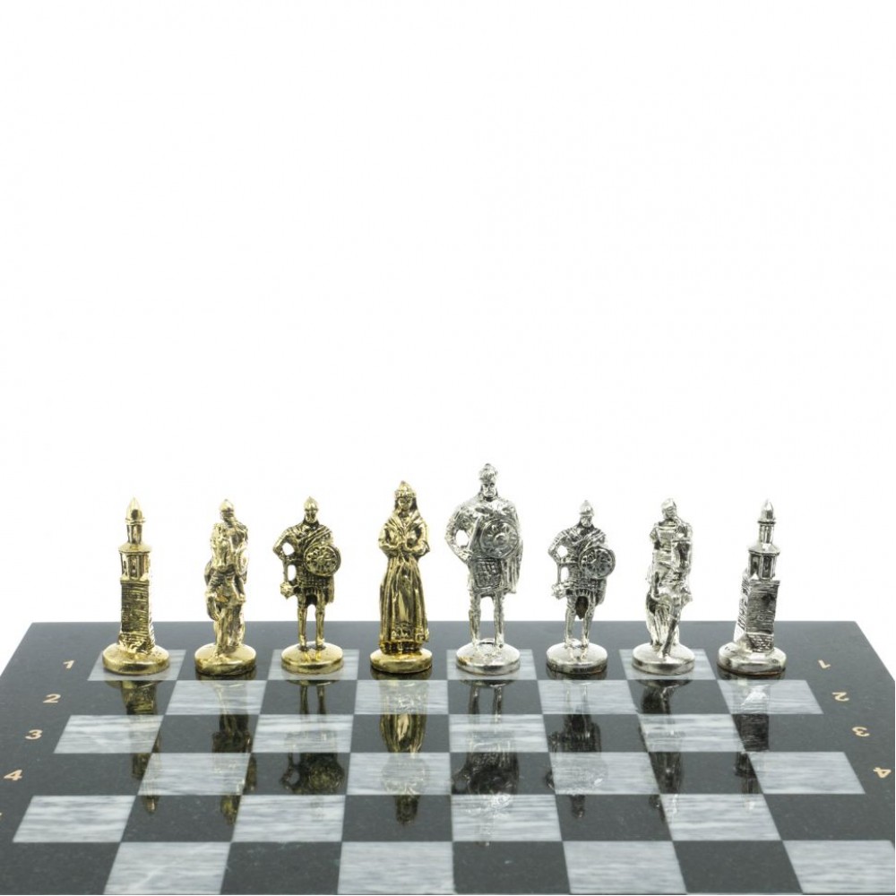 Набор для игры в шахматы "Русь" изготовлен вручную, доска из натурального камня, фигуры из металла в цвете золото и серебро.