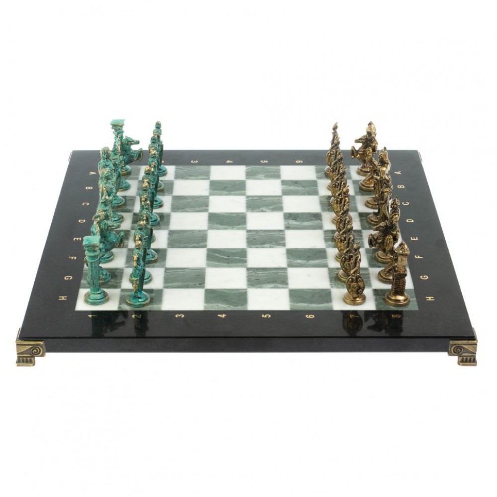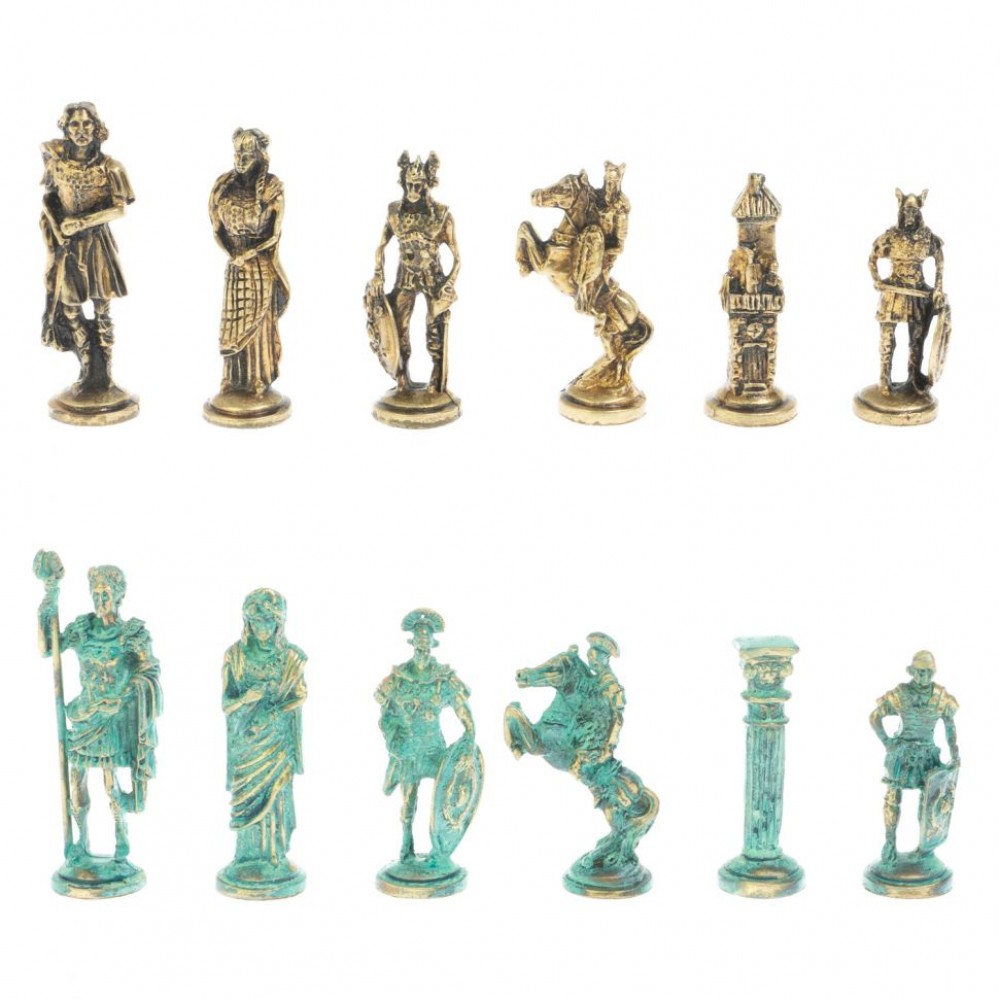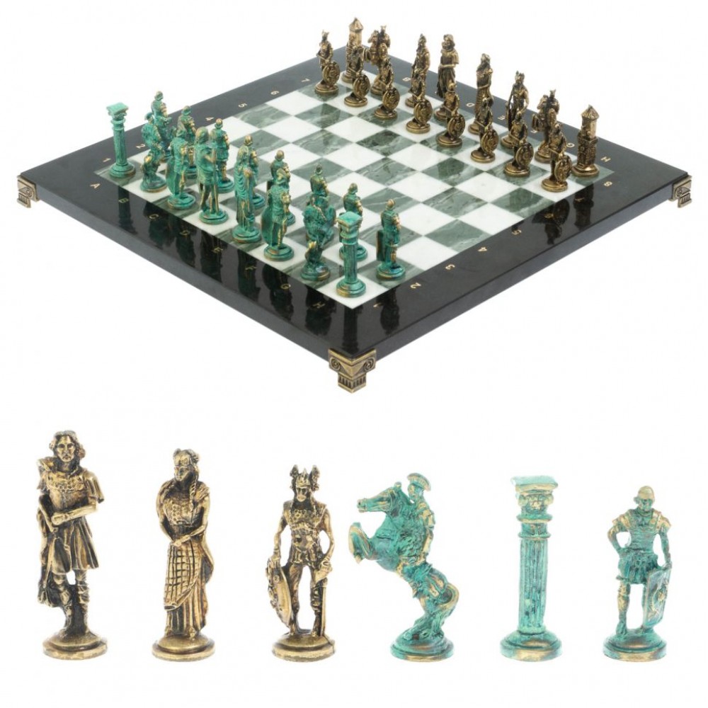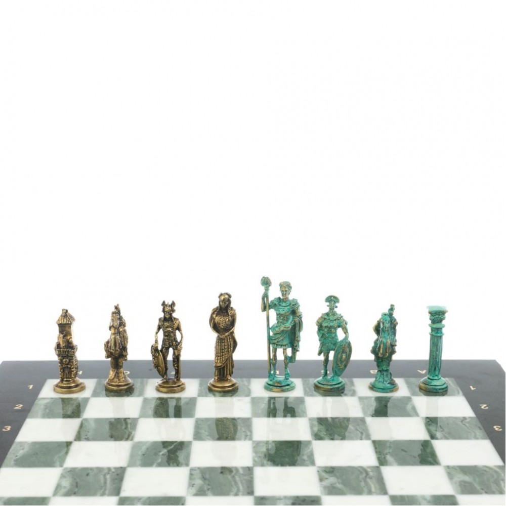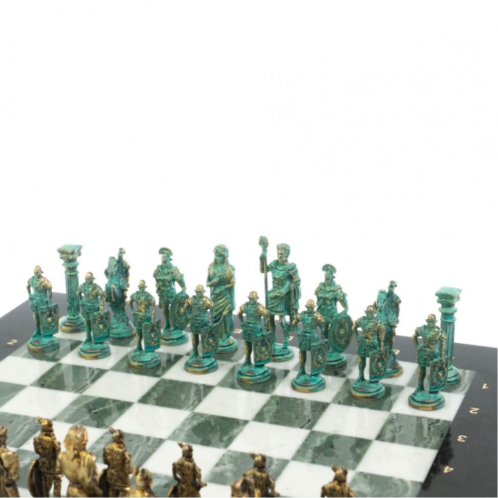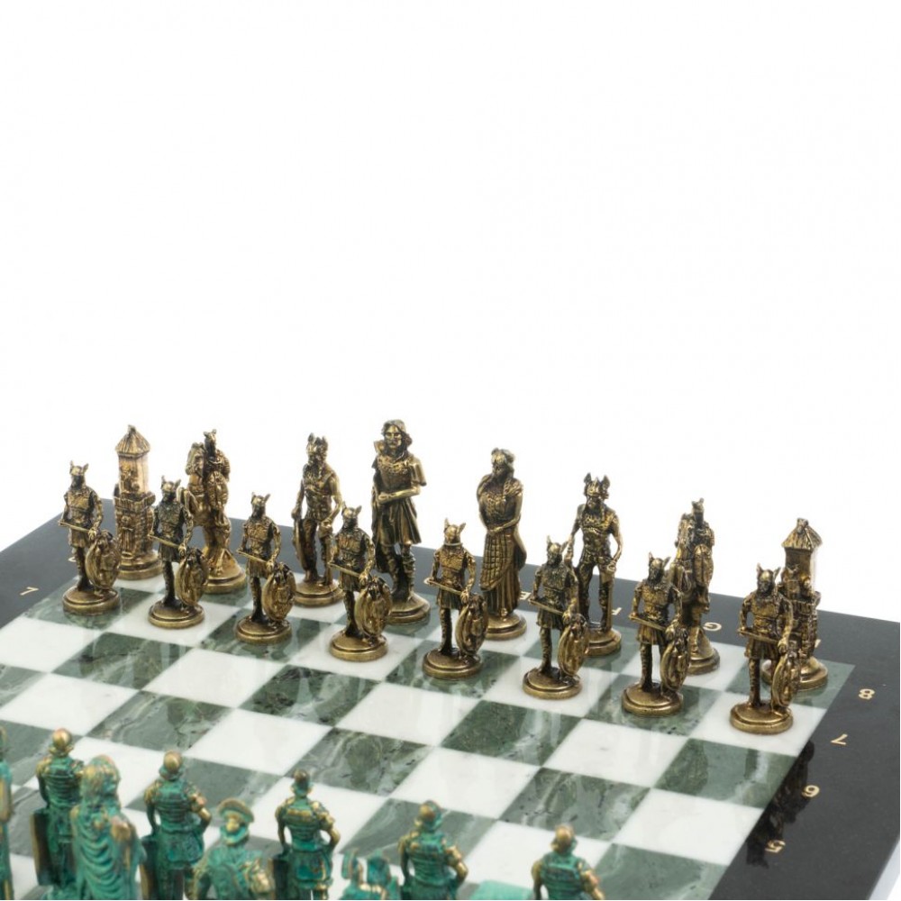 Шахматный набор "Римляне против Галлов" изготовлен вручную, доска из натурального камня, фигуры из металла в цвете бронза и патина.