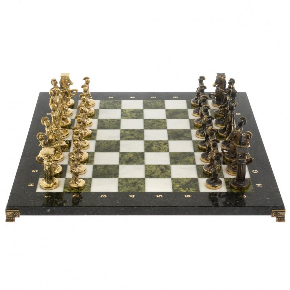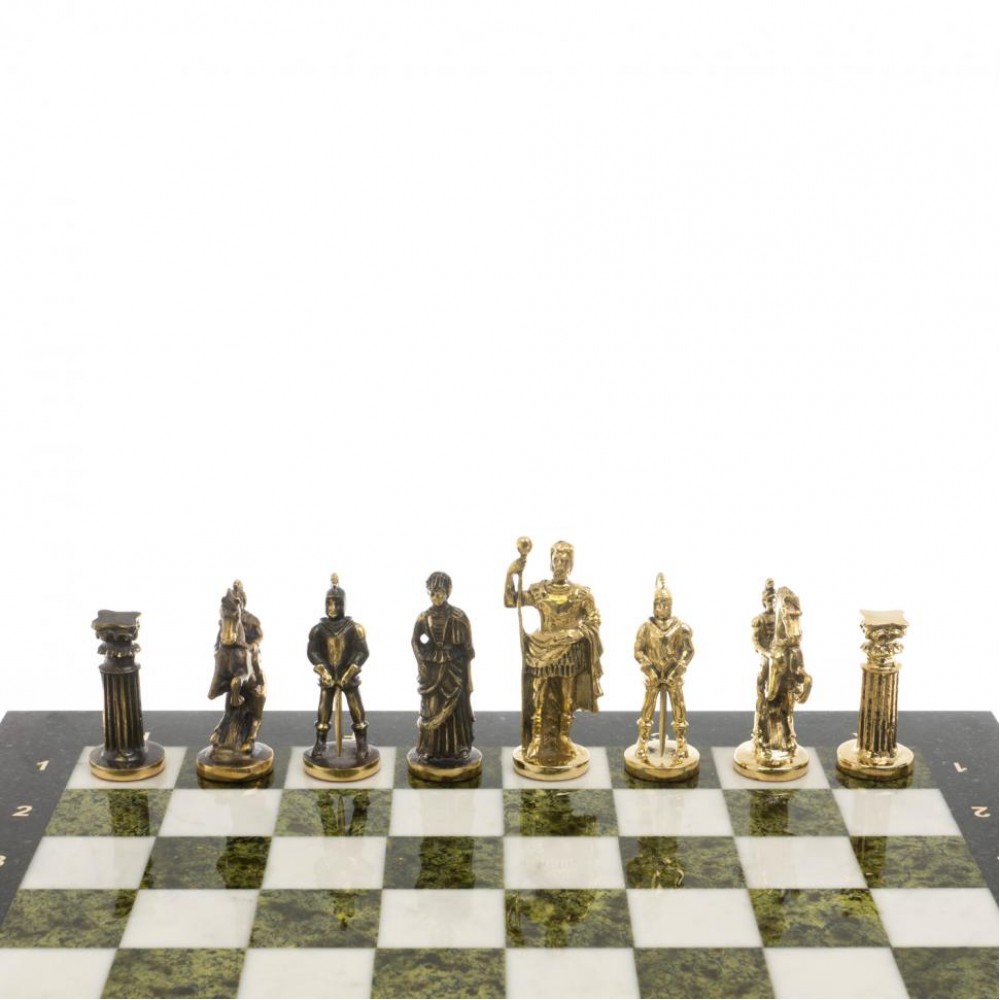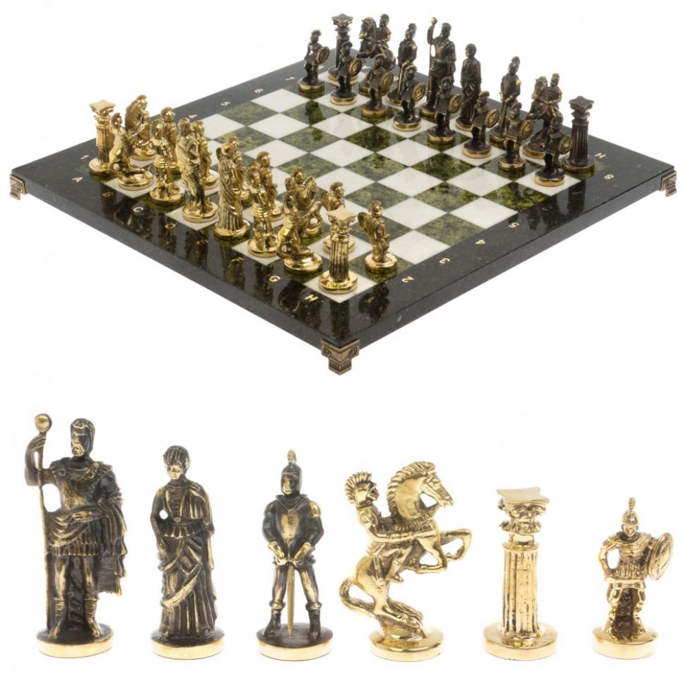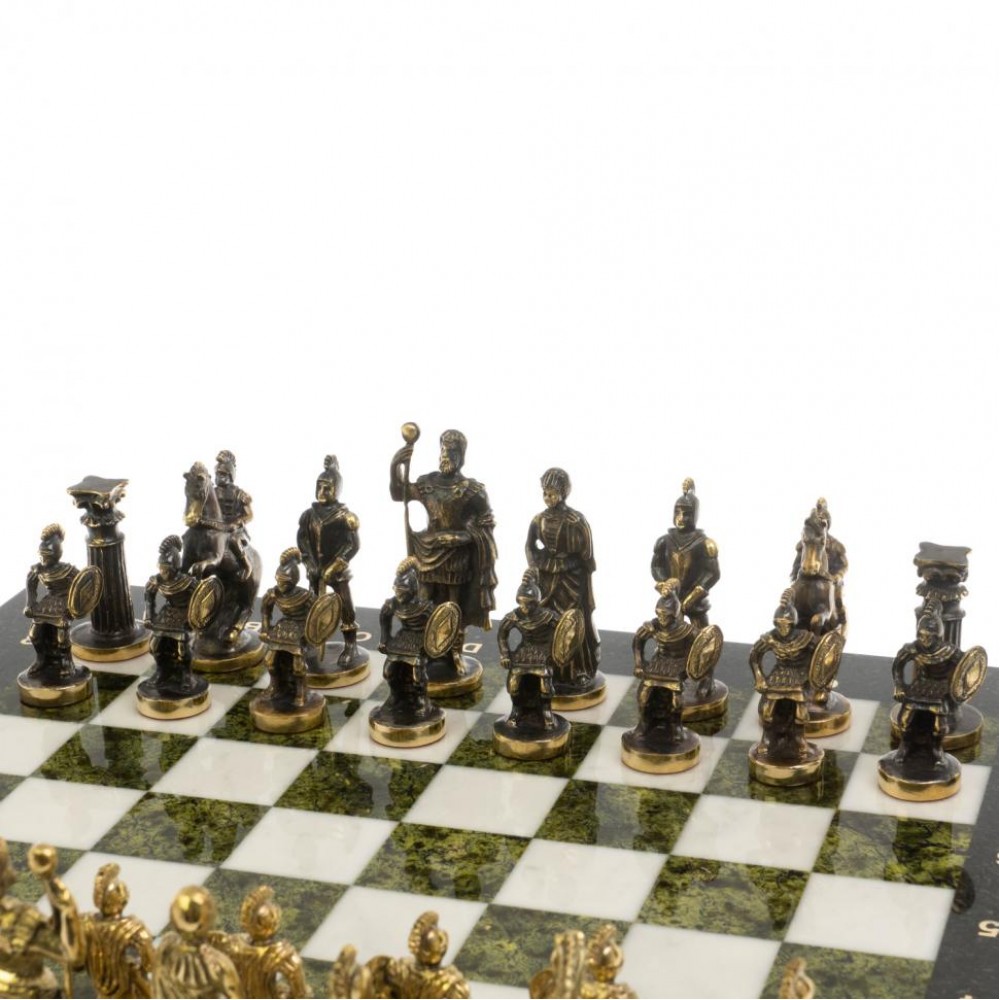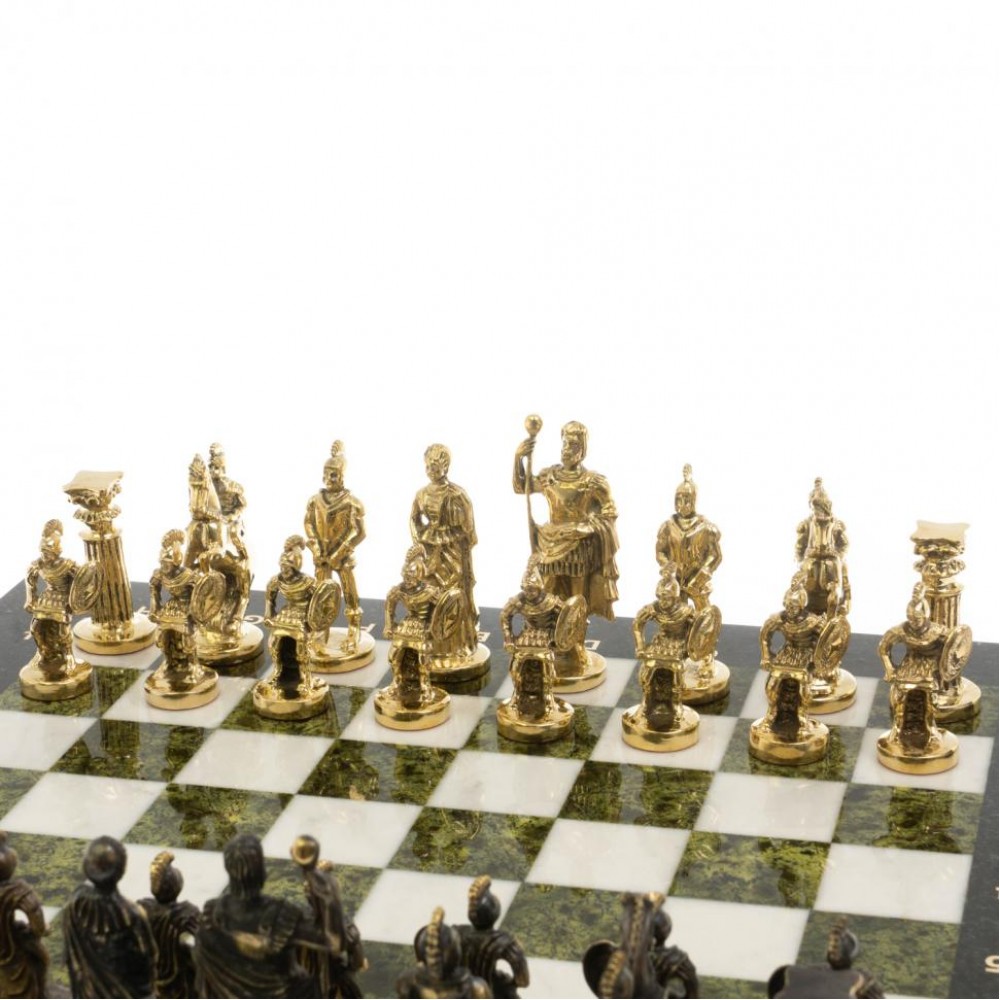 Шахматы "Римские" бронза 44х44 см из мрамора и змеевика размером доска 44х44х3 см, клетка 4,5х4,5 см, высота фигур: пешка 5,5 см, король 9 см и весом 15000 г.