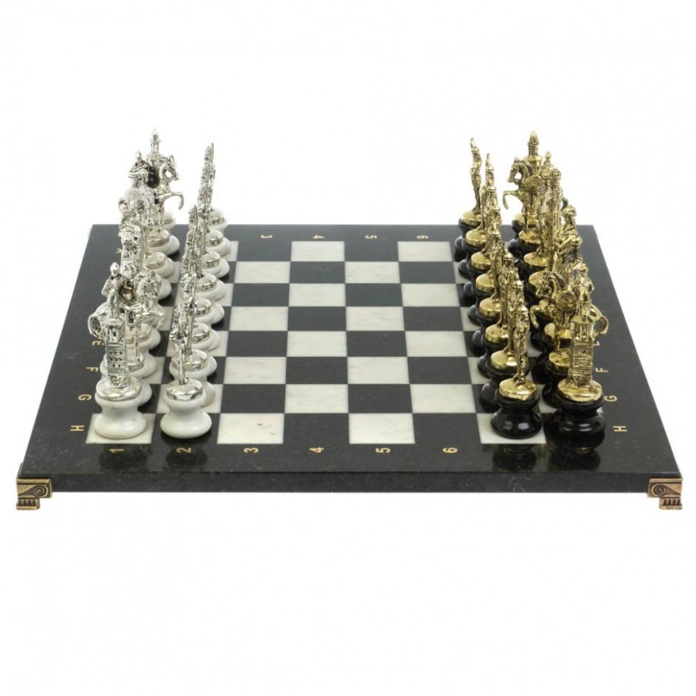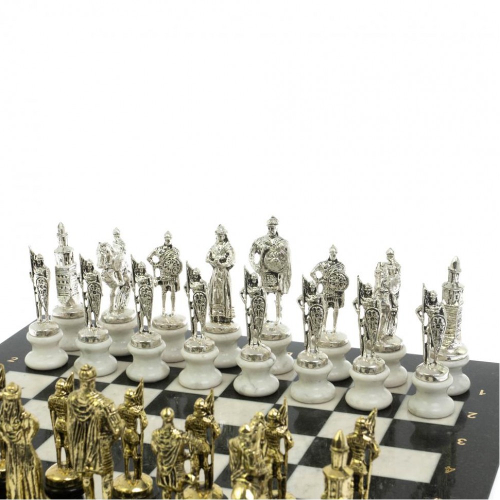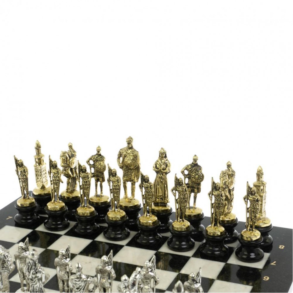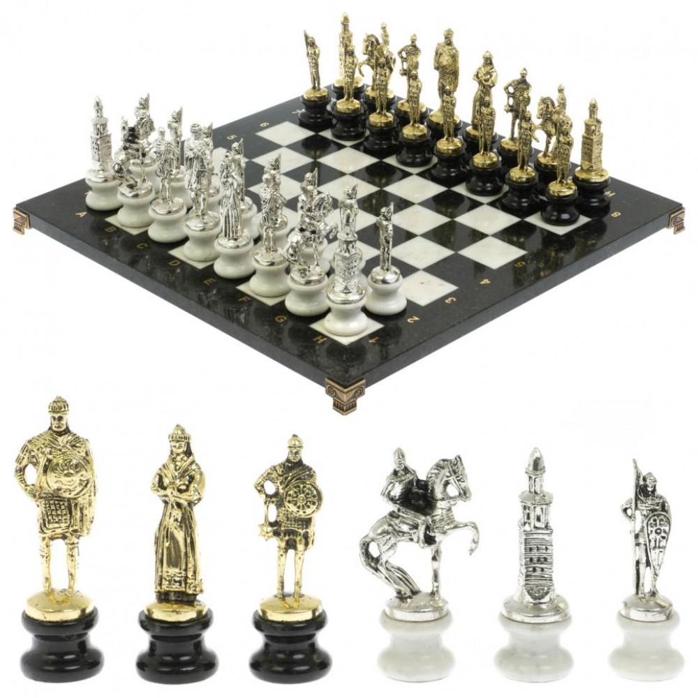 Шахматы "Русь" из мрамора и змеевика на каменных подставках 44х44 см размером доска 44х44х3 см, клетка 4,5х4,5 см, размер фигур: пешка 3,5х9,5 см, король 3,5х12 см. и весом 13500 г.