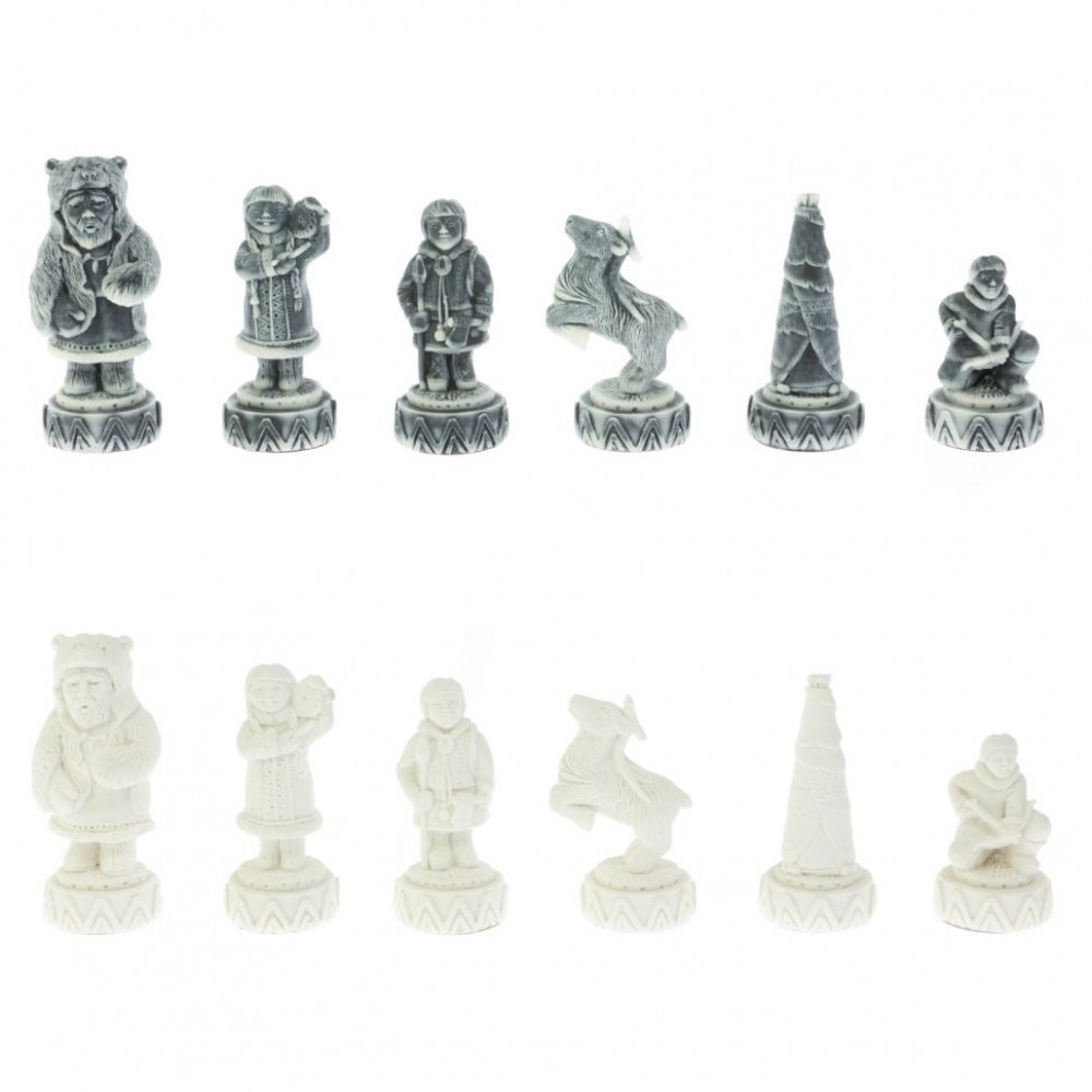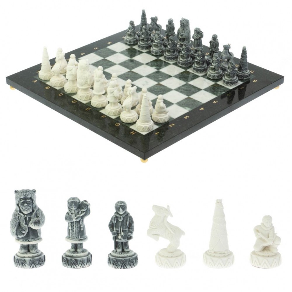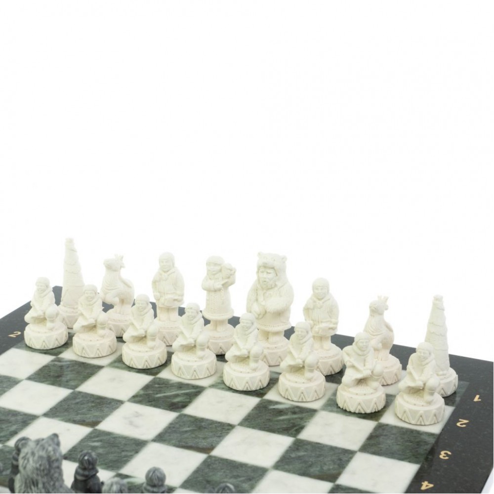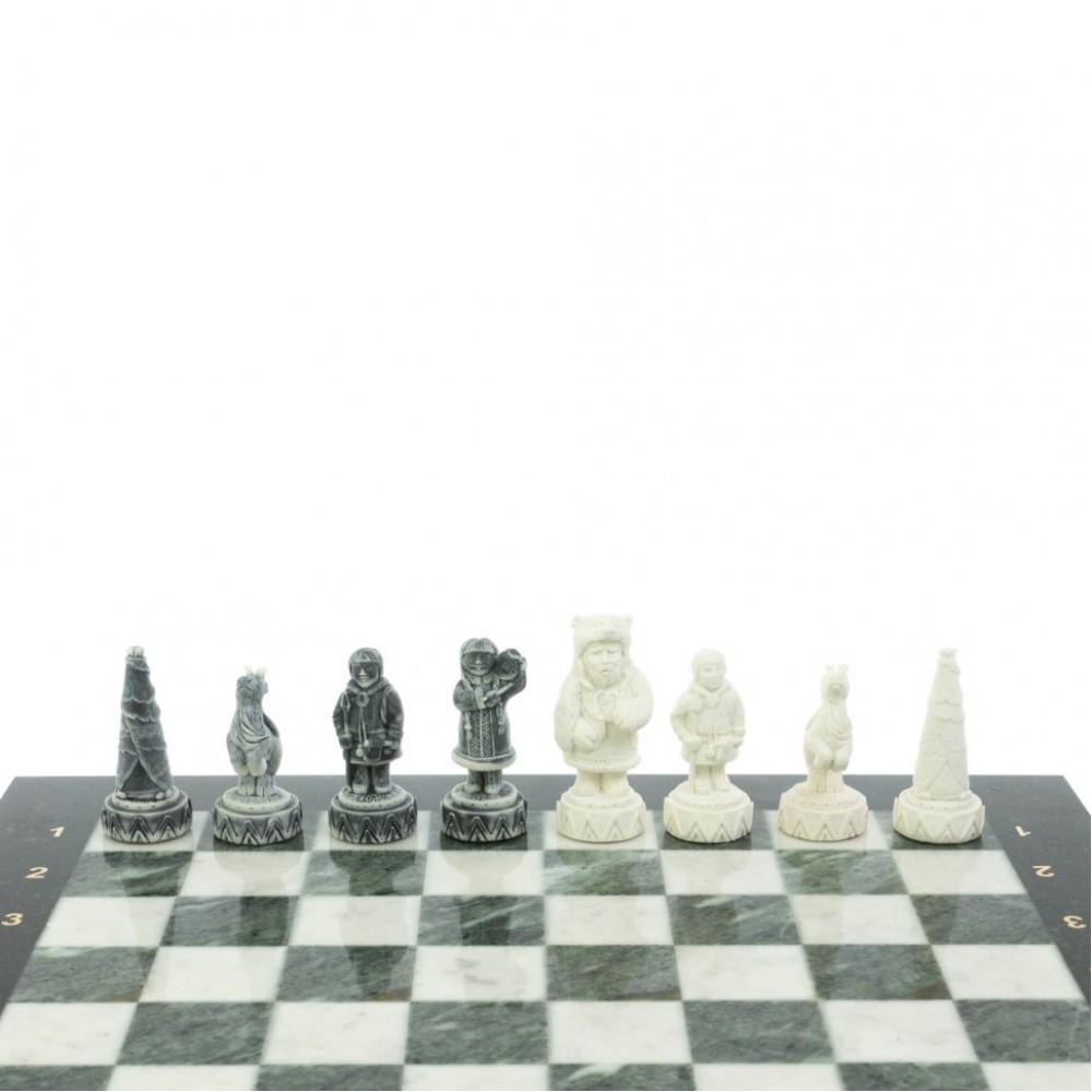 Шахматы "Северные народы" доска 40х40 см шабровский змеевик мрамор размером доска 40х40х2,5 см, клетка 4х4 см, высота фигур 5-8 см и весом 7500 г.