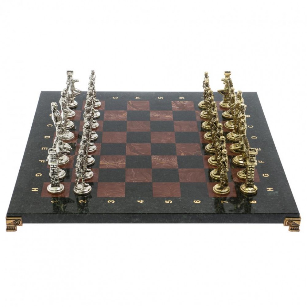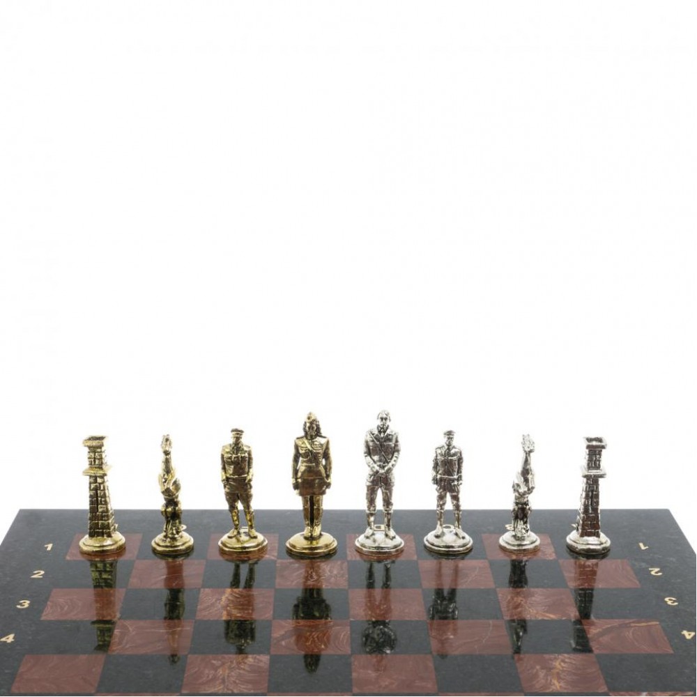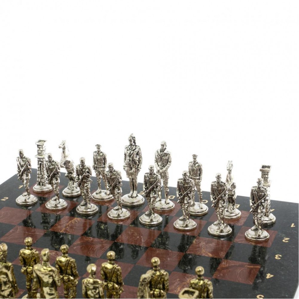 Эксклюзивные исторические шахматы – новинка в нашем интернет-магазине. Шахматные фигуры в золотом цвете – советские войска во главе Иосифом Сталиным, с другой стороны в серебряном цвете – немецкие войска во главе с Адольфом Гитлером. Фигуры из металла с высокой степенью детализации игровых персонажей. Доска изготовлена из натурального змеевика и лемезита. В комплекте подарочный кейс.